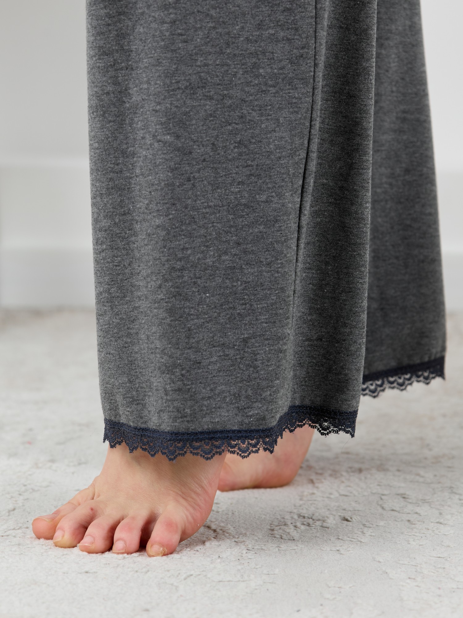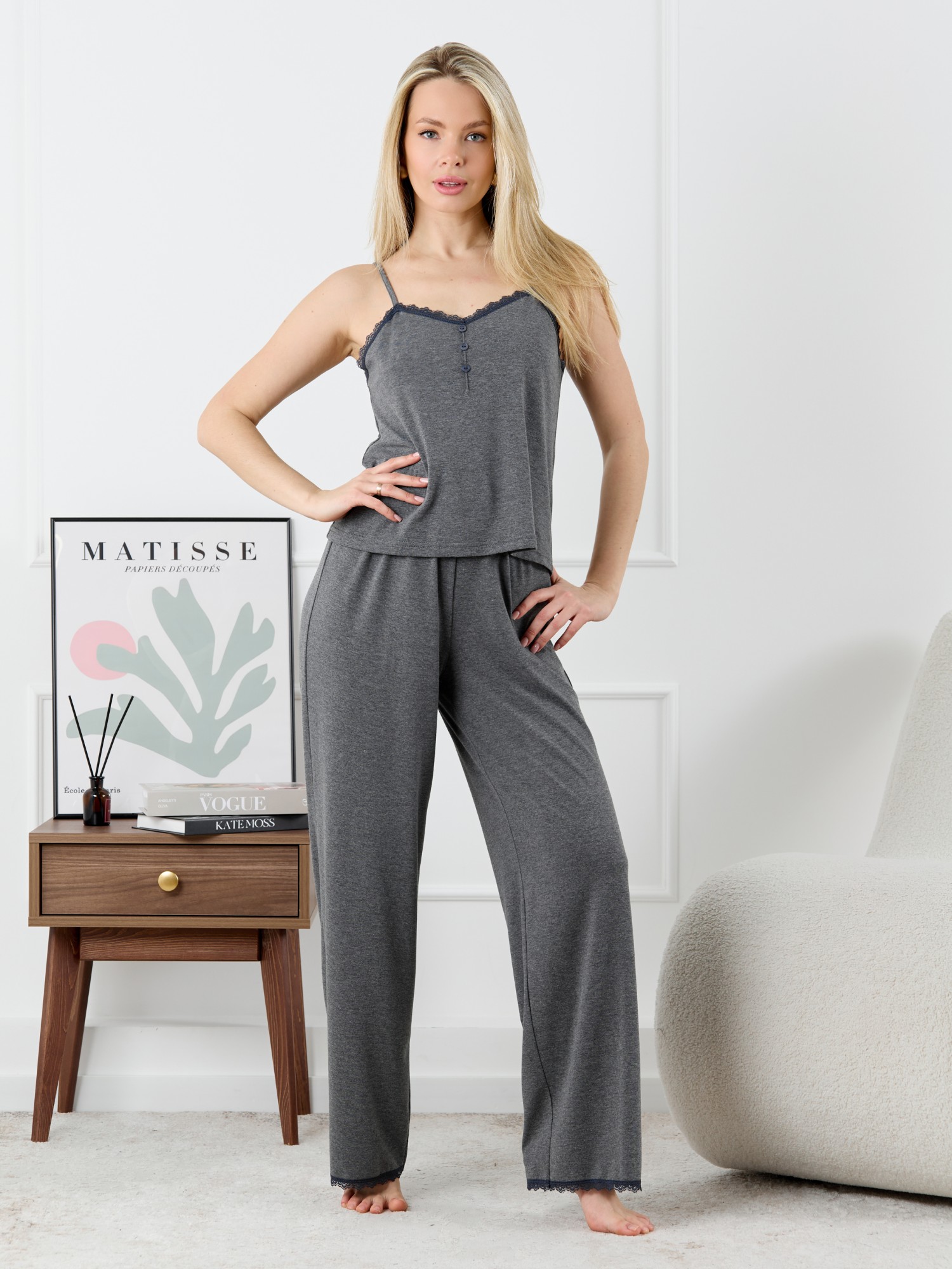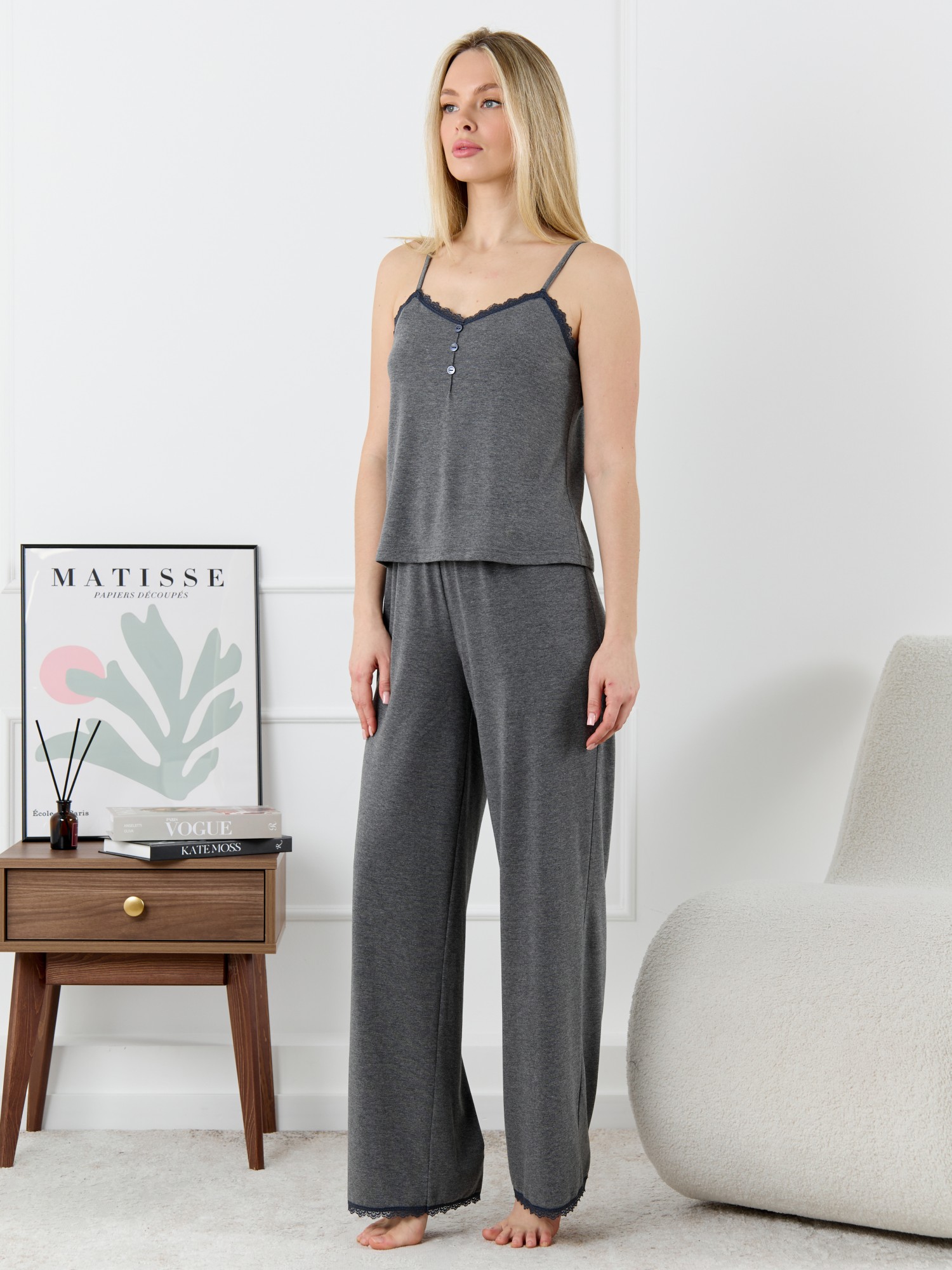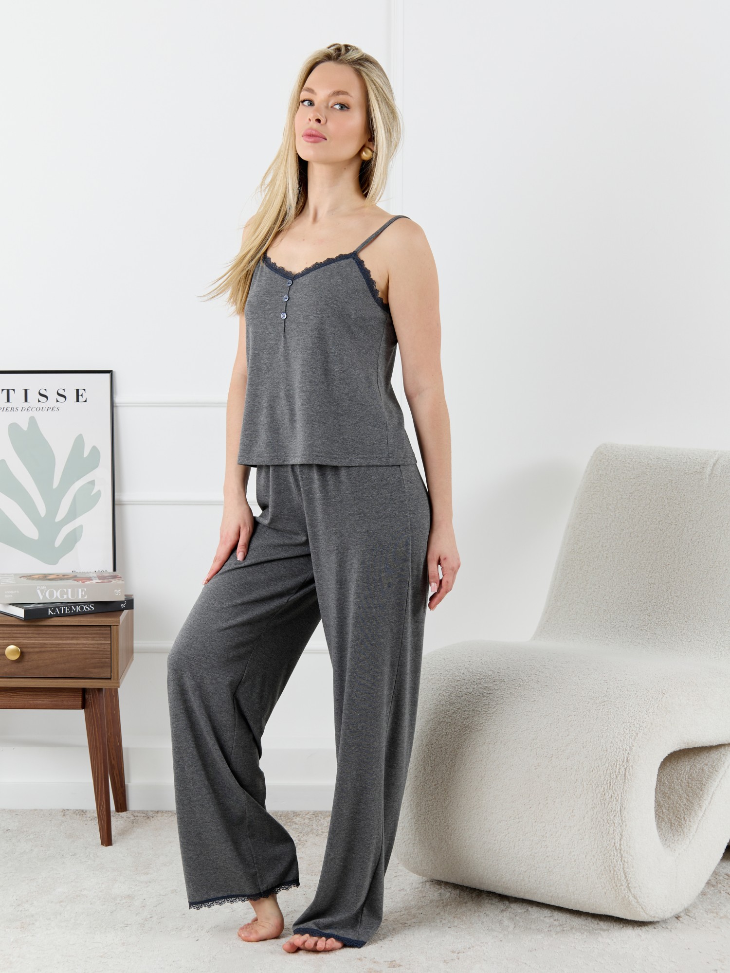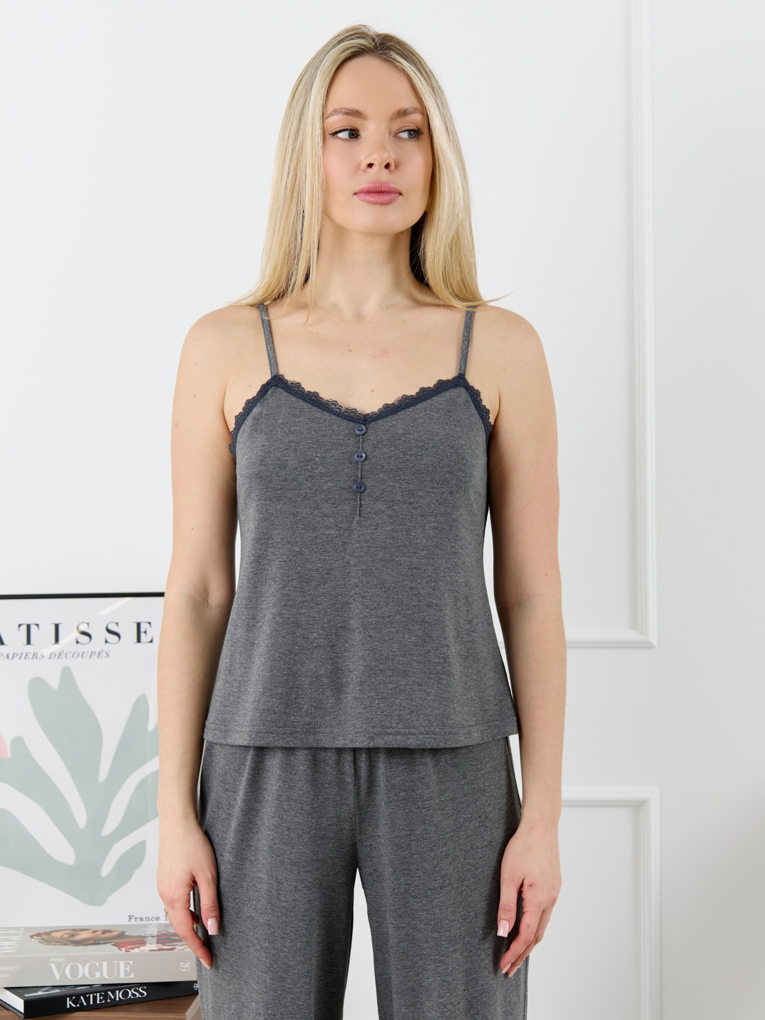 Пижама молодежная из трикотажного полотна «кулирка» с набивным рисунком, состоящая из майки - топа и шорт. Майка-топ – слегка расширенная книзу, на узких бретелях, вытачанных из окантовки. Для регулирования длины бретелей предусмотрены пластмассовые кольца-держатели и фиксаторы. По центру переда застрочен «защип» и пришиты три декоративные пуговицы имитирующие застежку. Вырез горловины переда, спинки отделаны кружевом. Брюки – полуприлегающие, с эластичной тесьмой по талии и нижними срезами отделанными узким кружевом.
