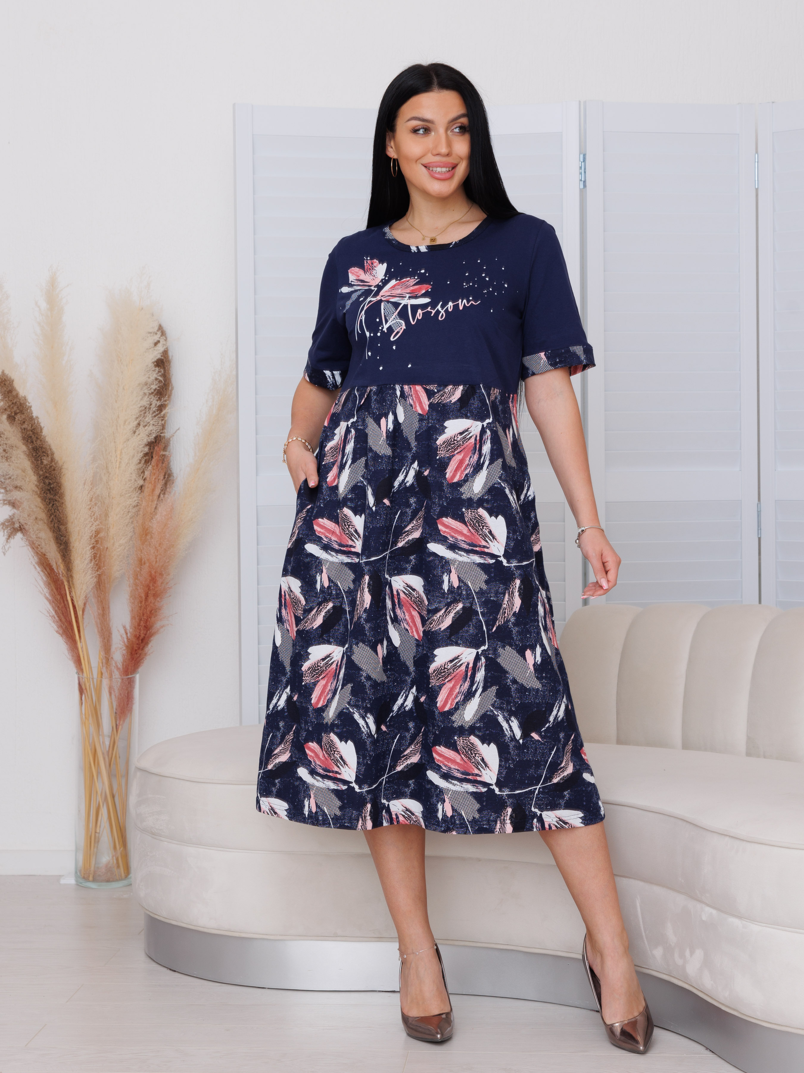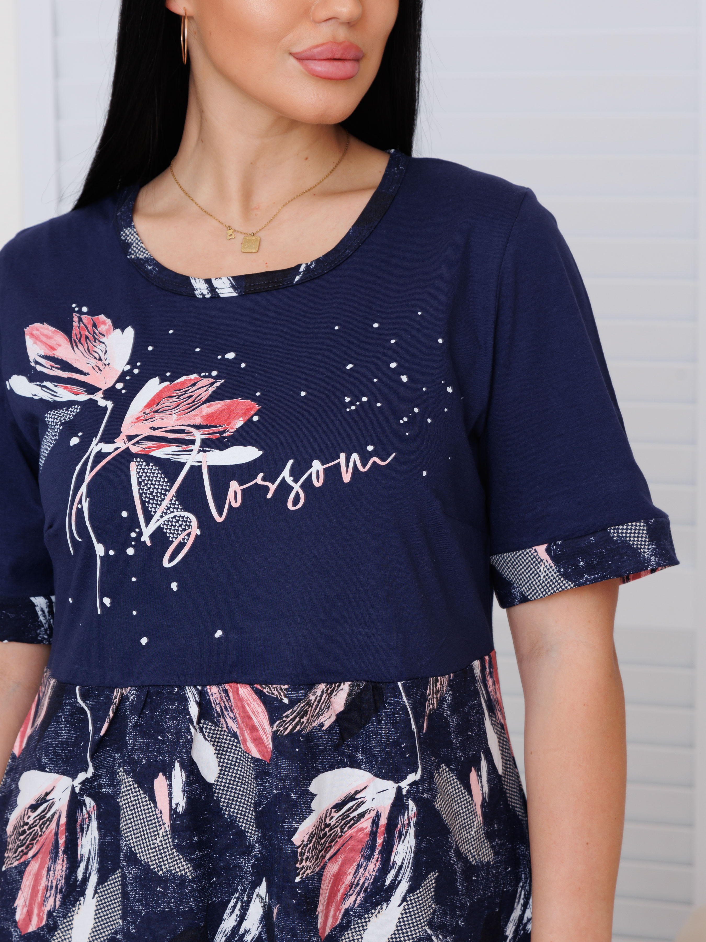 Женское платье Пл-167(К) / Темно-синий (розовые цветы) отшивается из трикотажного хлопкового полотна, кулирки. Женское летнее платье с короткими рукавами, из комбинированной ткани, средней длины.