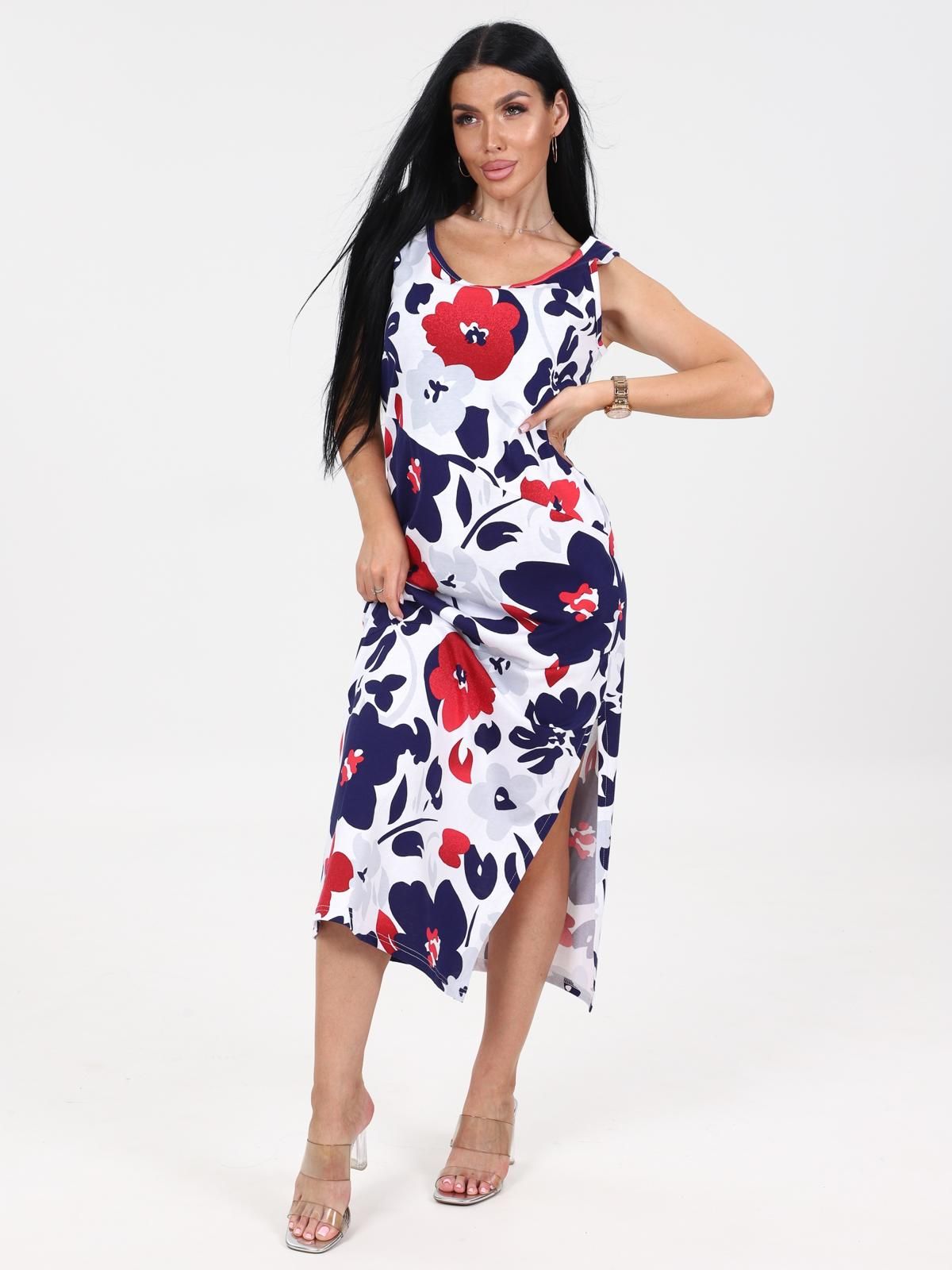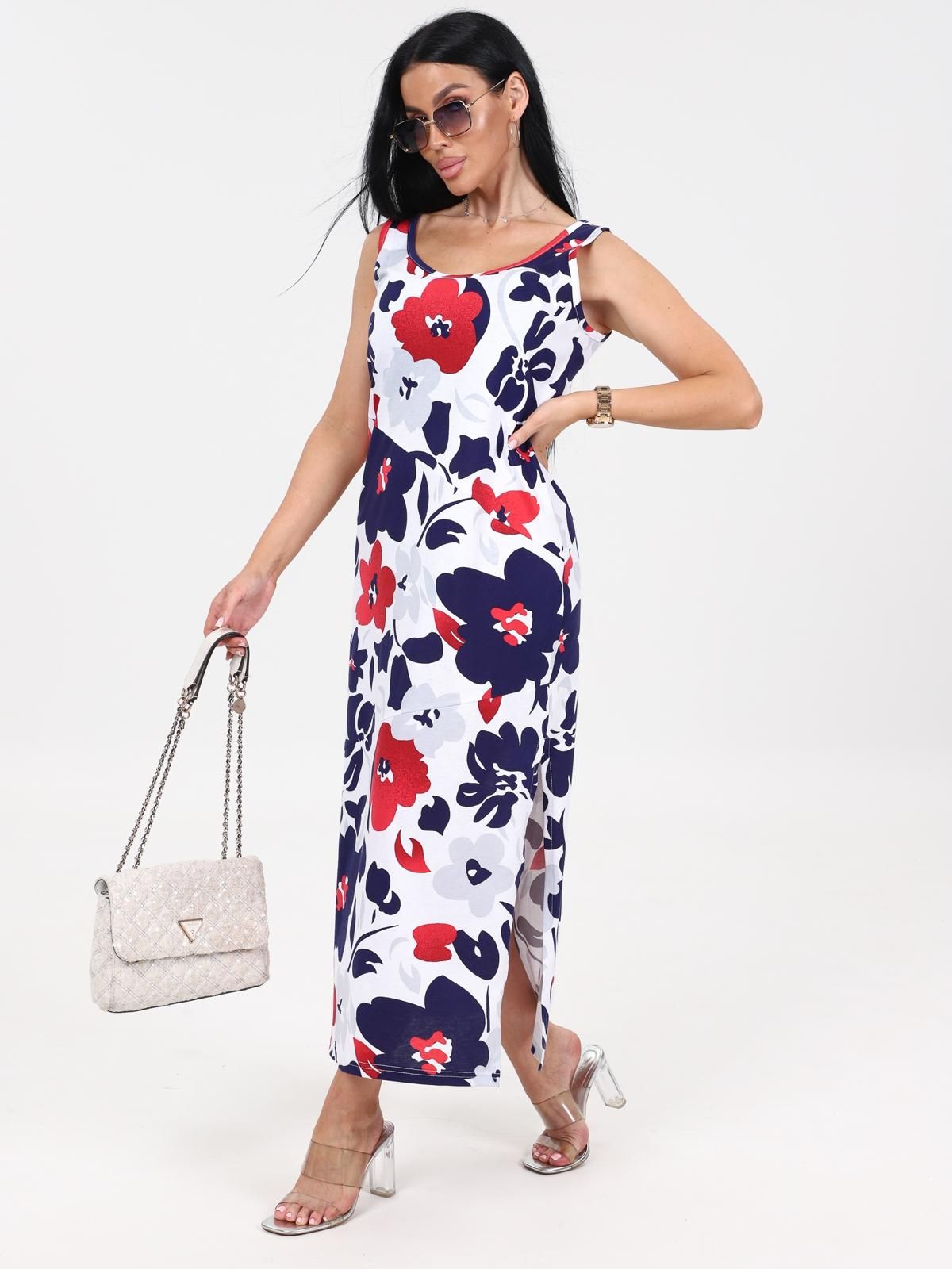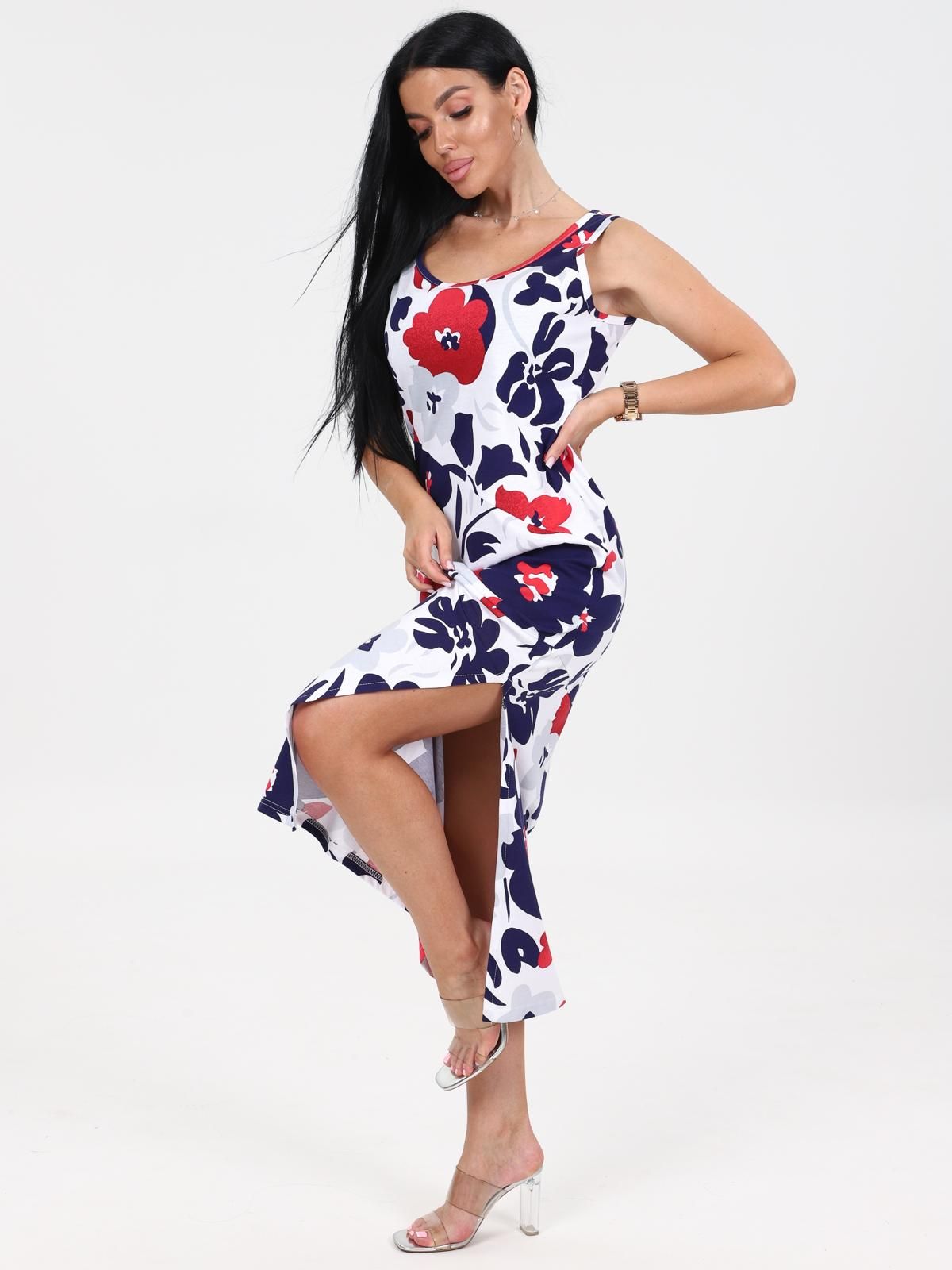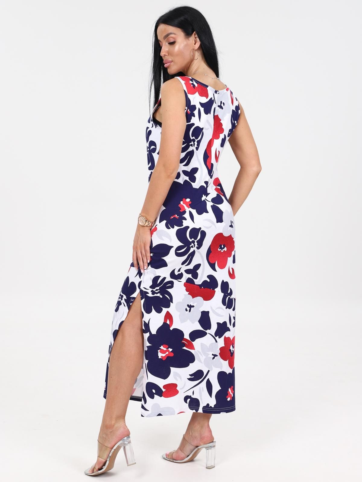 Платье женское "Мабель" из набивного трикотажного полотна "кулирка", удлиненное, полуприлегающего силуэта с круглым вырезом горловины без рукавов, с рельефными ассиметричными швами. Вырез горловины и проймы обработаны кантом из основной ткани. В левом боковом шве разрез.