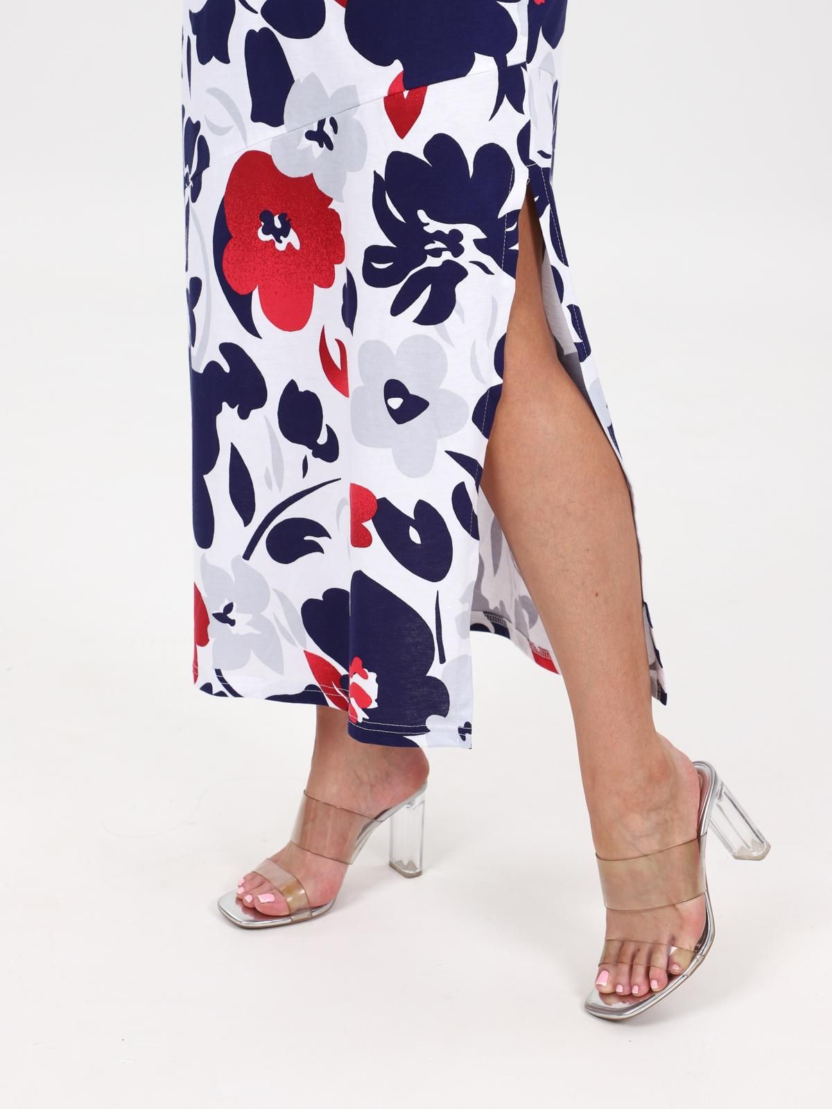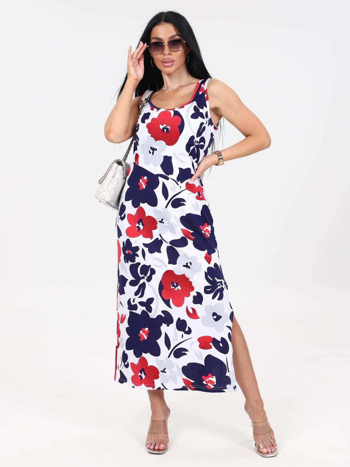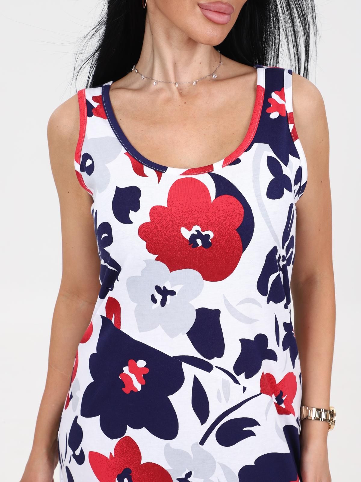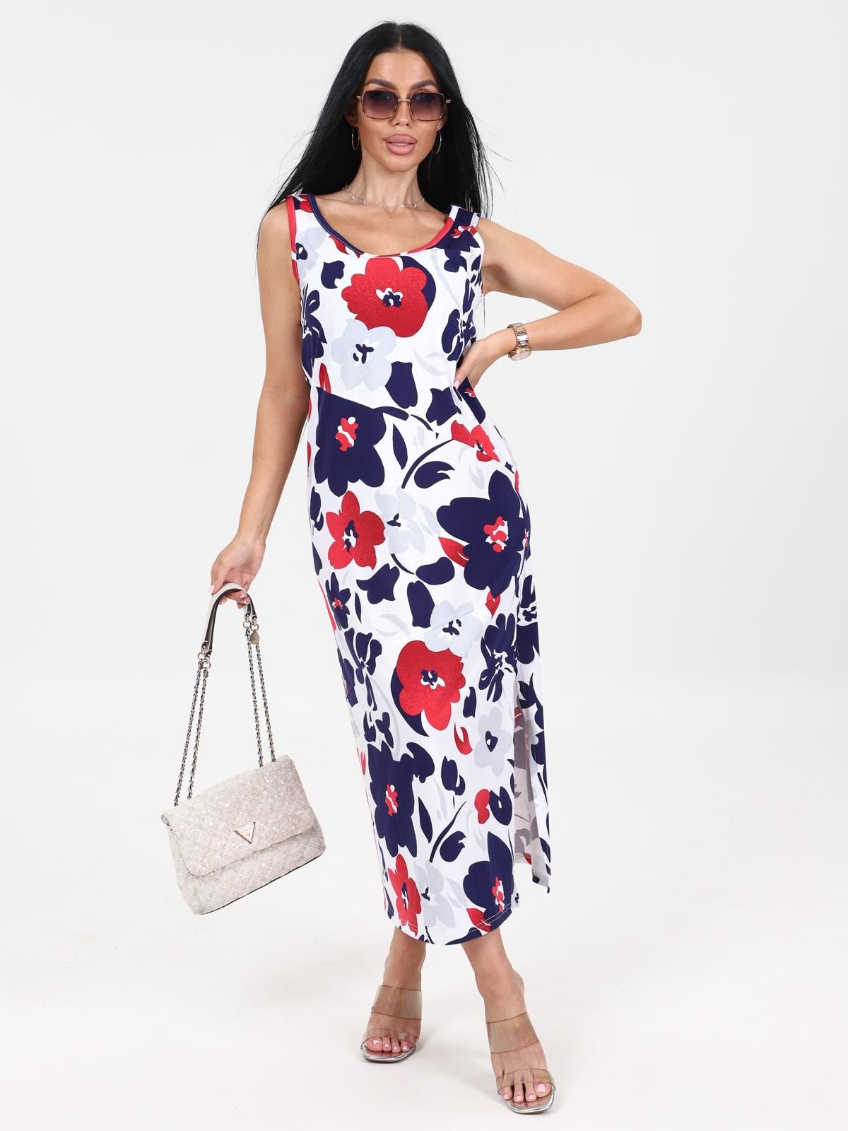 Платье женское "Мабель" из набивного трикотажного полотна "кулирка", удлиненное, полуприлегающего силуэта с круглым вырезом горловины без рукавов, с рельефными ассиметричными швами. Вырез горловины и проймы обработаны кантом из основной ткани. В левом боковом шве разрез.