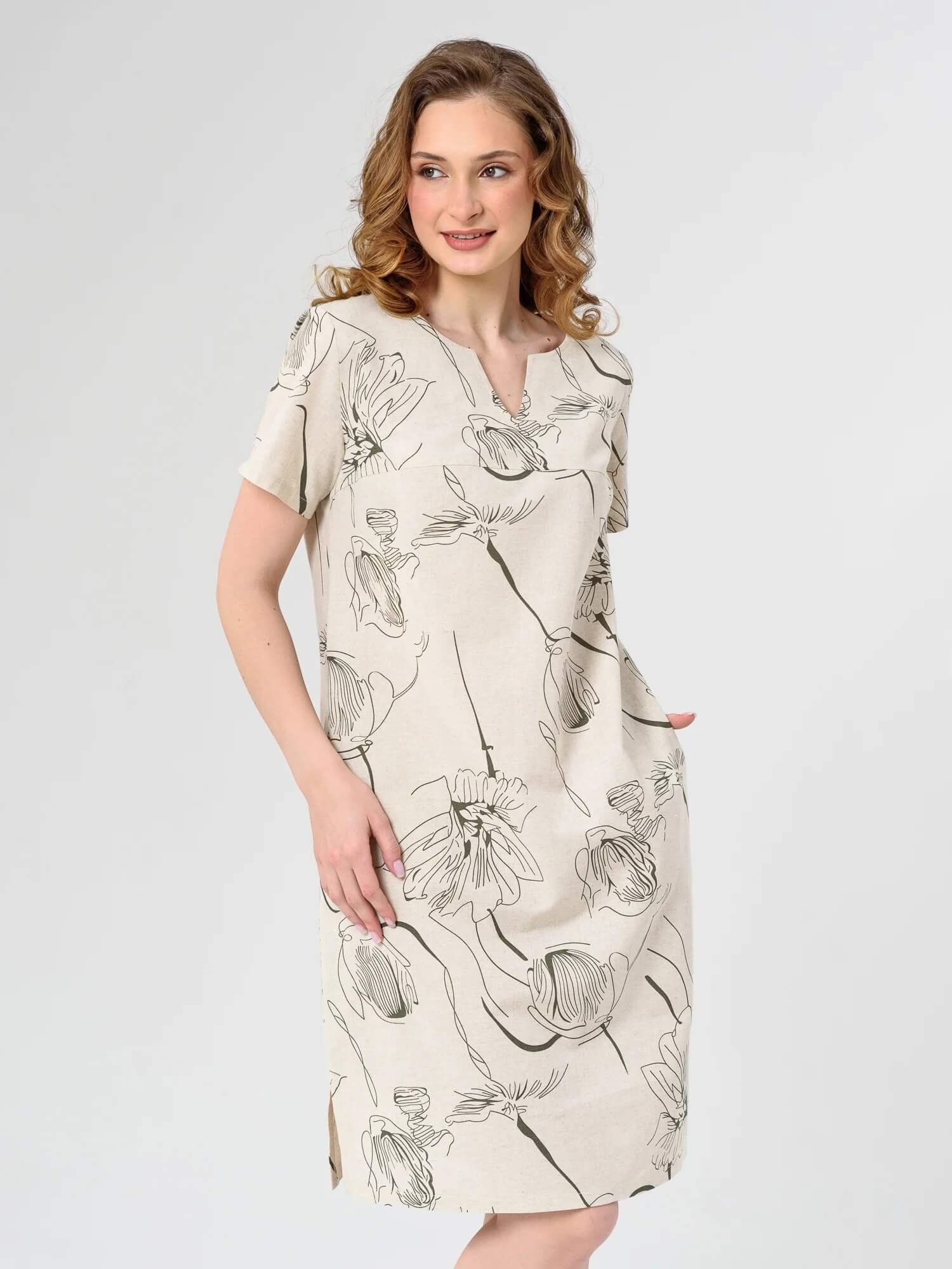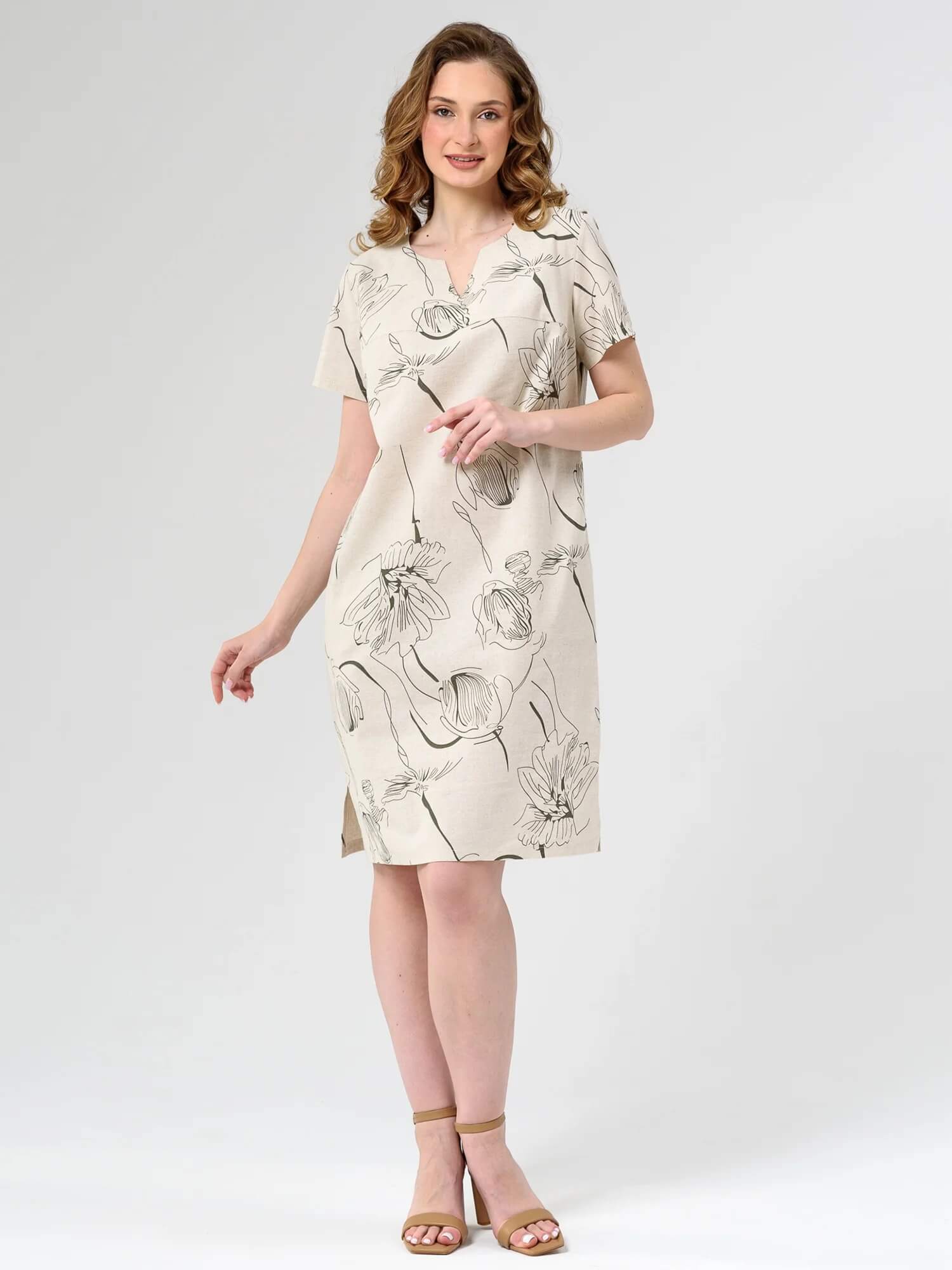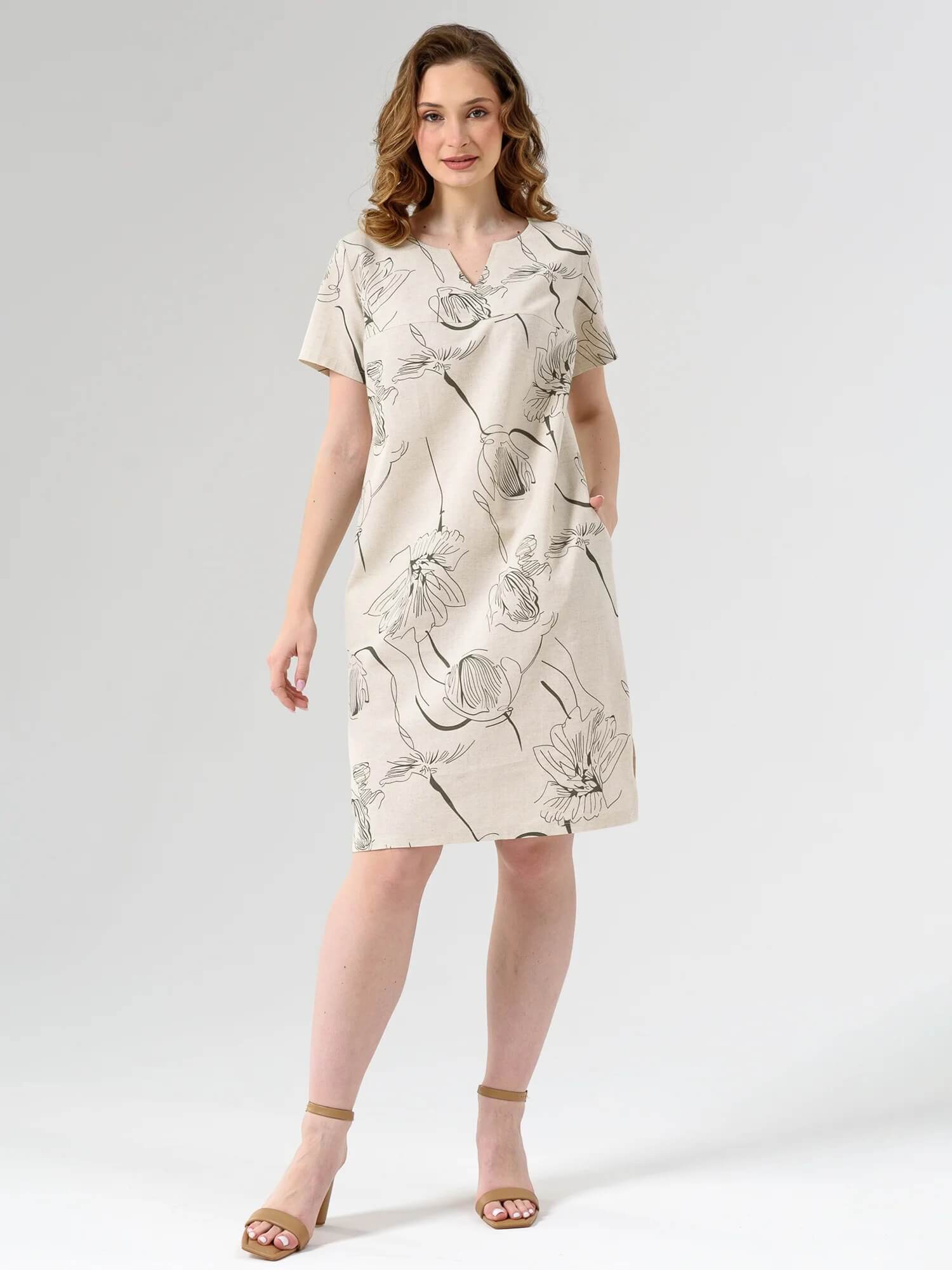 Платье летнее женское "Вологда" г/к 1929-П/л / Бежевый (тюльпаны) лен хлопок из набивной и однотонной ткани. Платье женское летнее офисное прямого силуэта базового покроя, с втачным коротким рукавом, без застёжки, длиной до колена. В боковых швах карманы. На полочке платья летнее женское лен хлопок отрезная кокетка по линии груди. Фигурная линия горловины обработана обтачкой, а на спинке окантовкой. Элегантное платье летнее женское лен хлопок прекрасно подойдёт для летних прогулок.