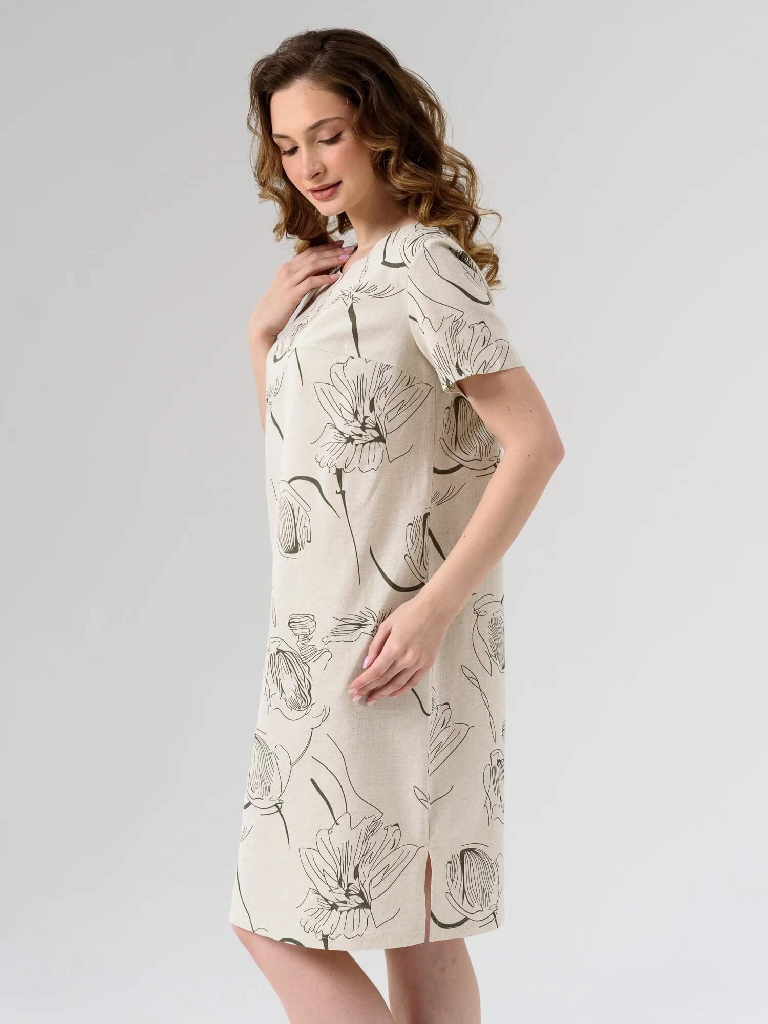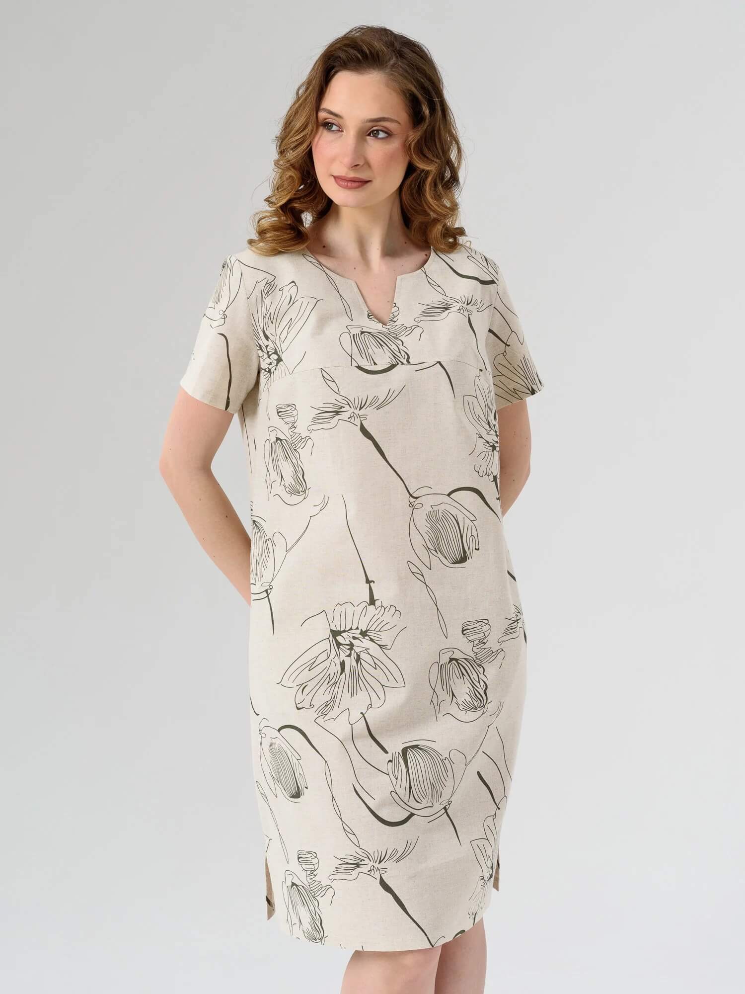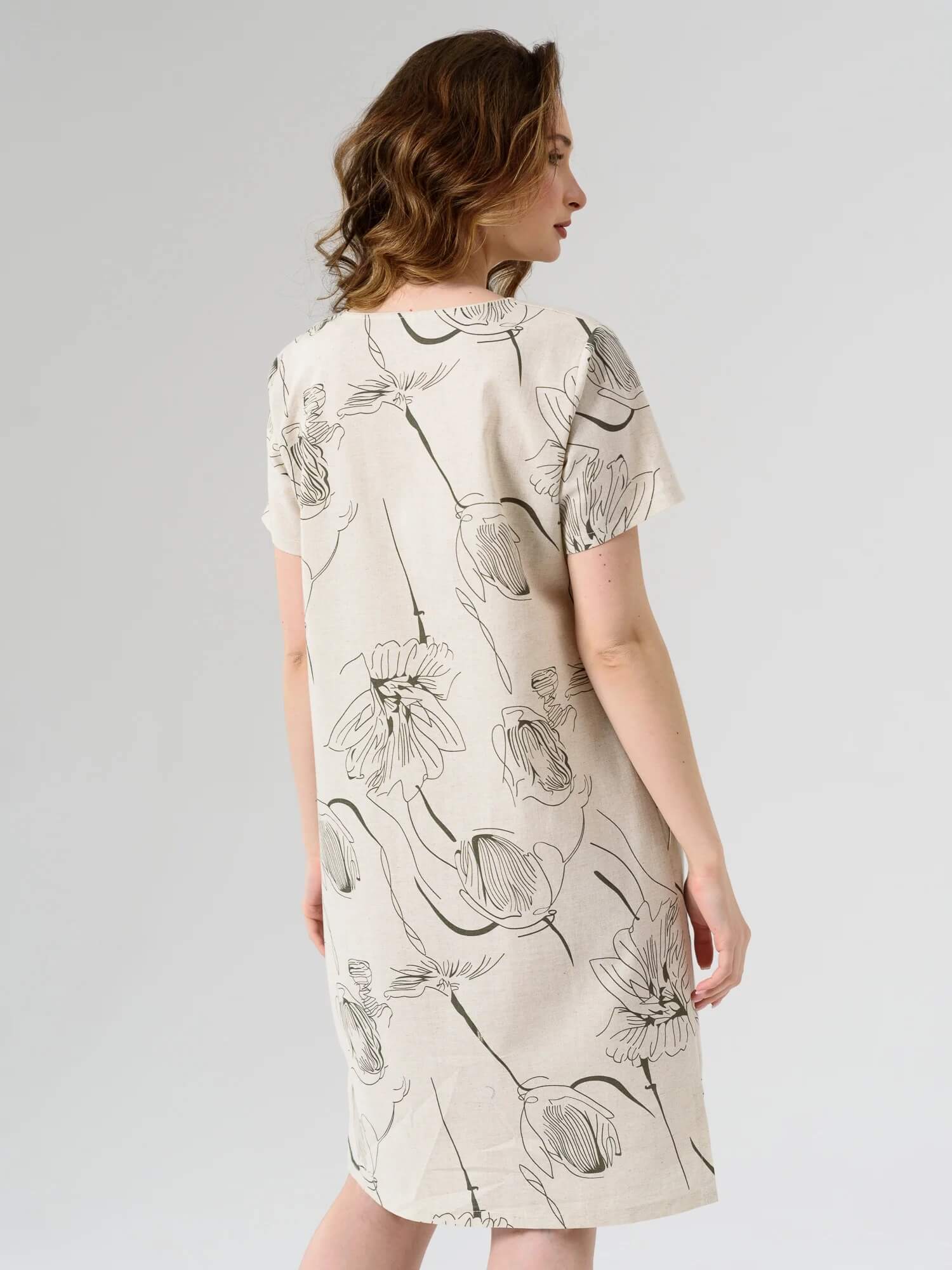 Платье летнее женское "Вологда" г/к 1929-П/л / Бежевый (тюльпаны) лен хлопок из набивной и однотонной ткани. Платье женское летнее офисное прямого силуэта базового покроя, с втачным коротким рукавом, без застёжки, длиной до колена. В боковых швах карманы. На полочке платья летнее женское лен хлопок отрезная кокетка по линии груди. Фигурная линия горловины обработана обтачкой, а на спинке окантовкой. Элегантное платье летнее женское лен хлопок прекрасно подойдёт для летних прогулок.
