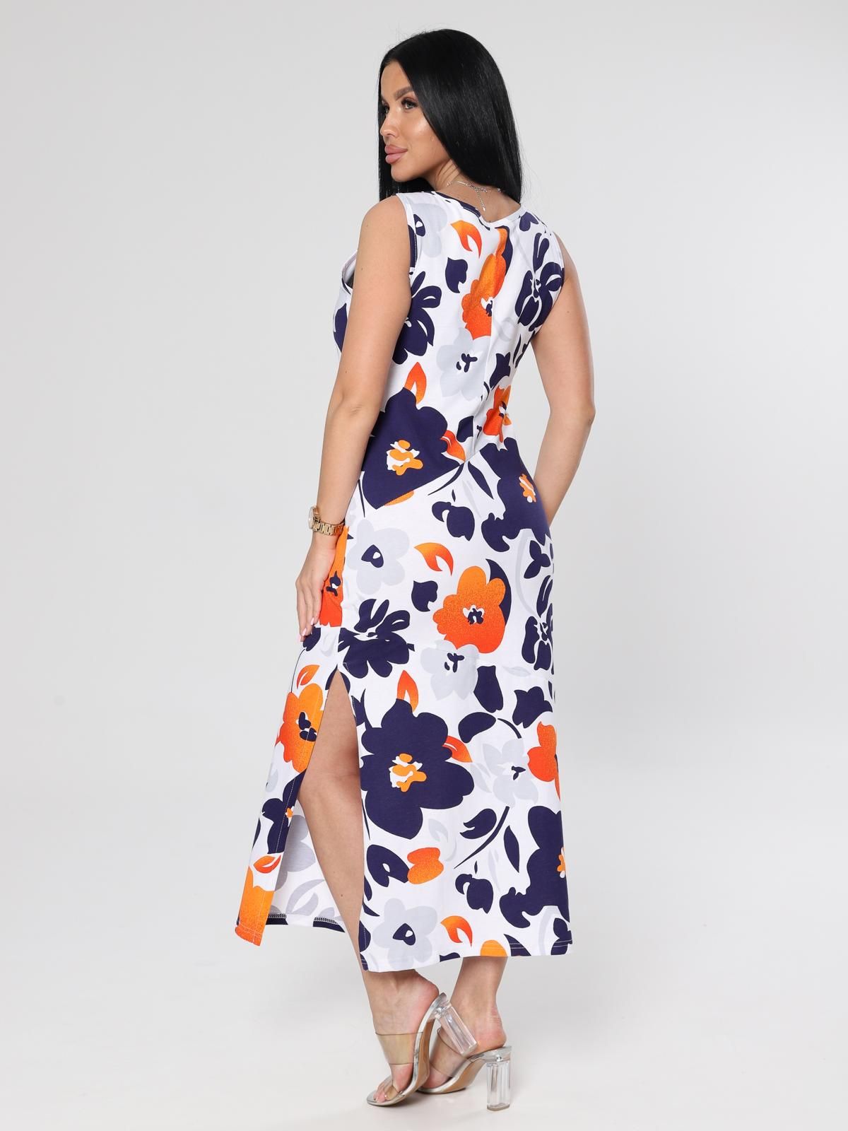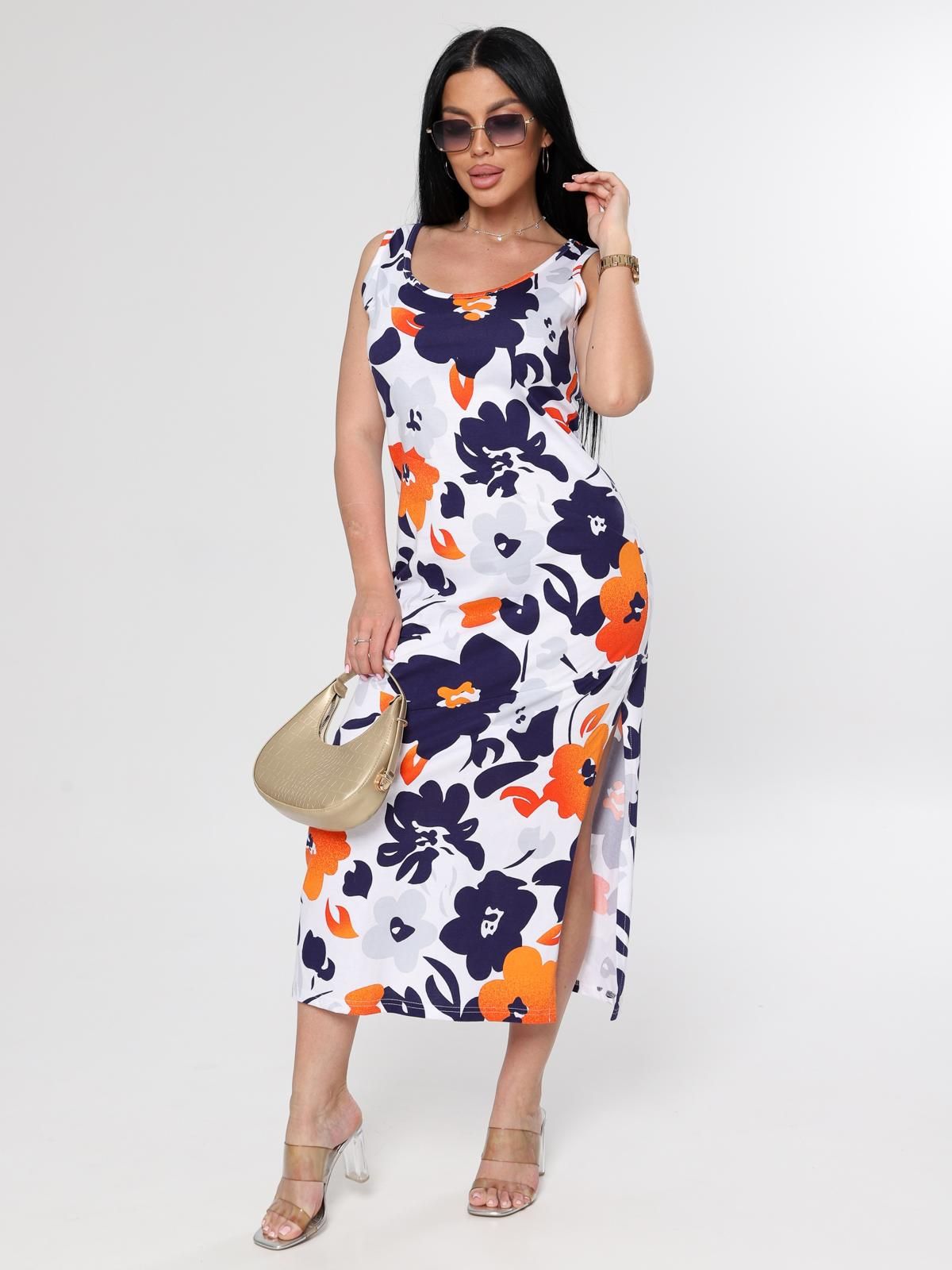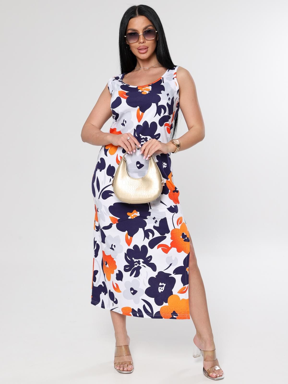 Платье женское "Мабель" из набивного трикотажного полотна "кулирка", удлиненное, полуприлегающего силуэта с круглым вырезом горловины без рукавов, с рельефными ассиметричными швами. Вырез горловины и проймы обработаны кантом из основной ткани. В левом боковом шве разрез.