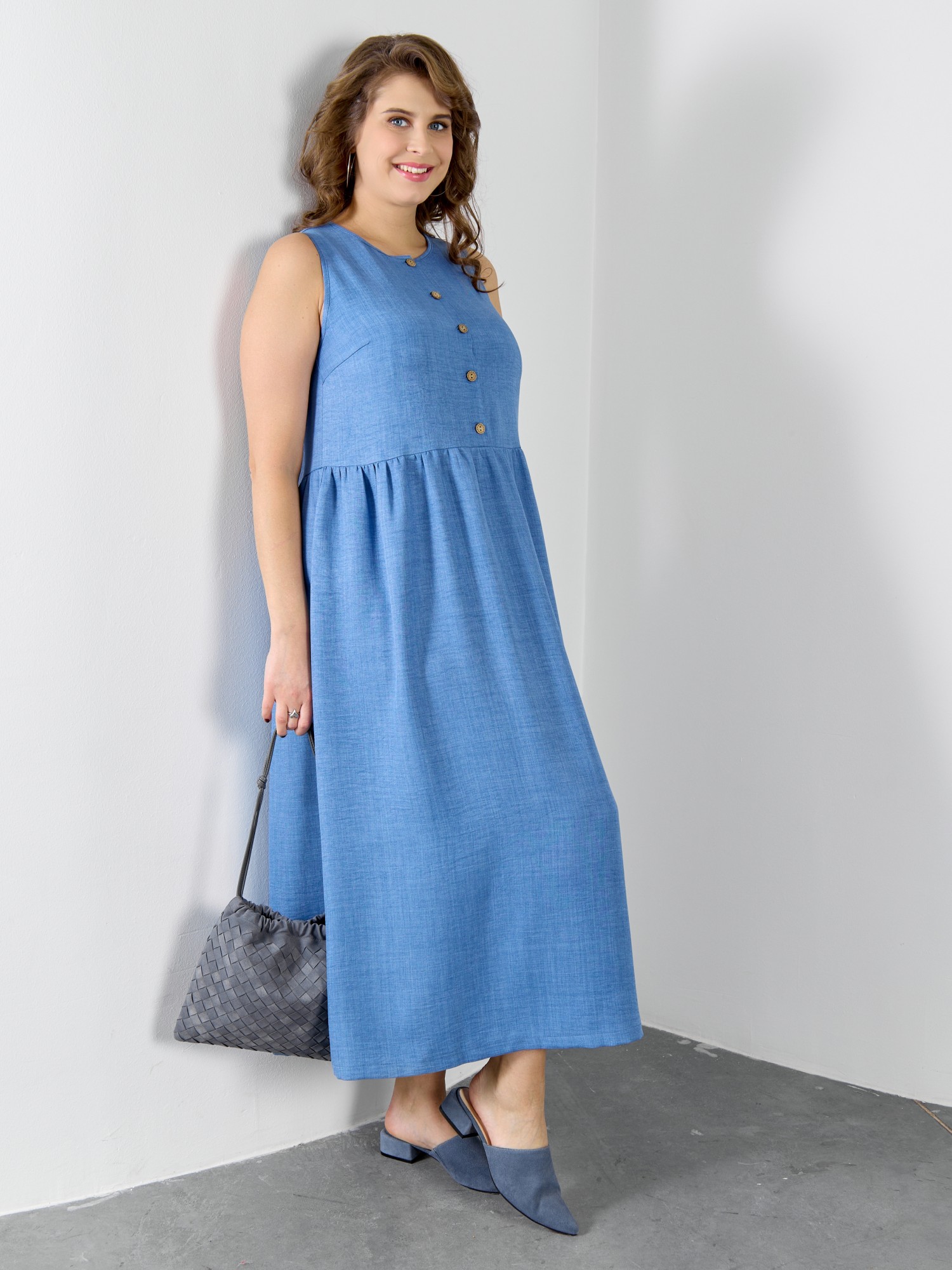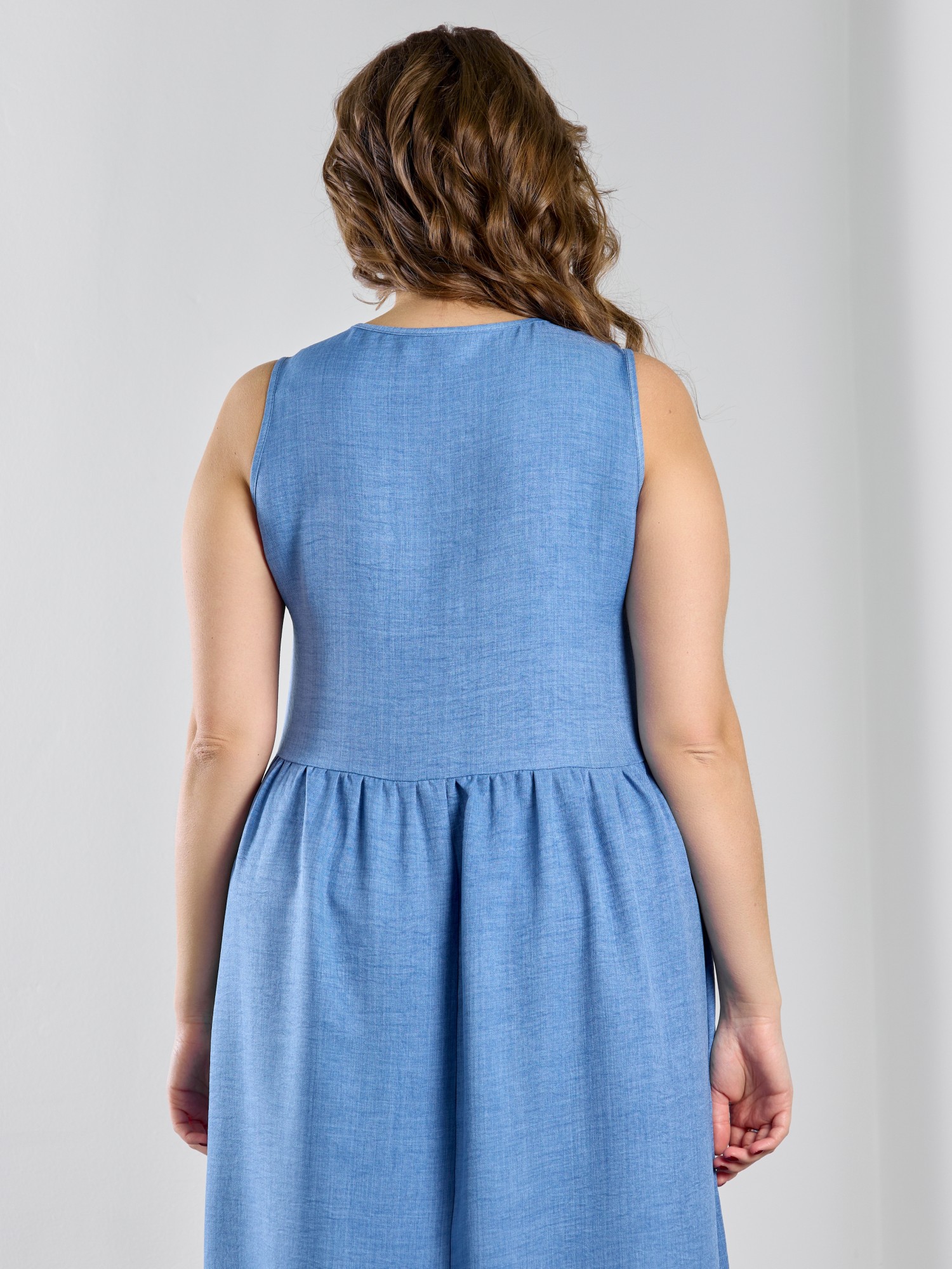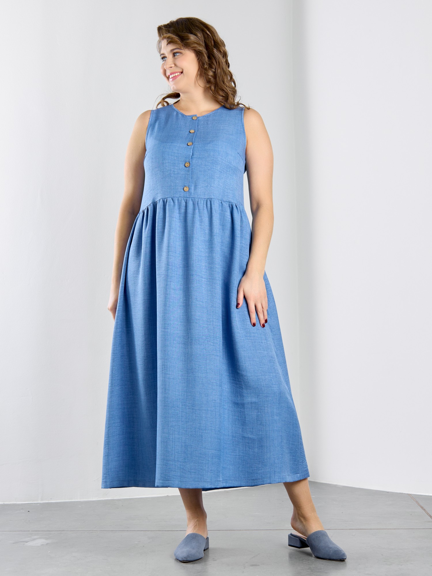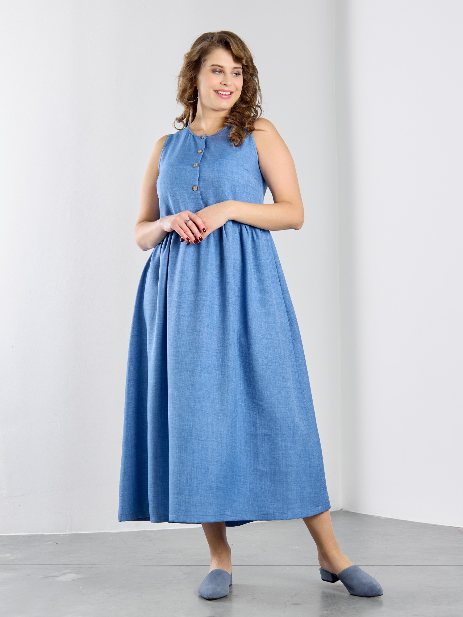 Платье женское из гладкокрашеного тканого полотна, отрезное по линии талии, длинное, без рукавов, с горловиной овальной формы и центральной бортовой застежкой по лифу на петли и пуговицы. Юбка присборена по шву стачивания с лифом, горловина и проймы окантованы основным материалом.