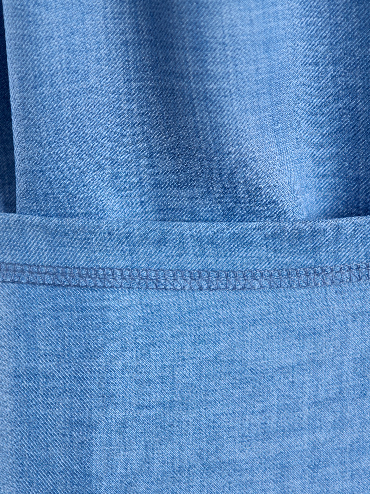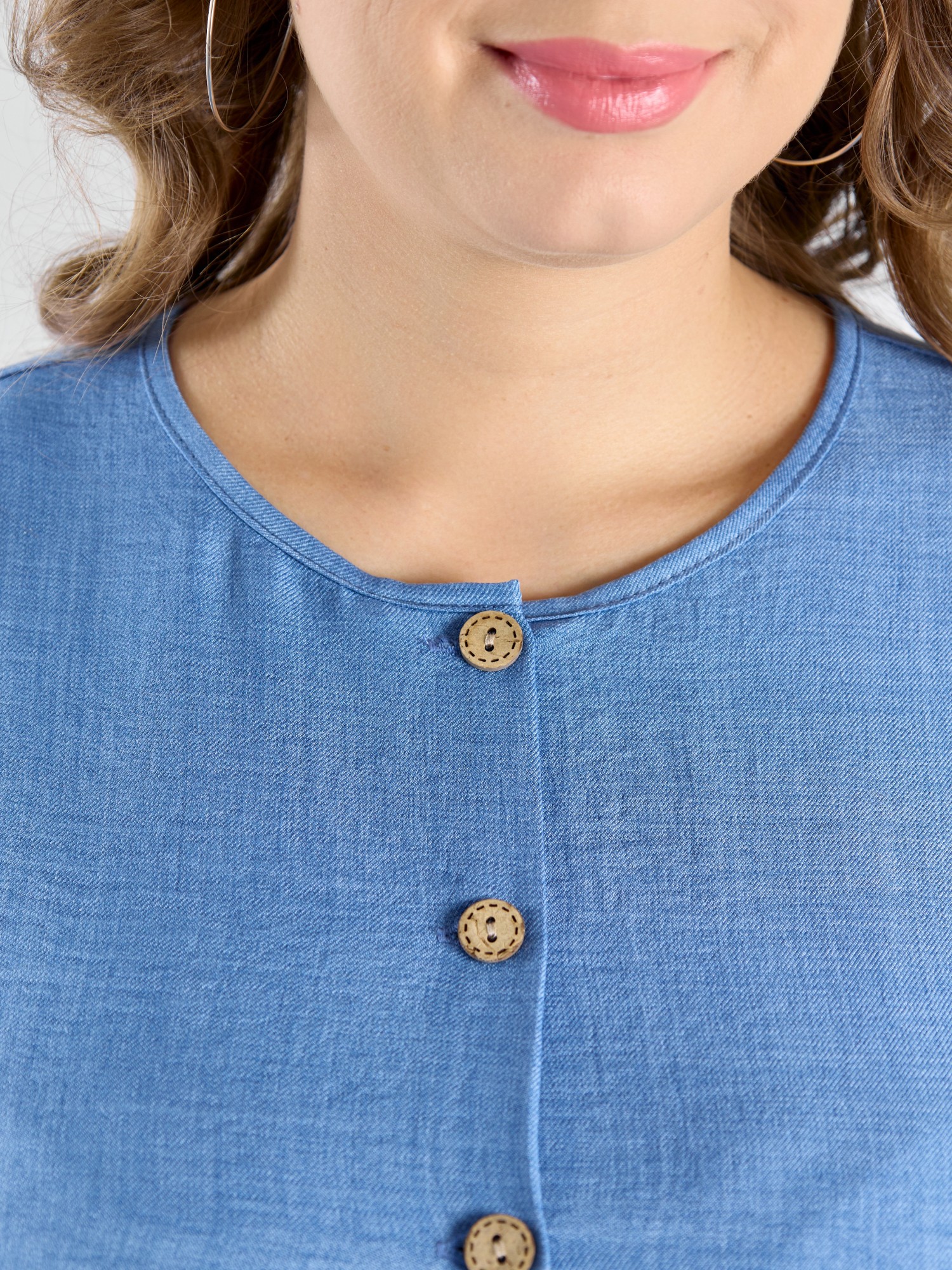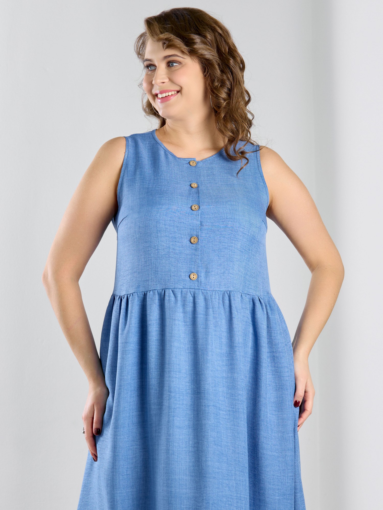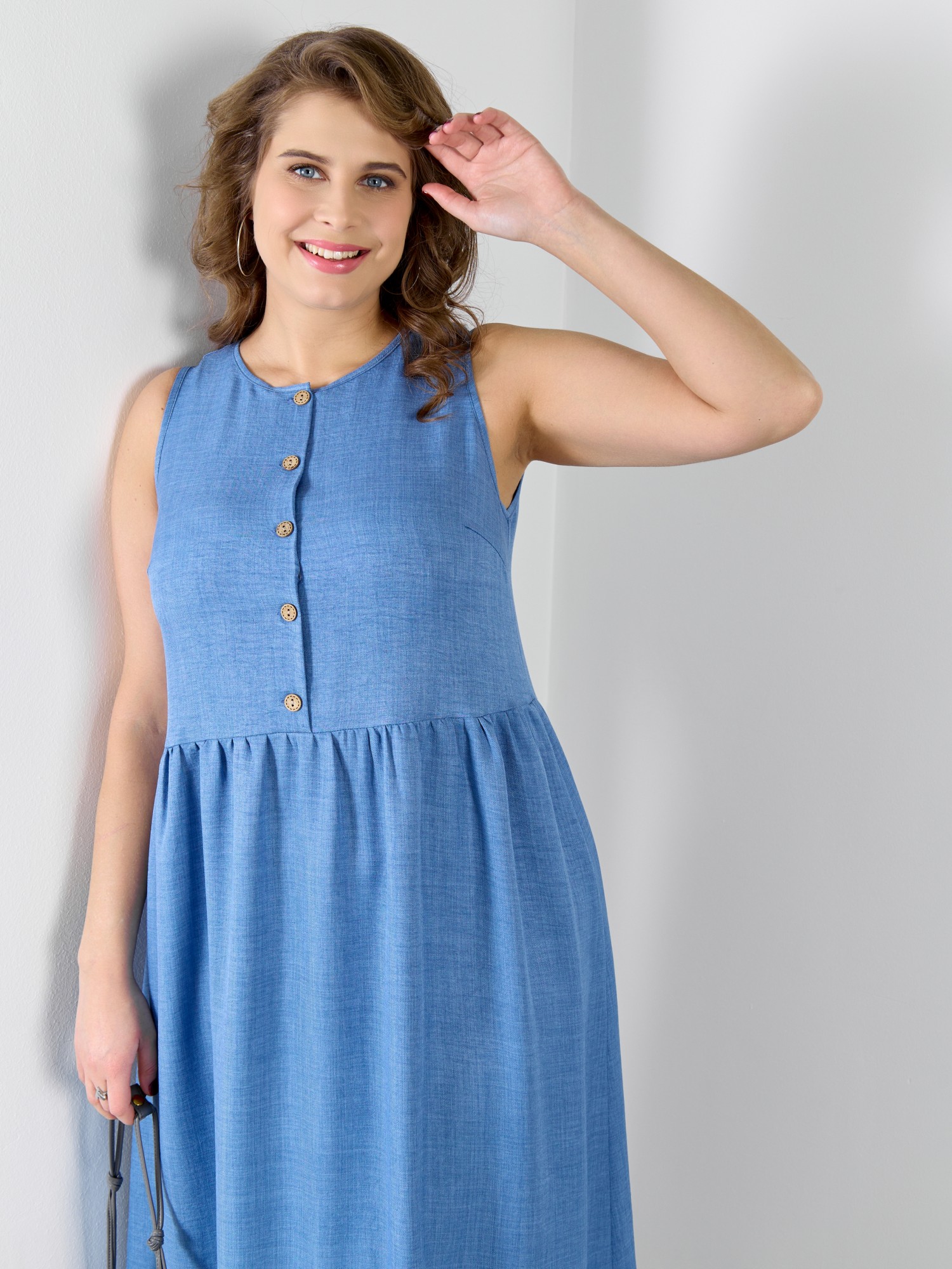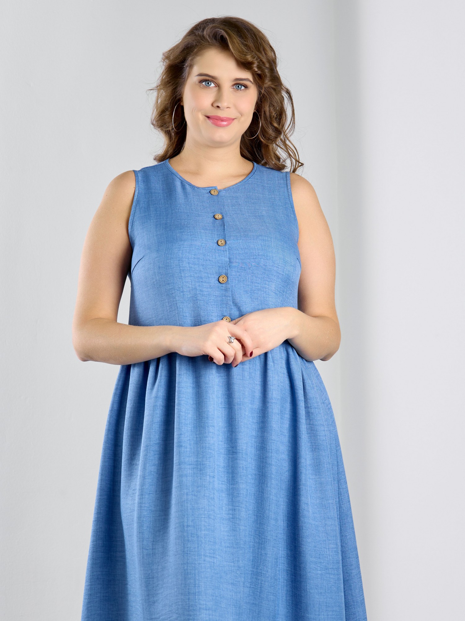 Платье женское из гладкокрашеного тканого полотна, отрезное по линии талии, длинное, без рукавов, с горловиной овальной формы и центральной бортовой застежкой по лифу на петли и пуговицы. Юбка присборена по шву стачивания с лифом, горловина и проймы окантованы основным материалом.