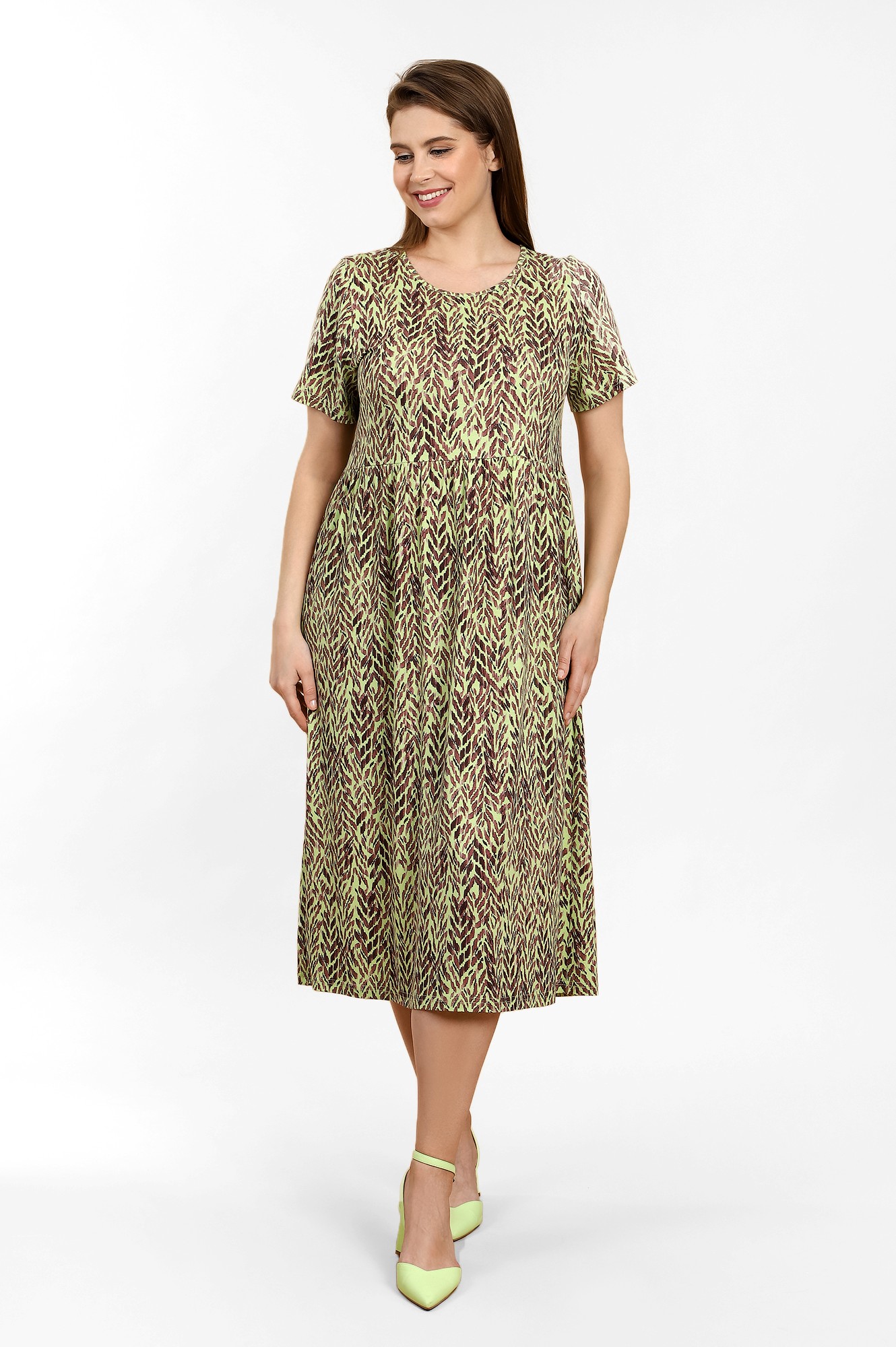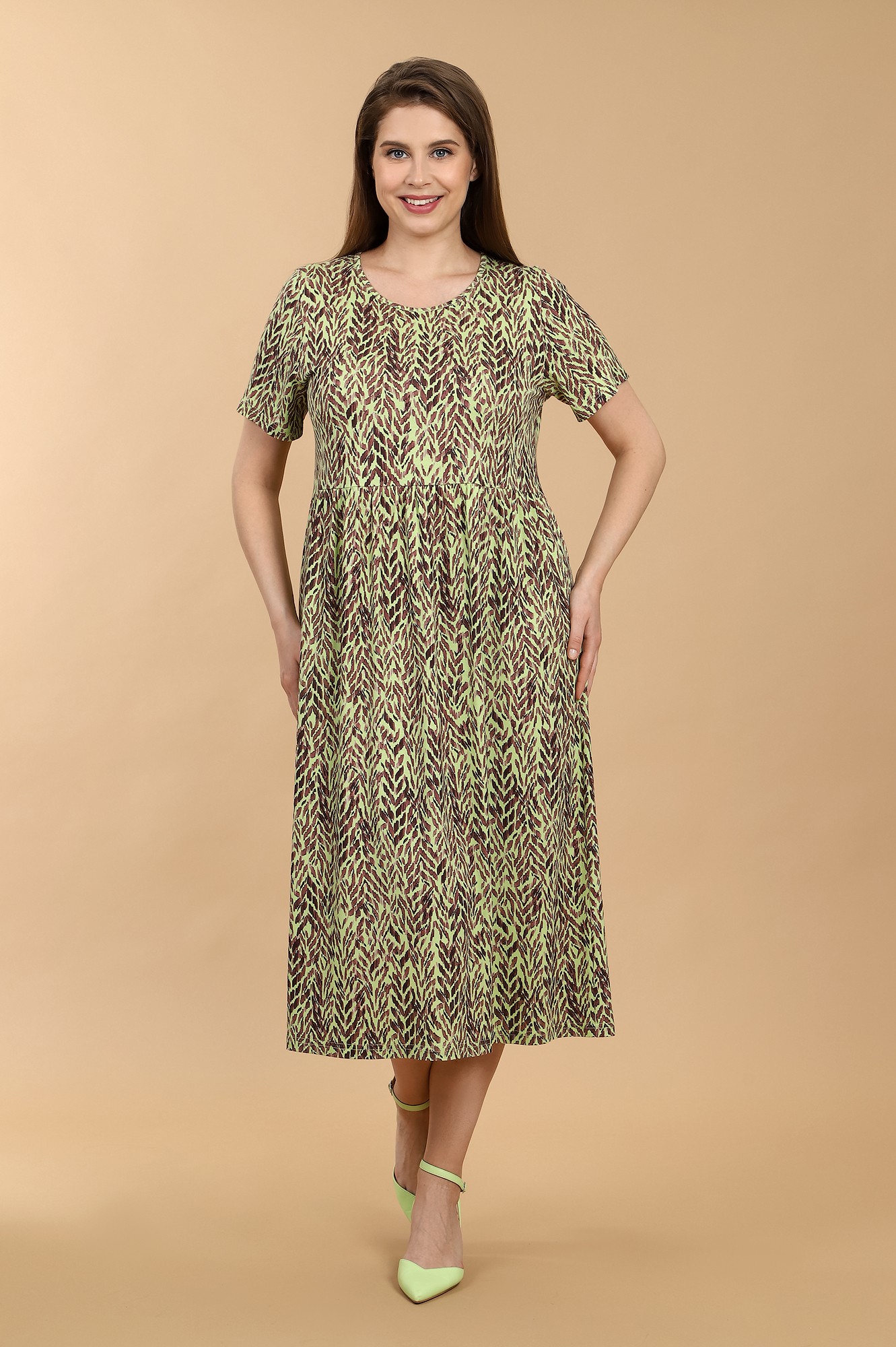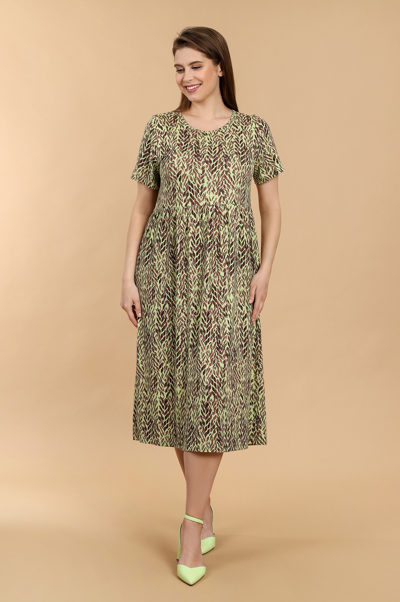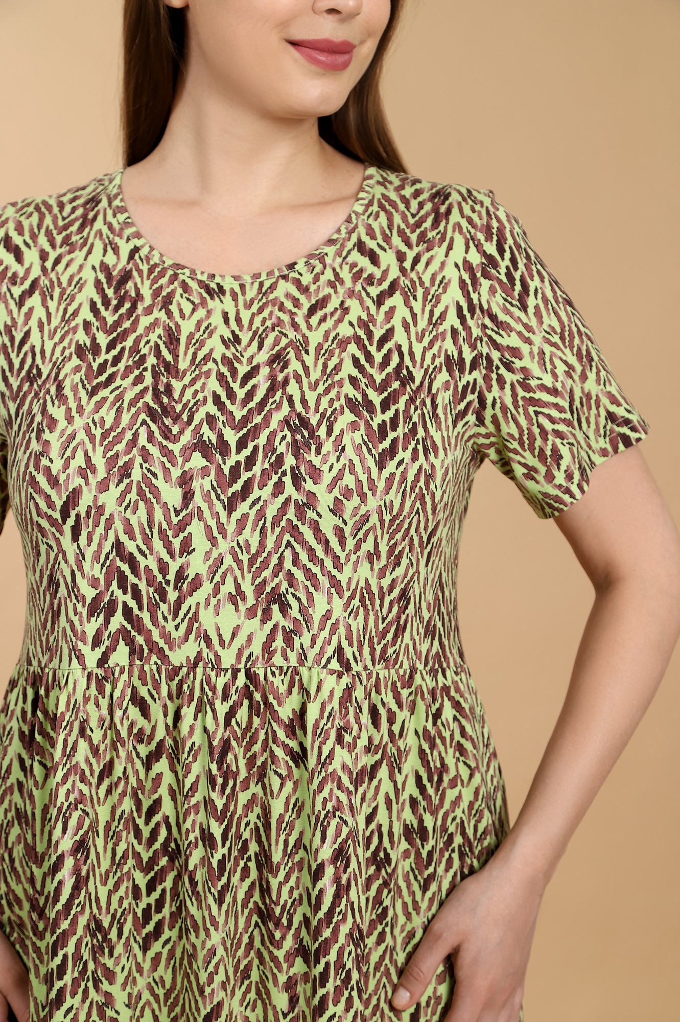 Платье из трикотажного вискозного полотна с набивным рисунком, свободного покроя, отрезное по линии талии, с короткими втачными рукавами и горловиной овальной формы, обработанной окантовкой из основного материала. Юбка присборена по шву соединения с верхней деталью.