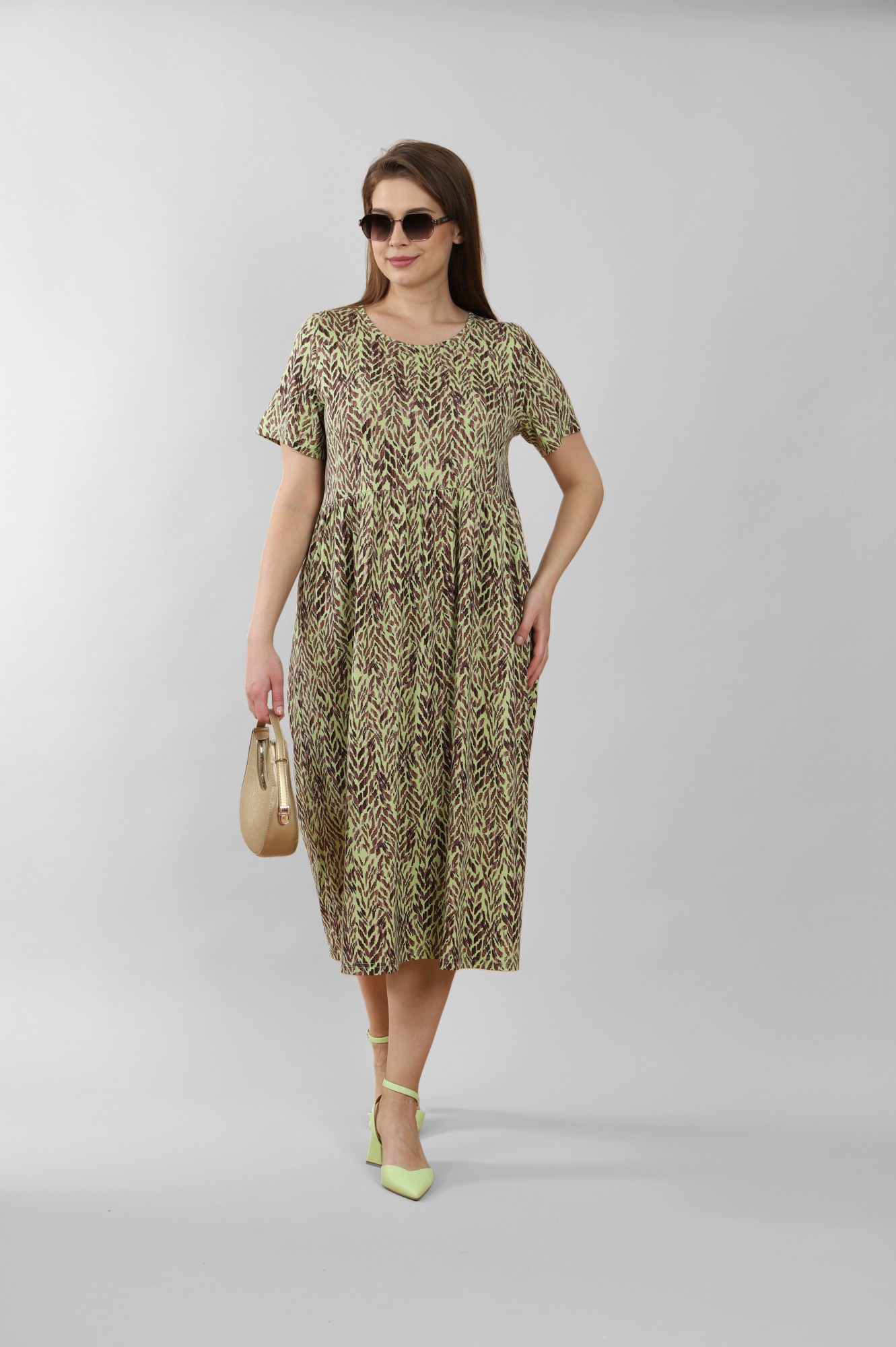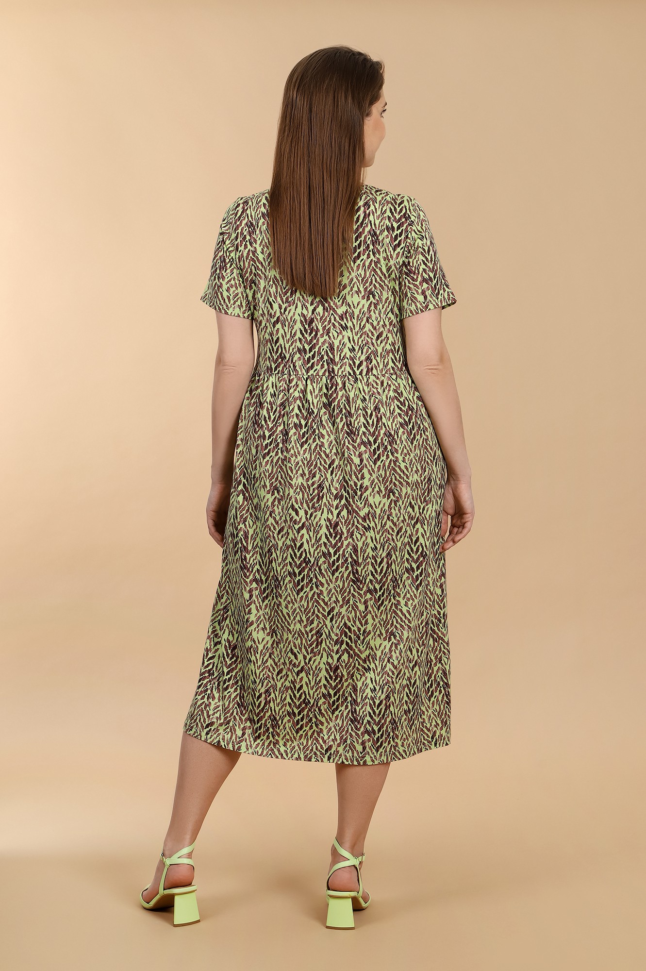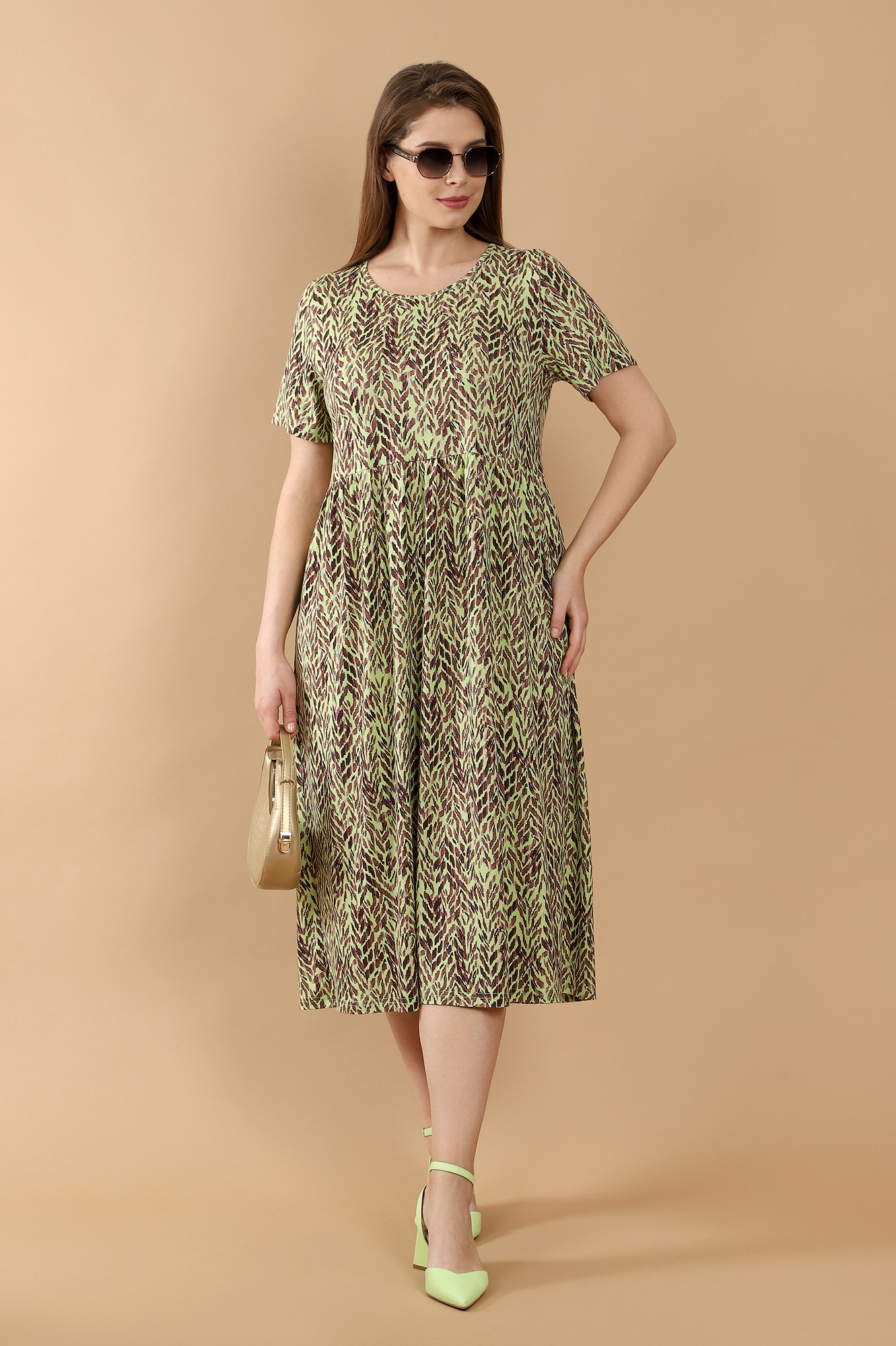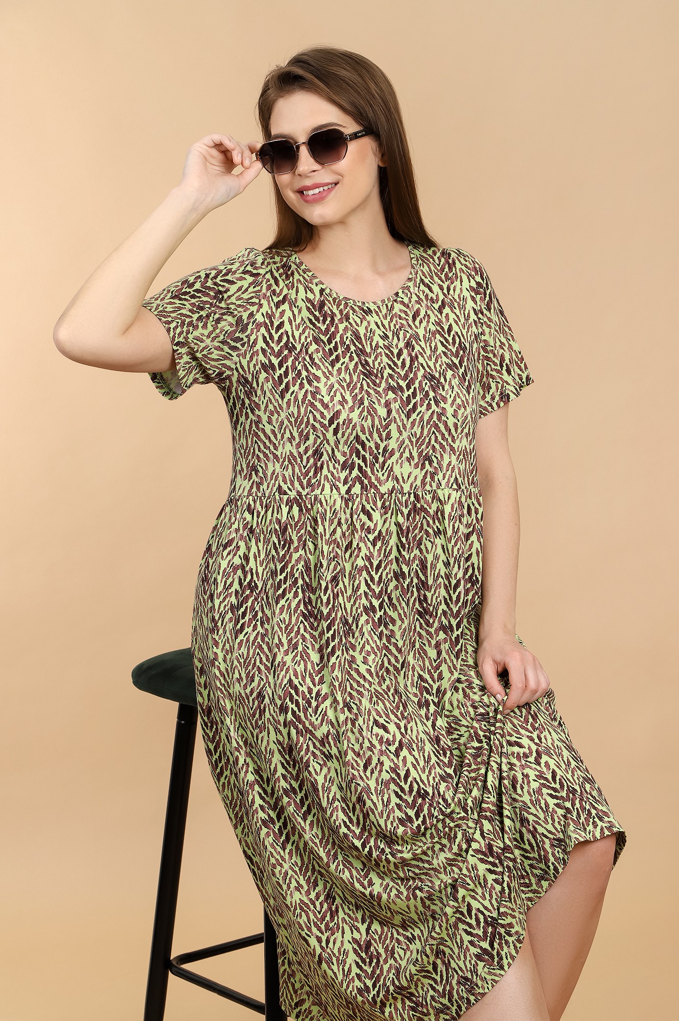 Платье из трикотажного вискозного полотна с набивным рисунком, свободного покроя, отрезное по линии талии, с короткими втачными рукавами и горловиной овальной формы, обработанной окантовкой из основного материала. Юбка присборена по шву соединения с верхней деталью.