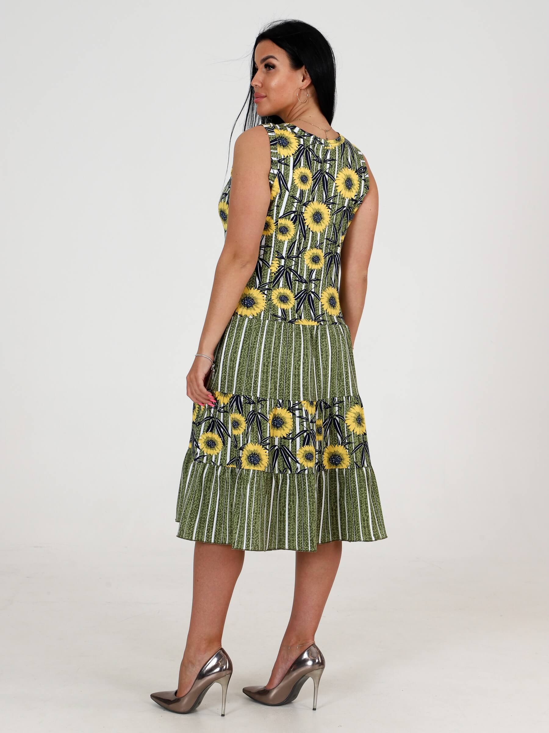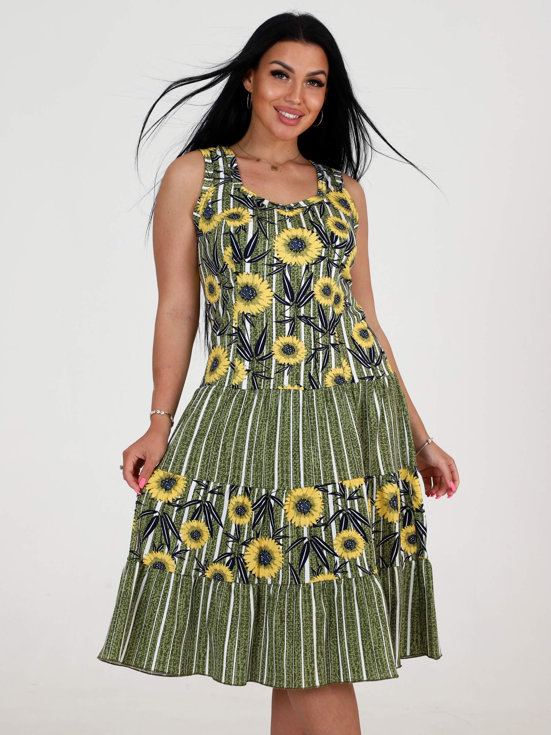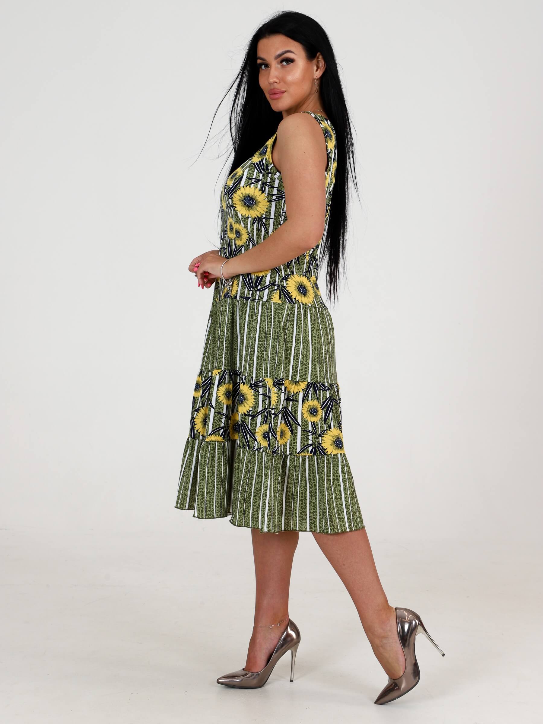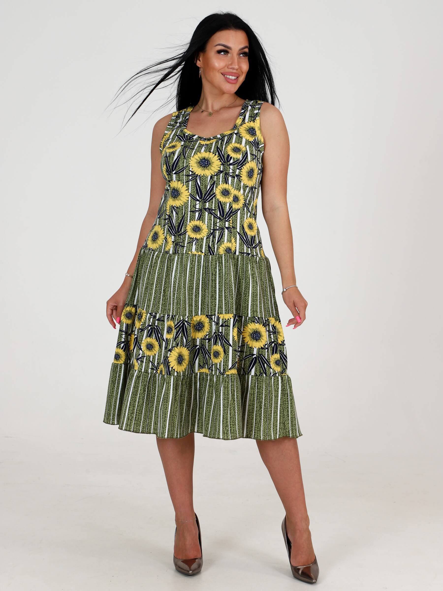 Трикотажный сарафан из кулирки 3 ЯРУСА СК-761 / Подсолнух на полосе хаки, комбинированный, приталенный рельефами. Горловина и проймы окантованы. Юбка из трех оборок стройнит любую фигуру. Сарафан сшит из кулирки, натуральной хлопковой ткани. Подойдет для девушек и женщин любого возраста и роста: для высоких, для средних, для низких. Сарафан на широких бретелях, поэтому его можно отнести как платье, трикотажное платье, повседневное платье. Хлопковый сарафан отлично сидит, скрадывает недостатки.