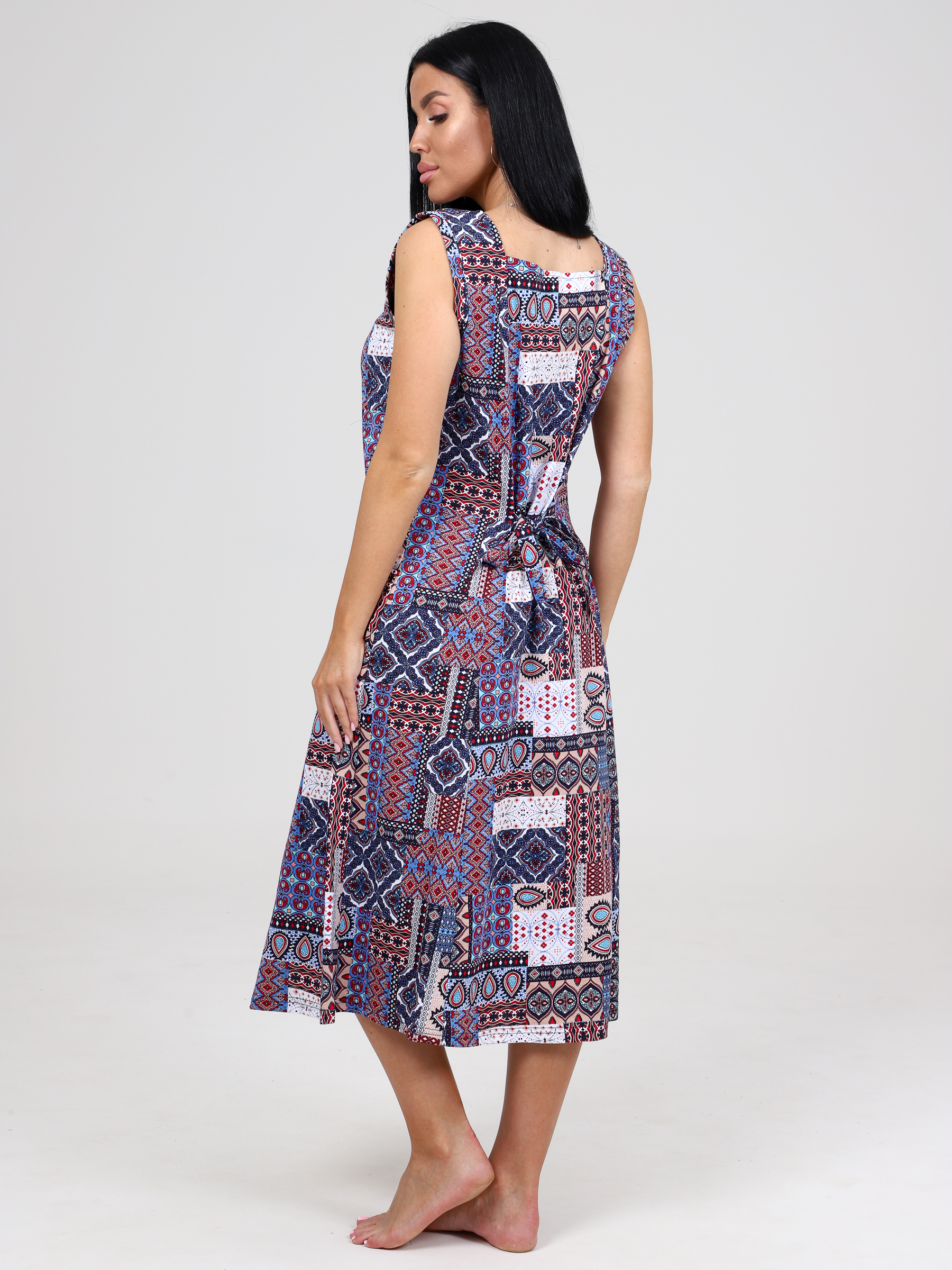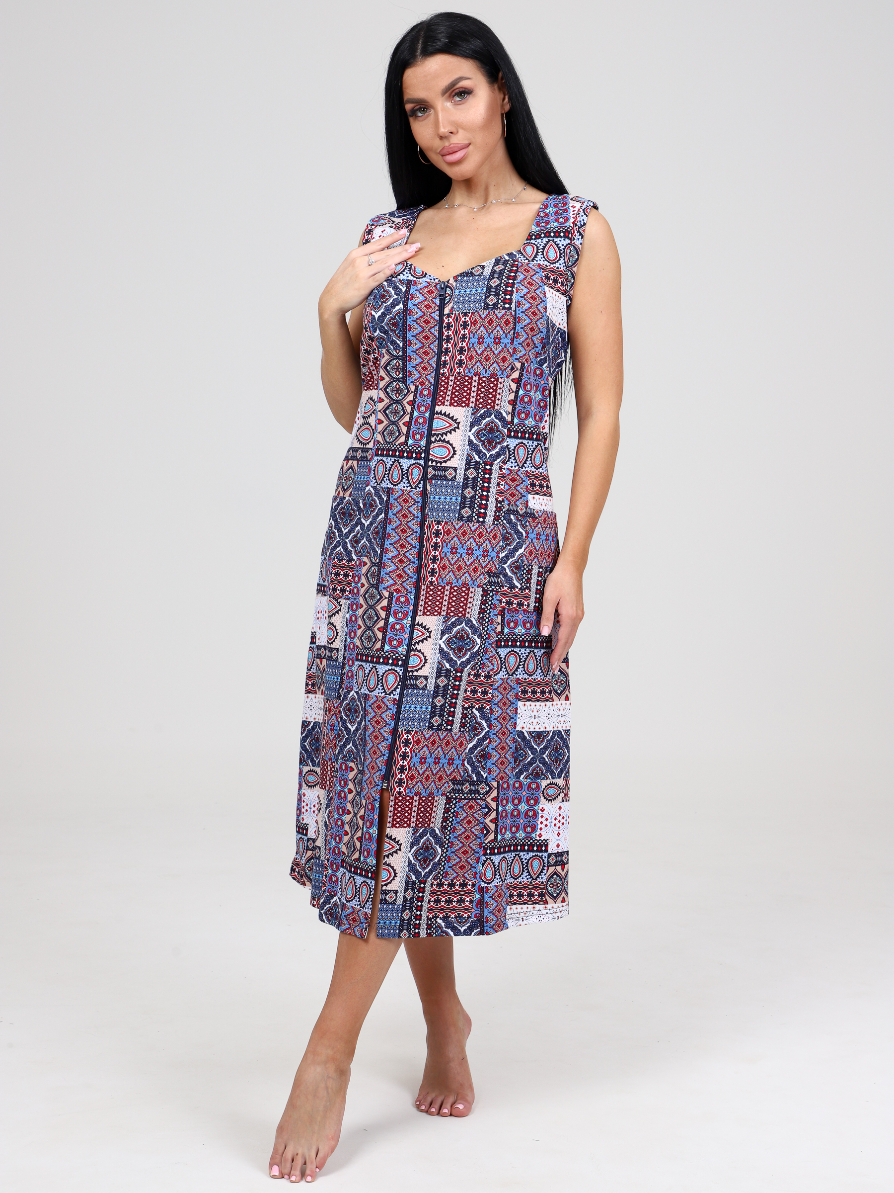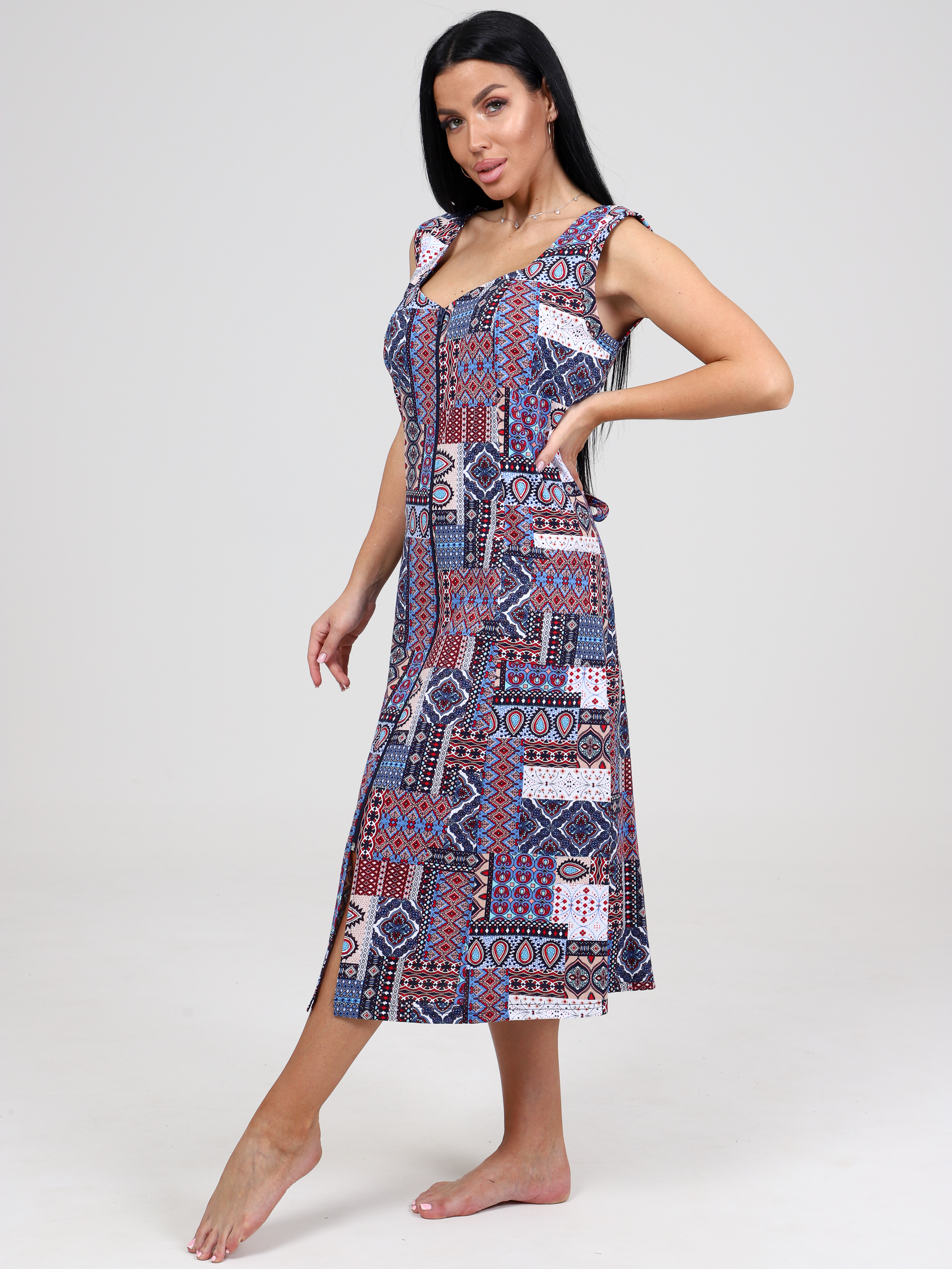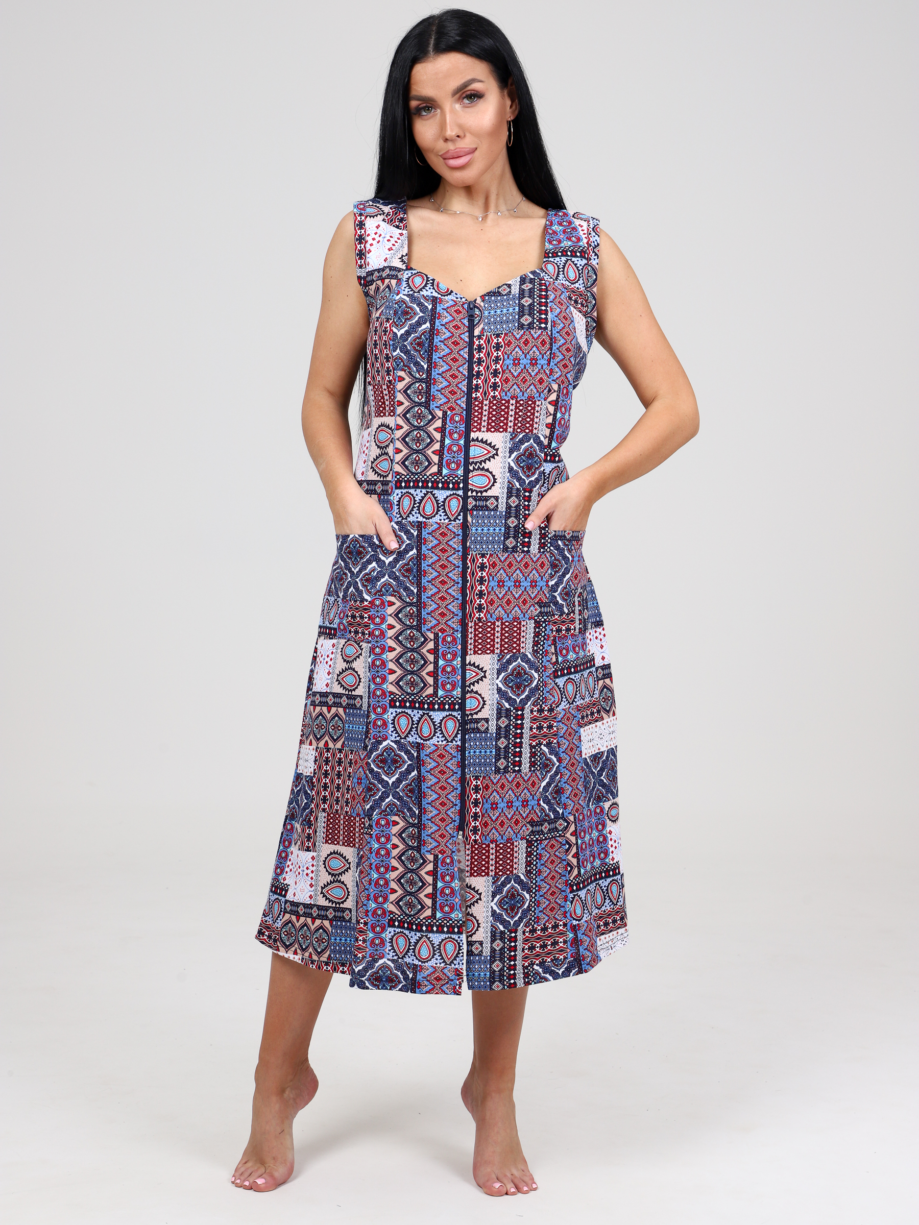 Сарафан трикотажный из кулирки на пуговицах, с 2 накладными карманами ШИРОКАЯ БРЕТЕЛЬ СК-563 / Этнический рисунок. Проймы окантованы. Сарафан с рельефами, поэтому сидит очень хорошо на женской фигуре. Сарафан трикотажный больших размеров в боковых швах имеет 2 пояска, которые помогут отрегулировать силуэт. Сарафан больших размеров сшит из приятной, натуральной, дышащей ткани. Наш трикотажный сарафан порадуют девушек и женщин любого возраста.