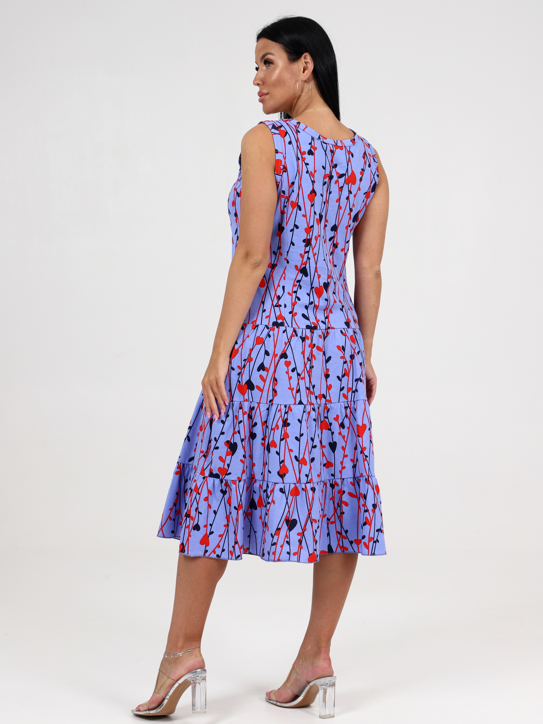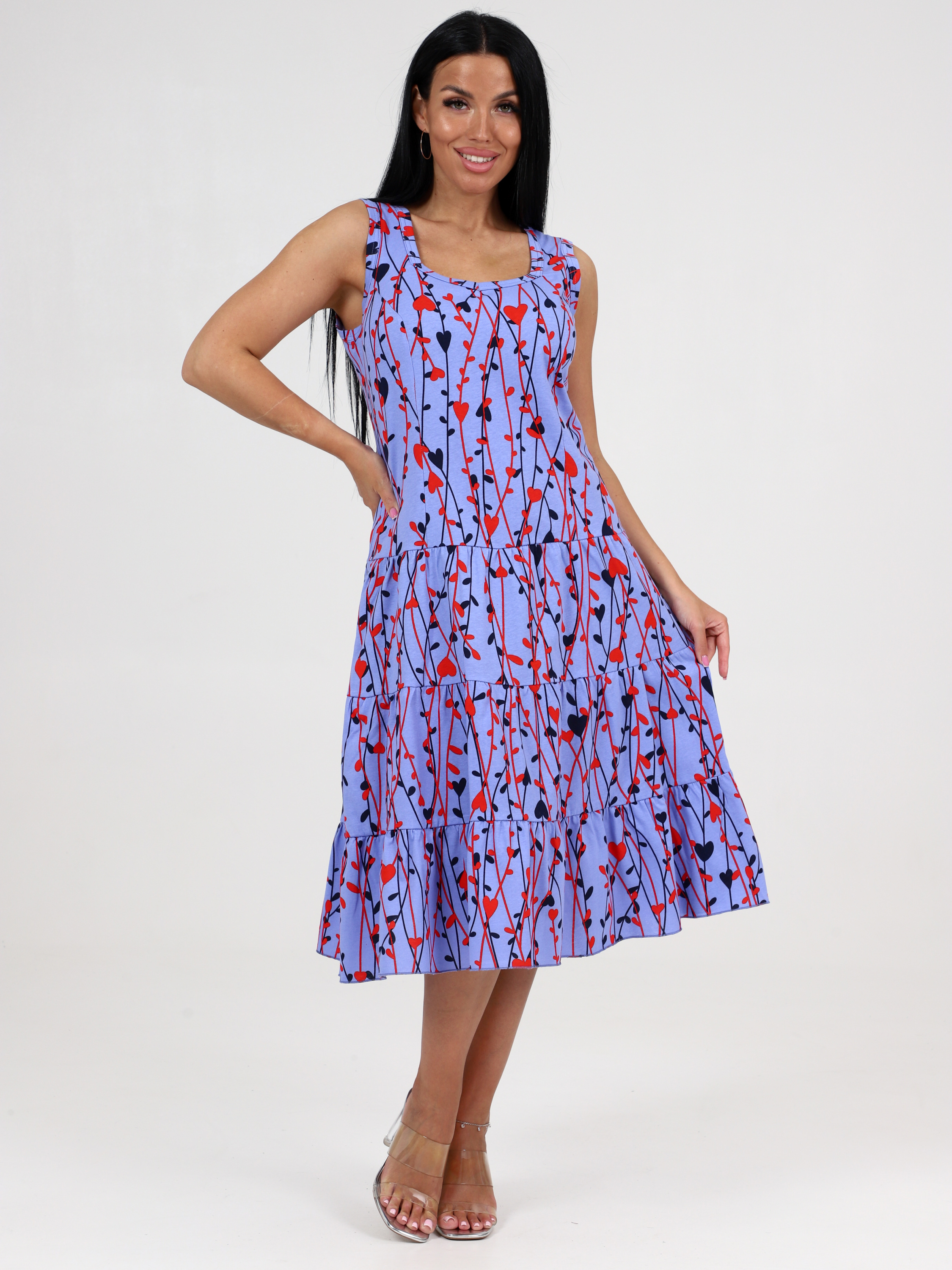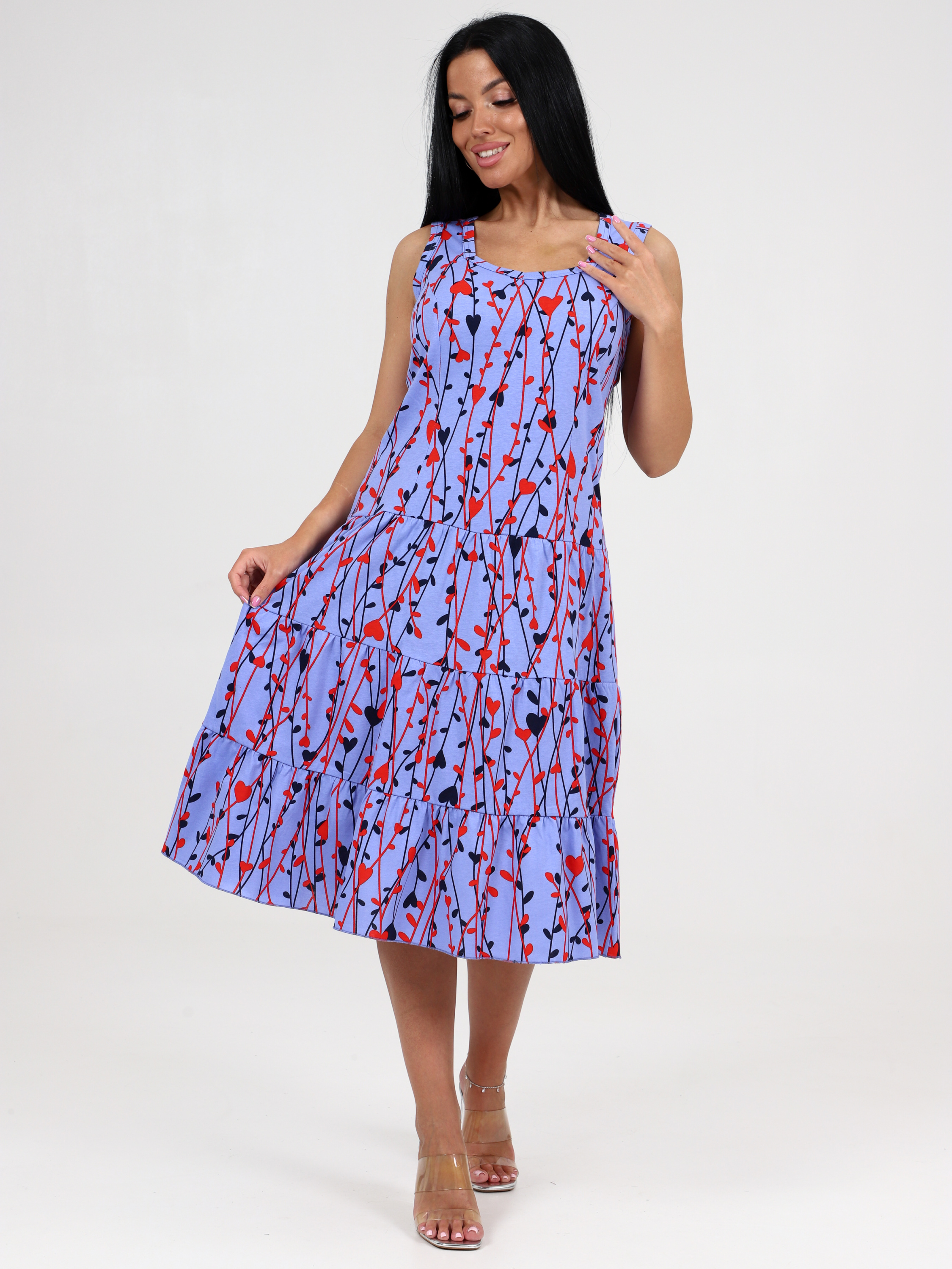 Трикотажный сарафан из кулирки 3 ЯРУСА СК-761 / Лианы на сирени, комбинированный, приталенный рельефами. Горловина и проймы окантованы. Юбка из трех оборок стройнит любую фигуру. Сарафан сшит из кулирки, натуральной хлопковой ткани. Подойдет для девушек и женщин любого возраста и роста: для высоких, для средних, для низких. Сарафан на широких бретелях, поэтому его можно отнести как платье, трикотажное платье, повседневное платье. Хлопковый сарафан отлично сидит, скрадывает недостатки.