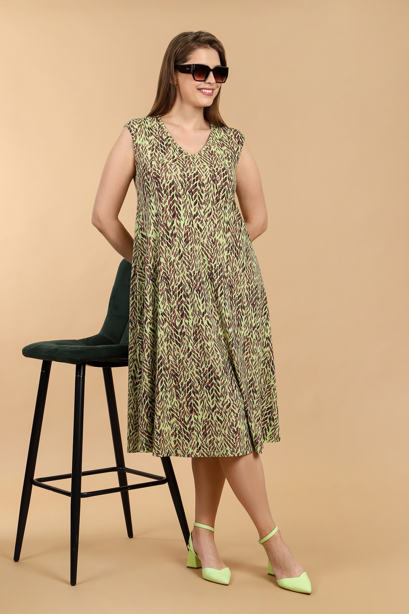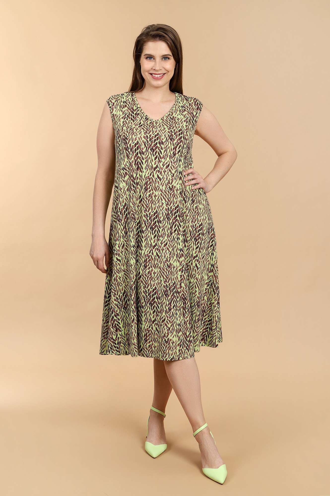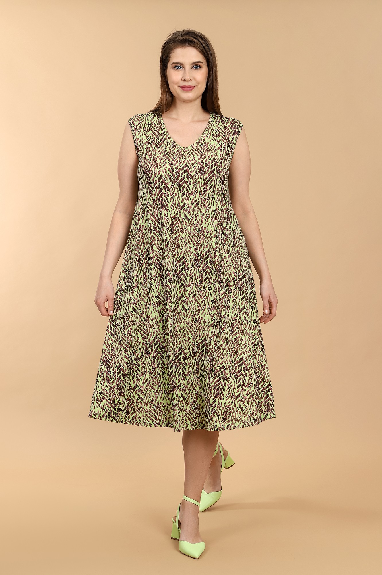 Сарафан женский из трикотажного вискозного полотна с набивным рисунком свободного покроя, расширенное книзу, с горловиной V- образной формы, окантованной основным материалом.