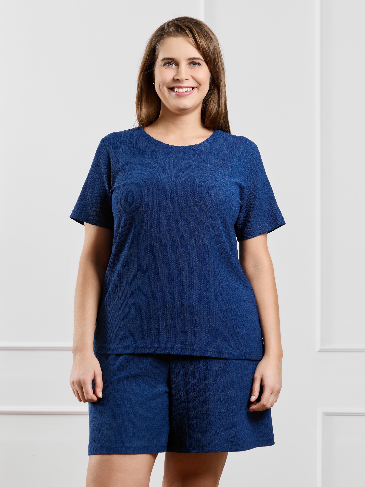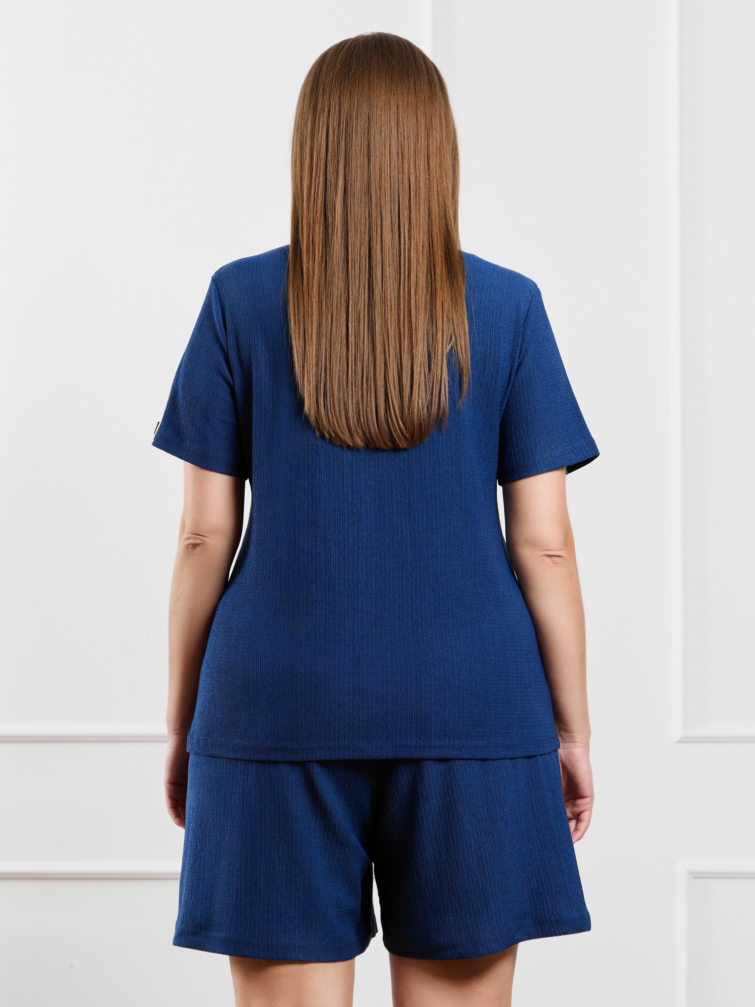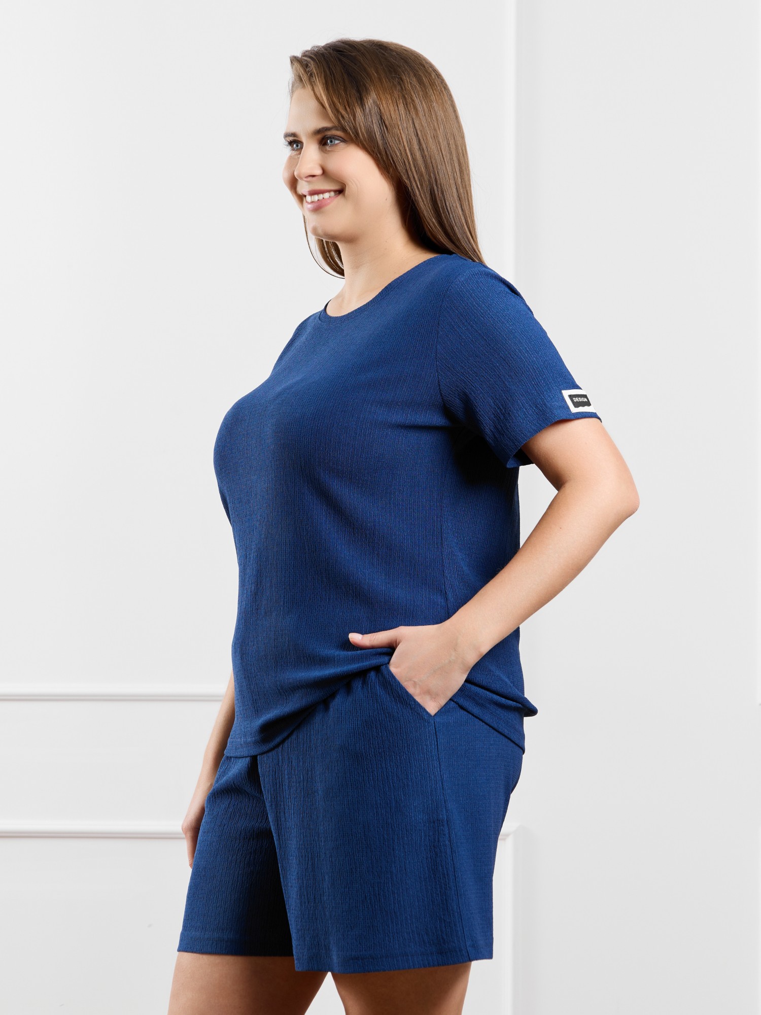 Шорты женские из гладкокрашенного трикотажного полотна «бурумчук», свободные, средней длины, с карманами в боковых швах, на притачном поясе с эластичной тесьмой внутри.