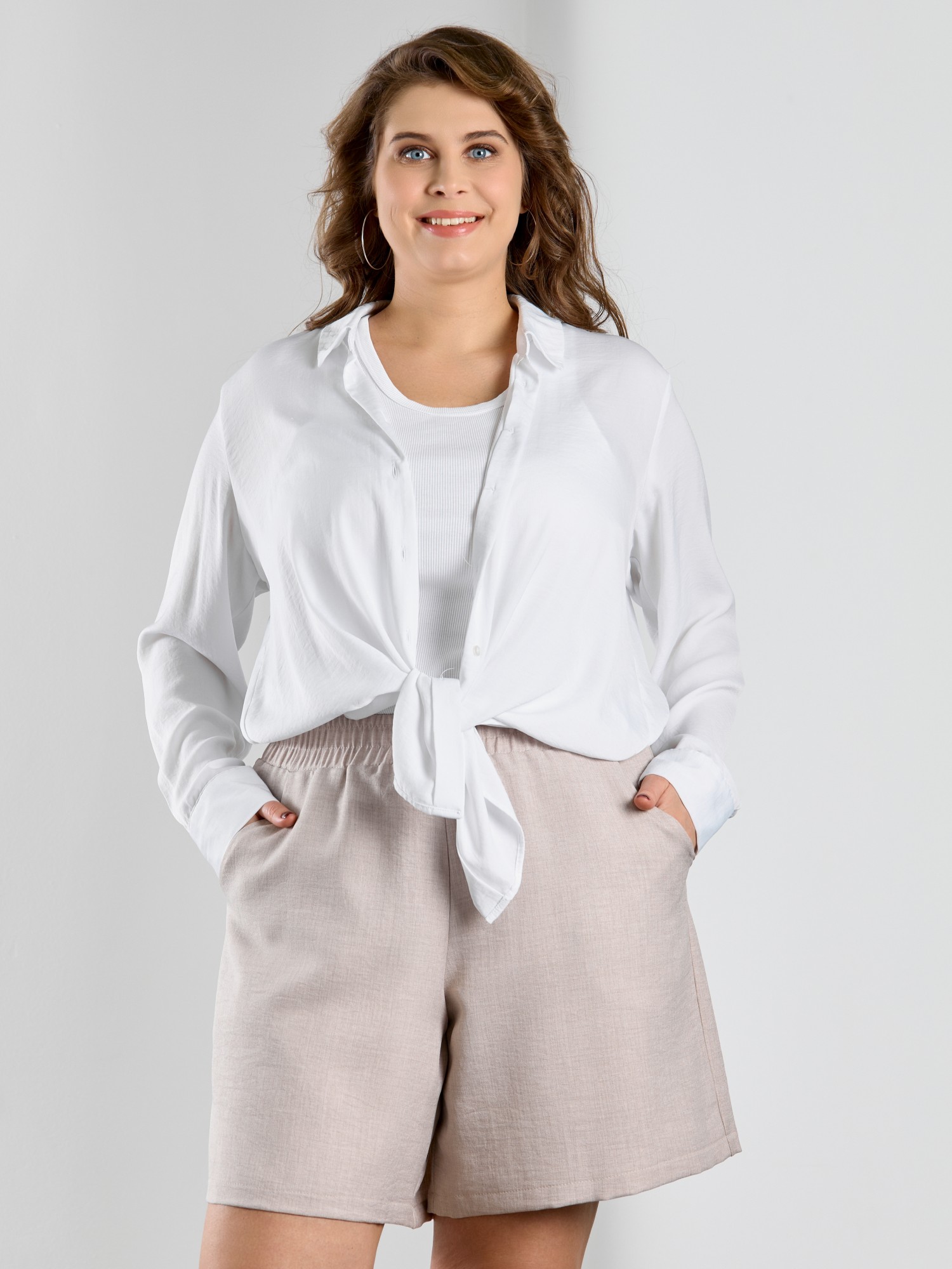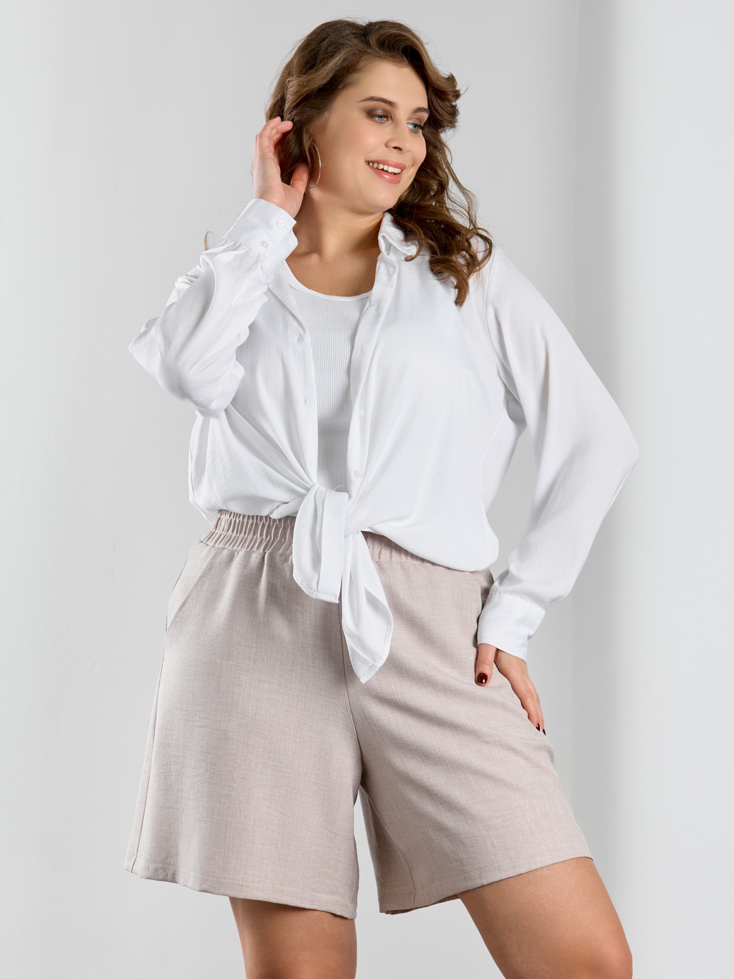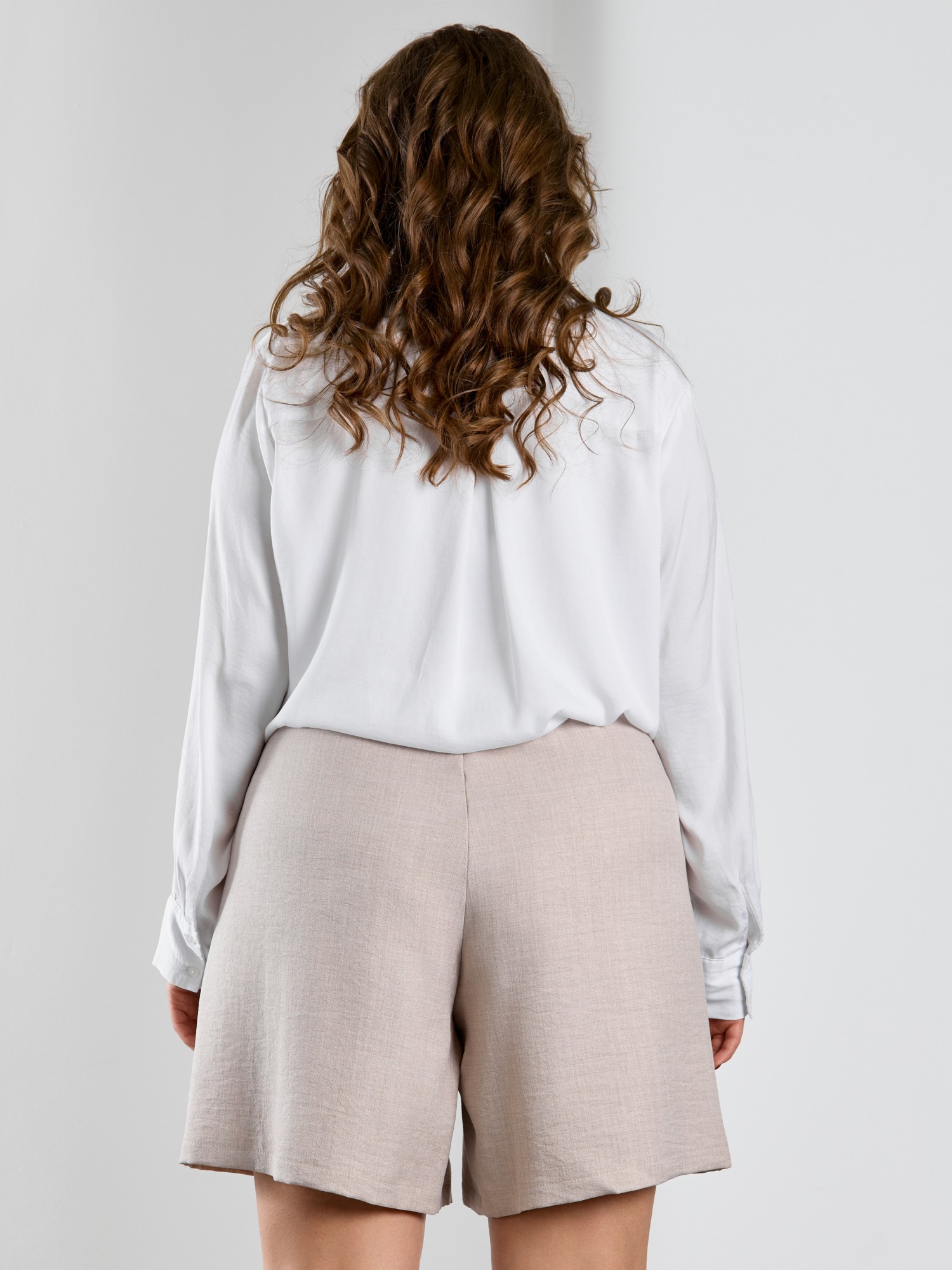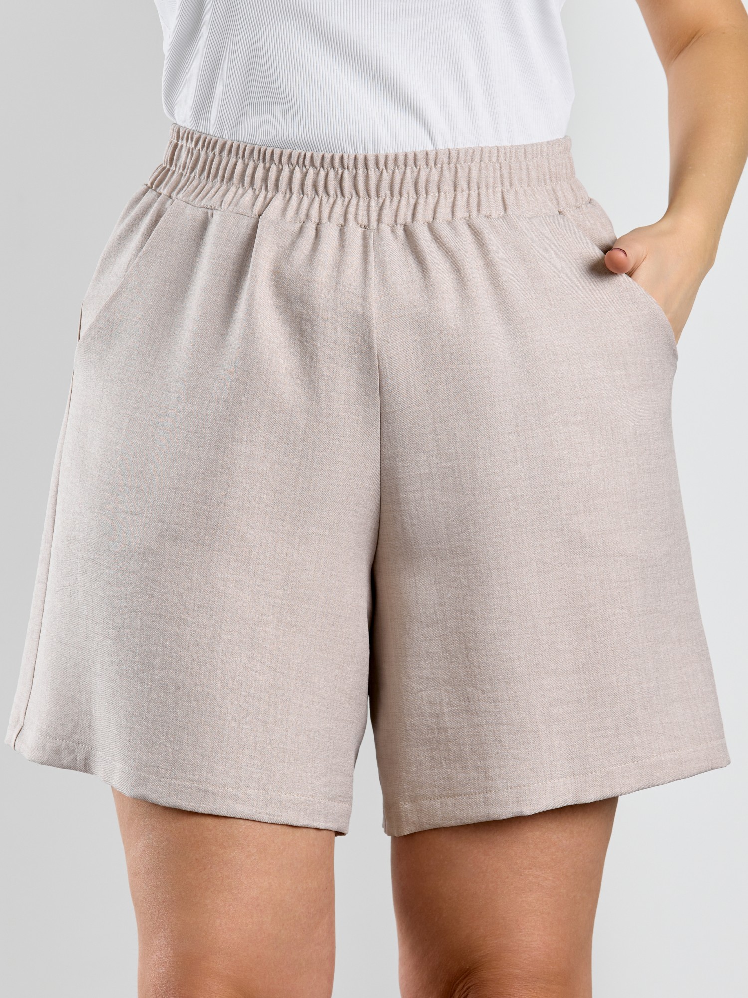 Шорты женские из гладкокрашеного тканого полотна, свободного покроя, средней длины, с карманами в боковых швах, на притачном поясе с эластичной тесьмой внутри.