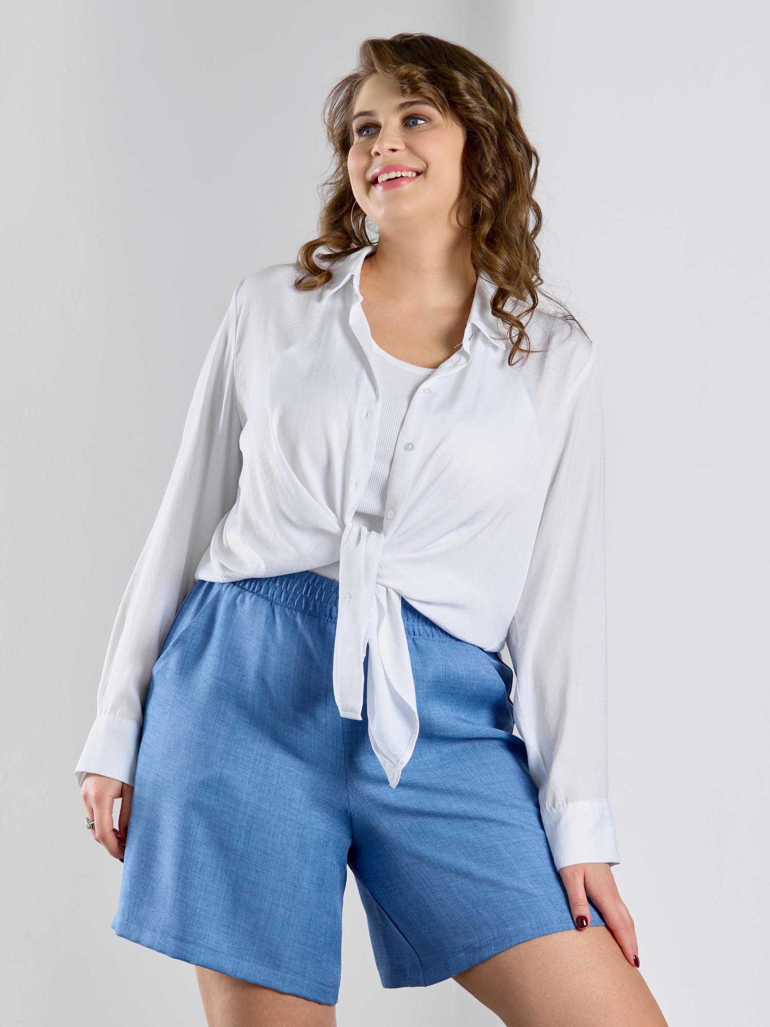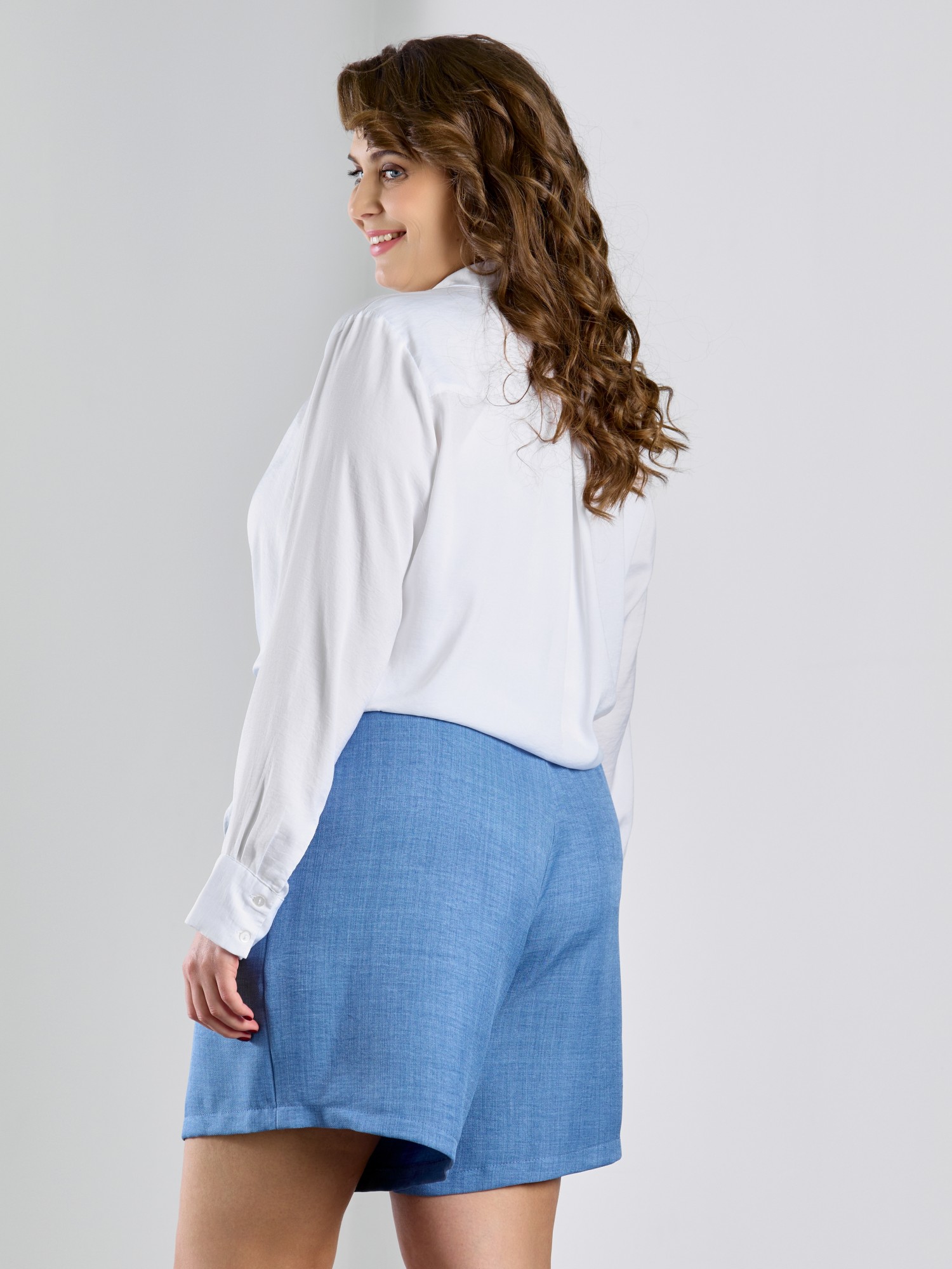 Шорты женские из гладкокрашеного тканого полотна, свободного покроя, средней длины, с карманами в боковых швах, на притачном поясе с эластичной тесьмой внутри.