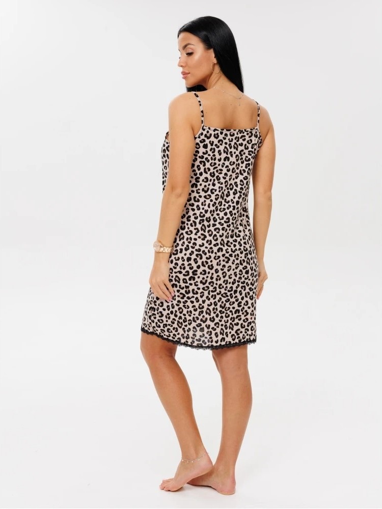 Женская сорочка Сор-96(К) / Бежевый (леопард) на тонких бретелях, длиной до колена. Женская ночная сорочка отшивается из хлопкового трикотажного полотна, имеет широкий размерный ряд и яркие расцветки.