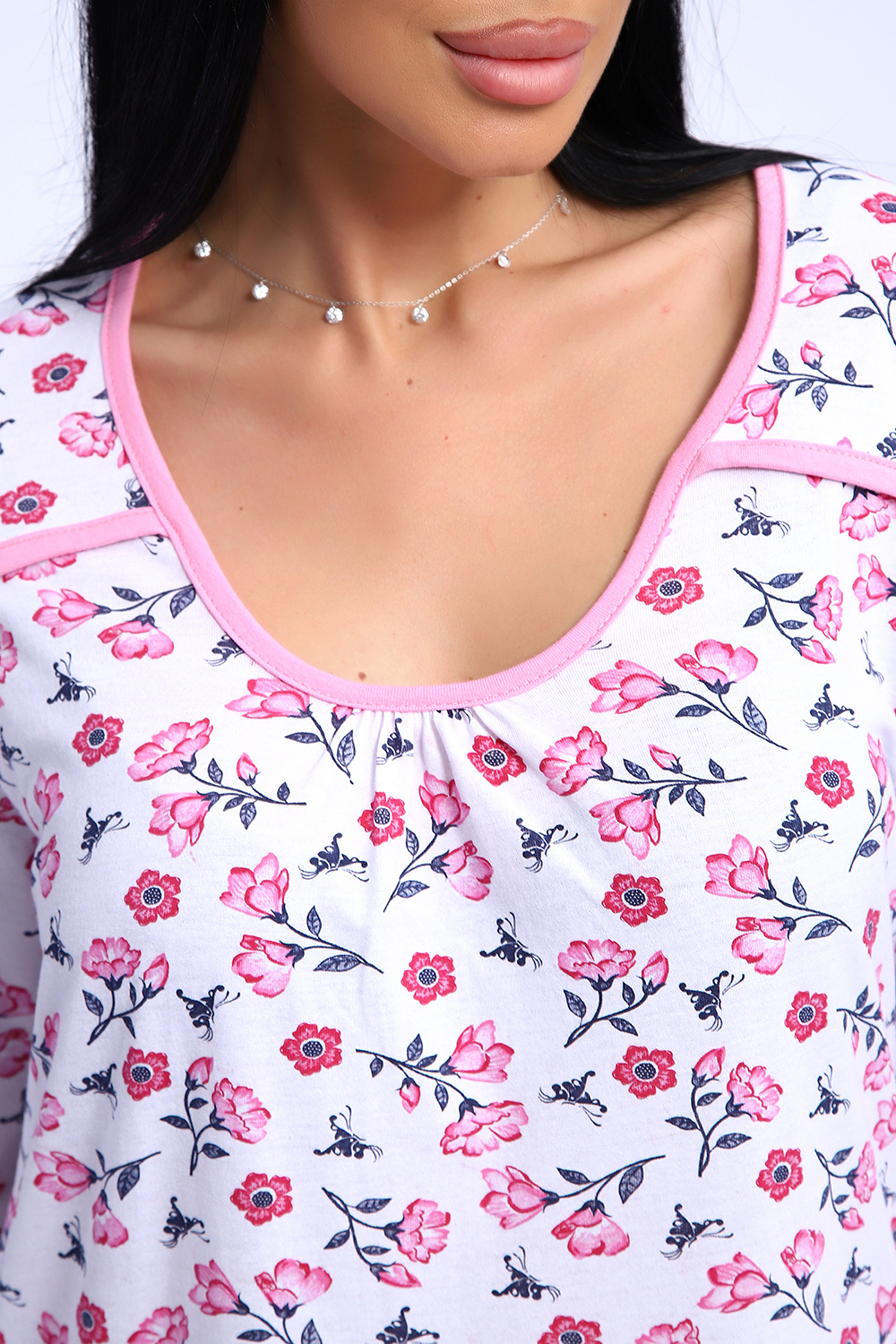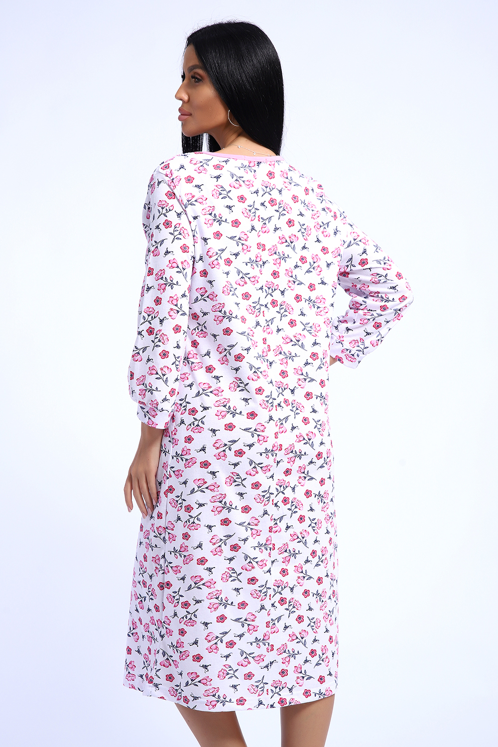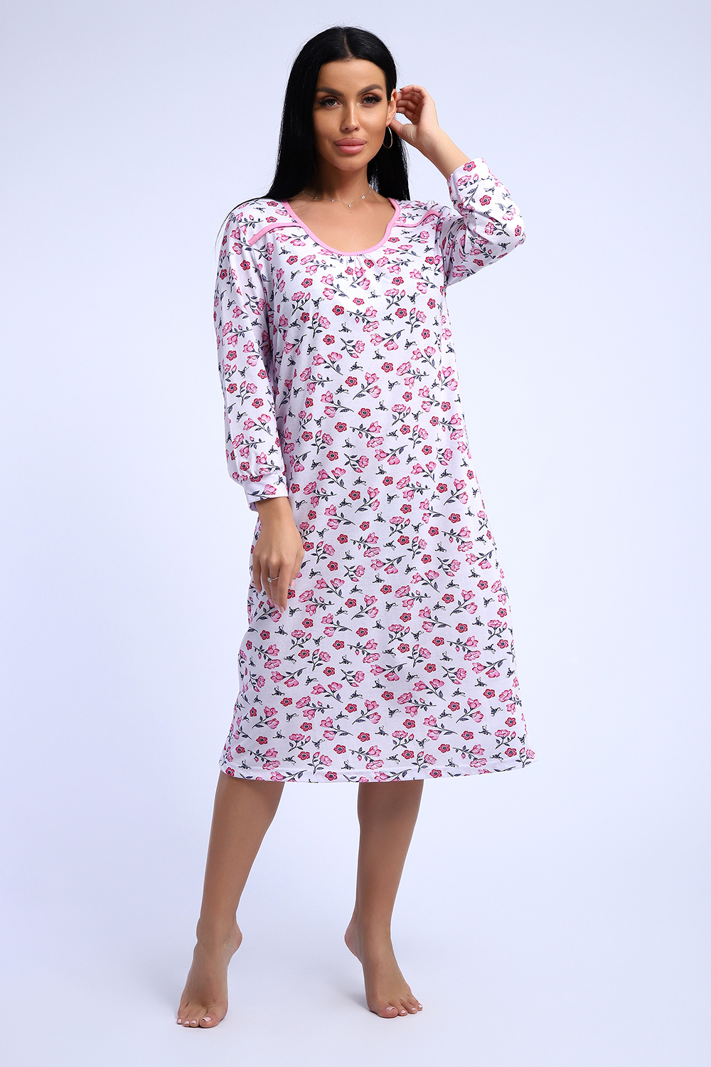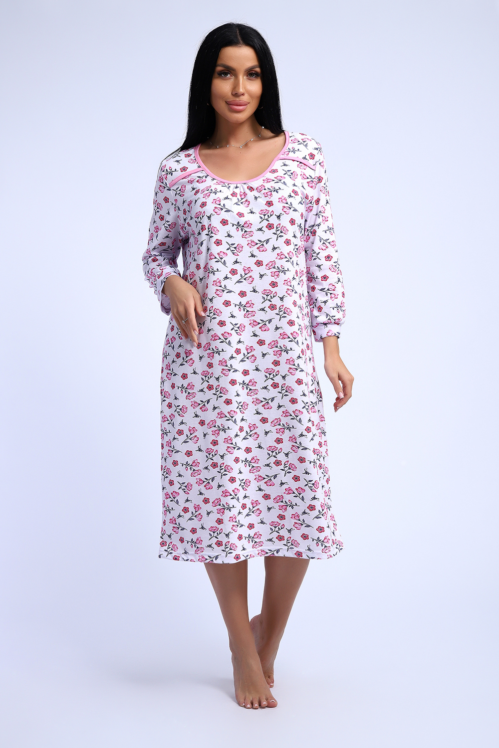 Сорочка из хлопковой белоземельной кулирки с нежным цветочным рисунком, рукава длинные.