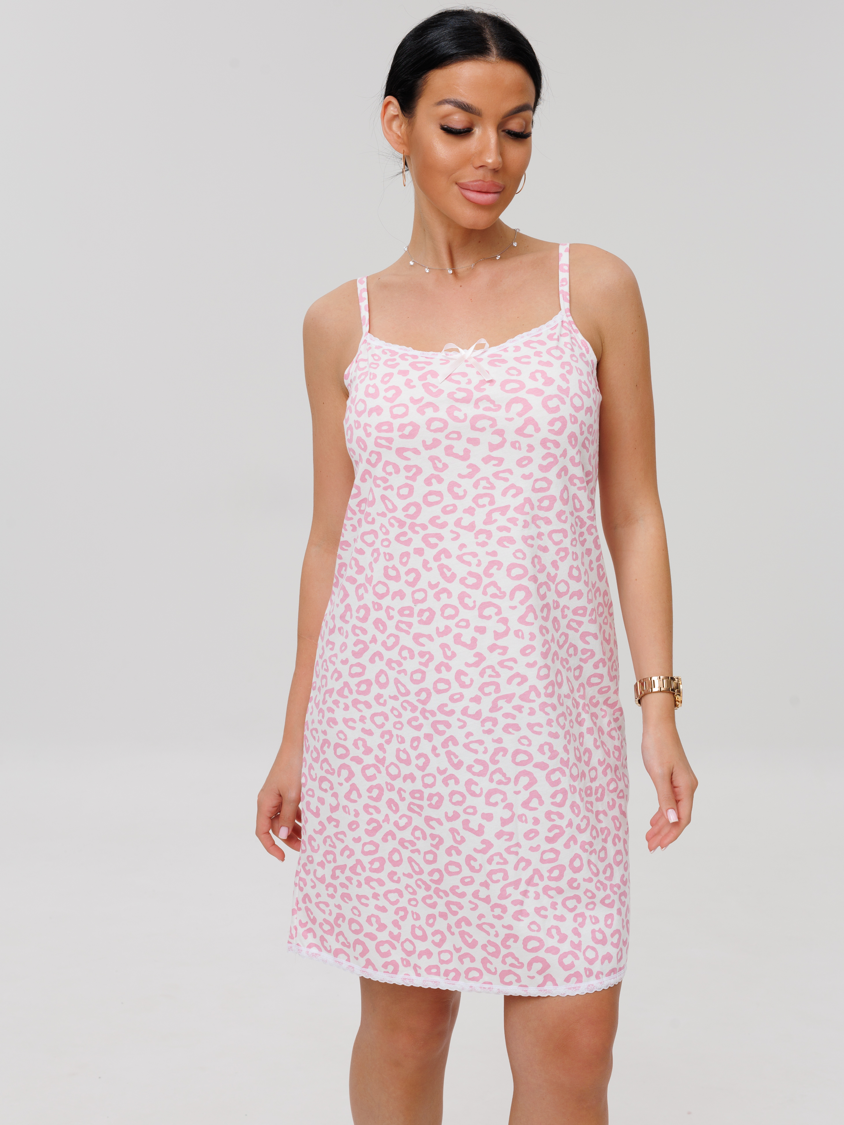 Женская сорочка Сор-96(К) / Розовый (леопард) на тонких бретелях, длиной до колена. Женская ночная сорочка отшивается из хлопкового трикотажного полотна, имеет широкий размерный ряд и яркие расцветки.