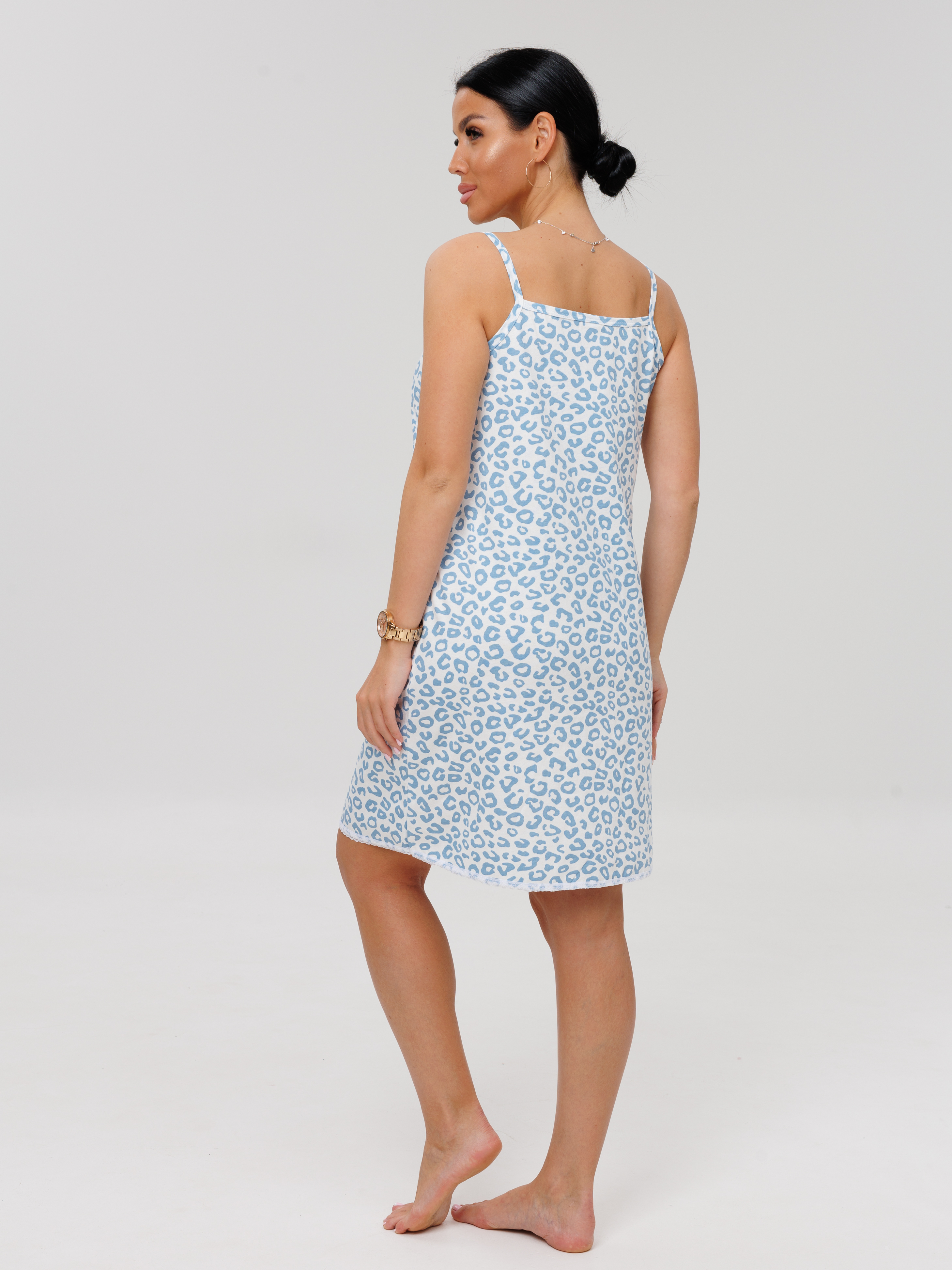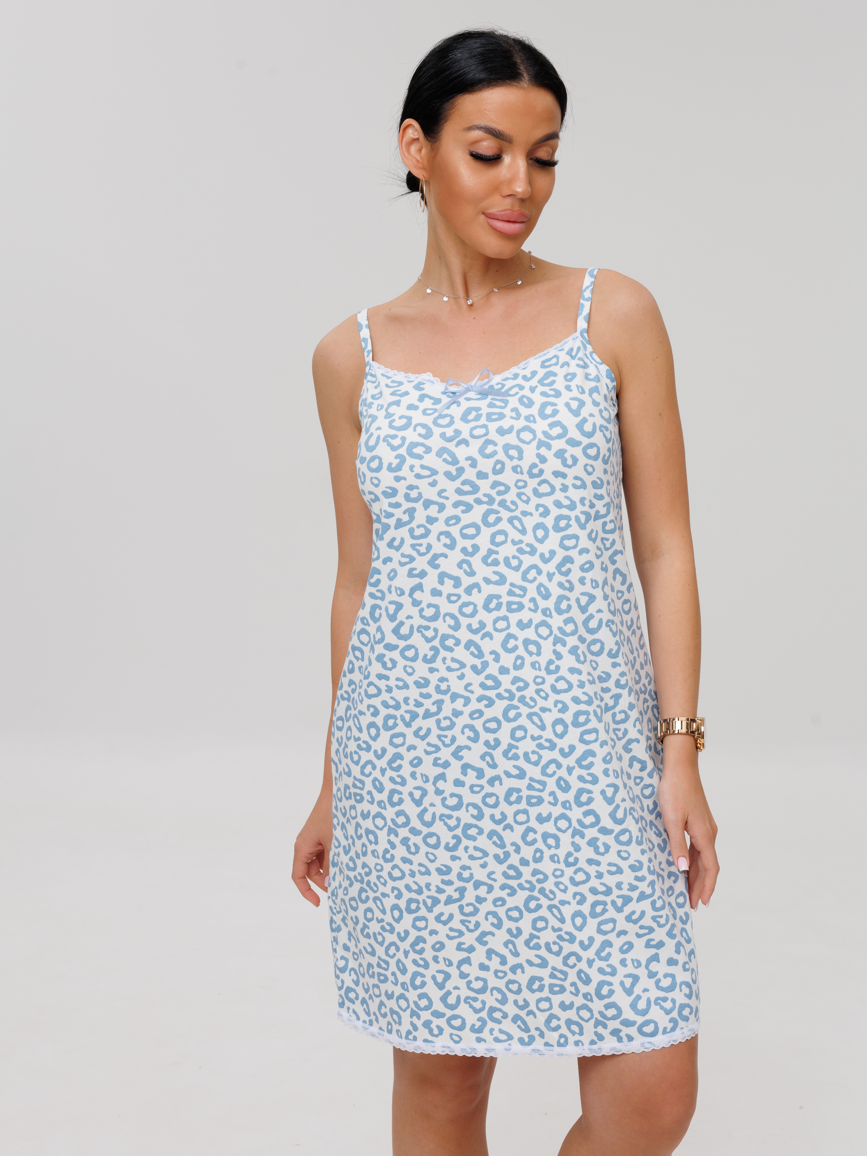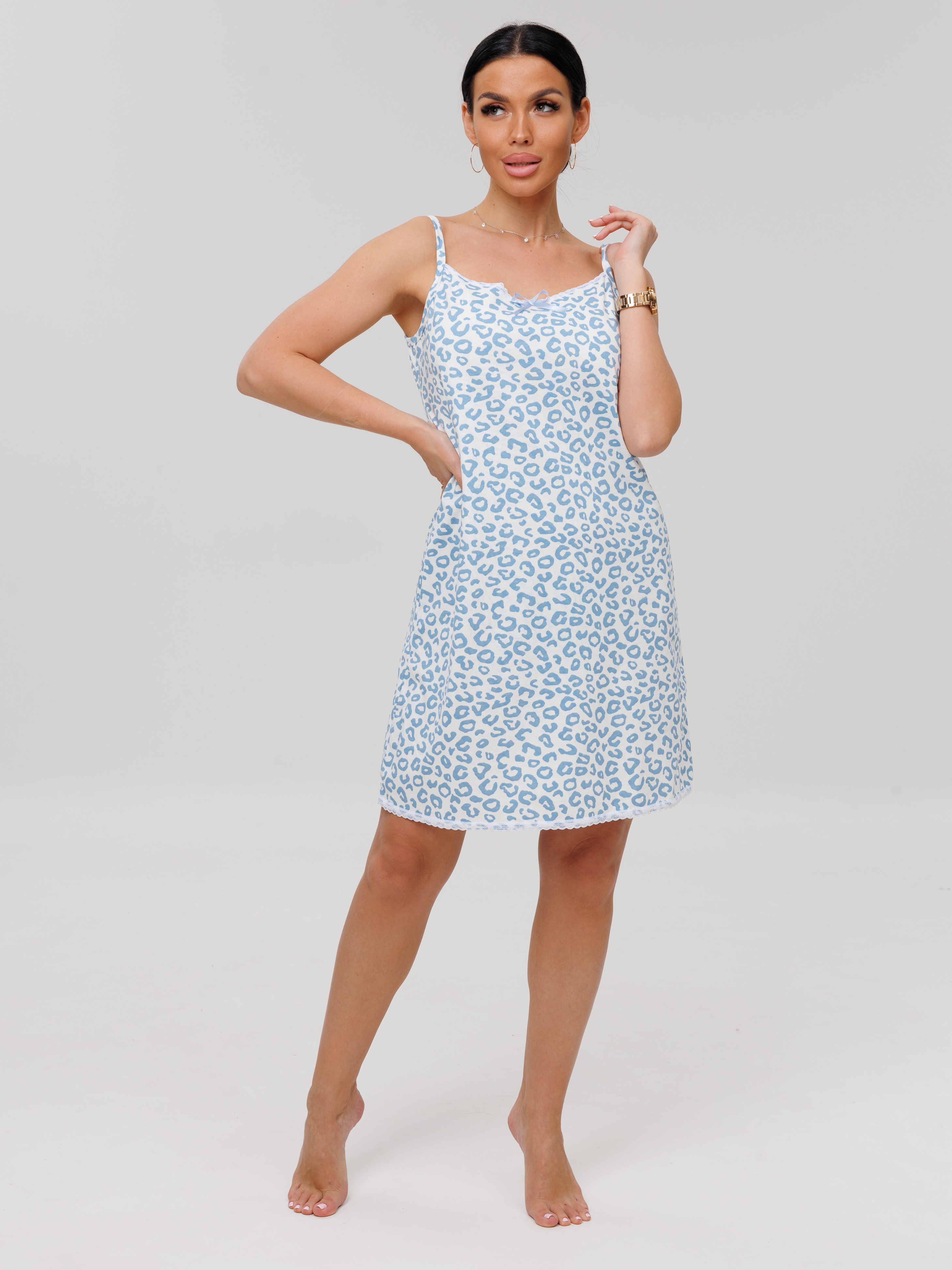 Женская сорочка Сор-96(К) / Голубой (леопард) на тонких бретелях, длиной до колена. Женская ночная сорочка отшивается из хлопкового трикотажного полотна, имеет широкий размерный ряд и яркие расцветки.