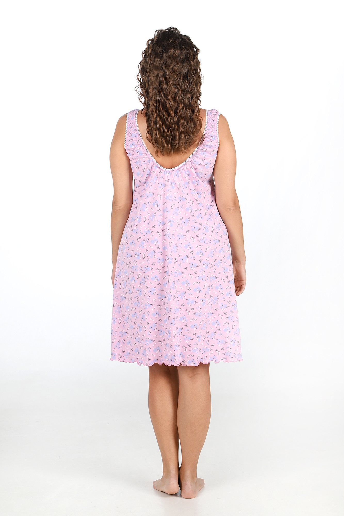 Сорочка женская из трикотажного полотна «кулирка» с набивным рисунком, расширенная книзу, без рукавов, с расширенной, углубленной горловиной овальной формы и притачной кокеткой по переду. Срезы пройм и горловины, а также шов притачивания кокетки, обработаны фасонной эластичной тесьмой с кружевным краем. Низ изделия обработан узкой обметочной строчкой.