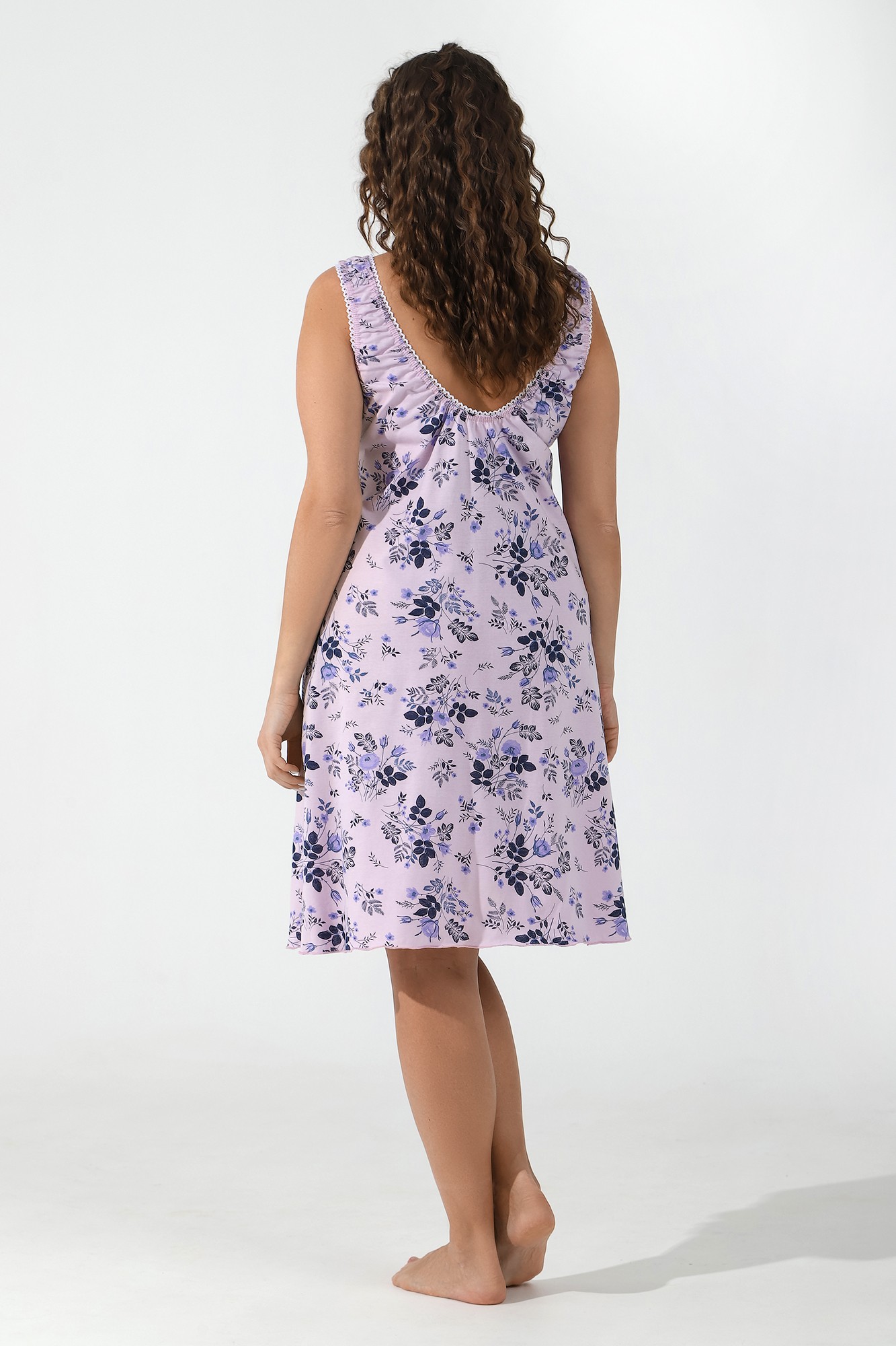 Сорочка женская из трикотажного полотна «кулирка» с набивным рисунком, расширенная книзу, без рукавов, с расширенной, углубленной горловиной овальной формы и притачной кокеткой по переду. Срезы пройм и горловины, а также шов притачивания кокетки, обработаны фасонной эластичной тесьмой с кружевным краем. Низ изделия обработан узкой обметочной строчкой.