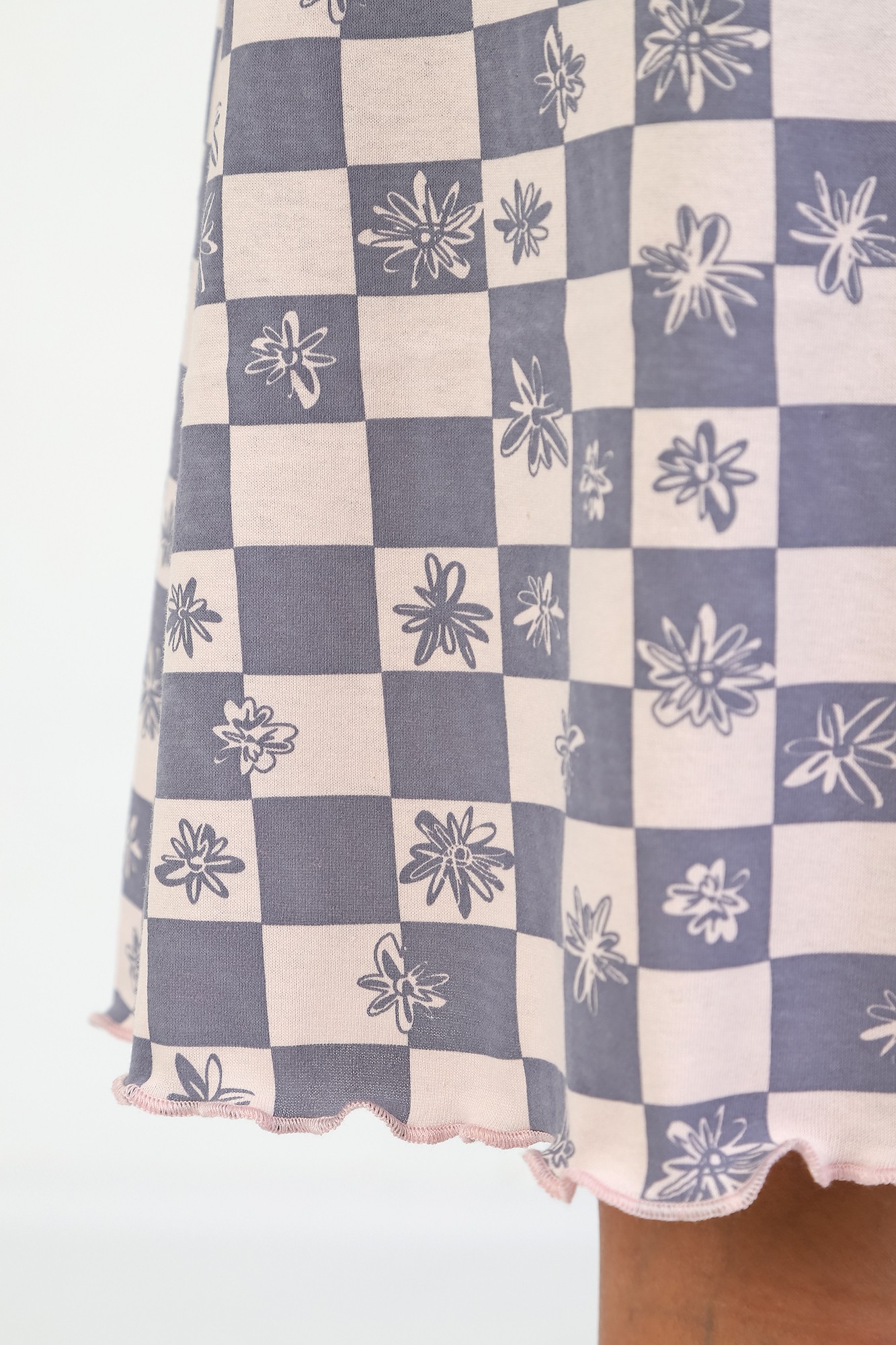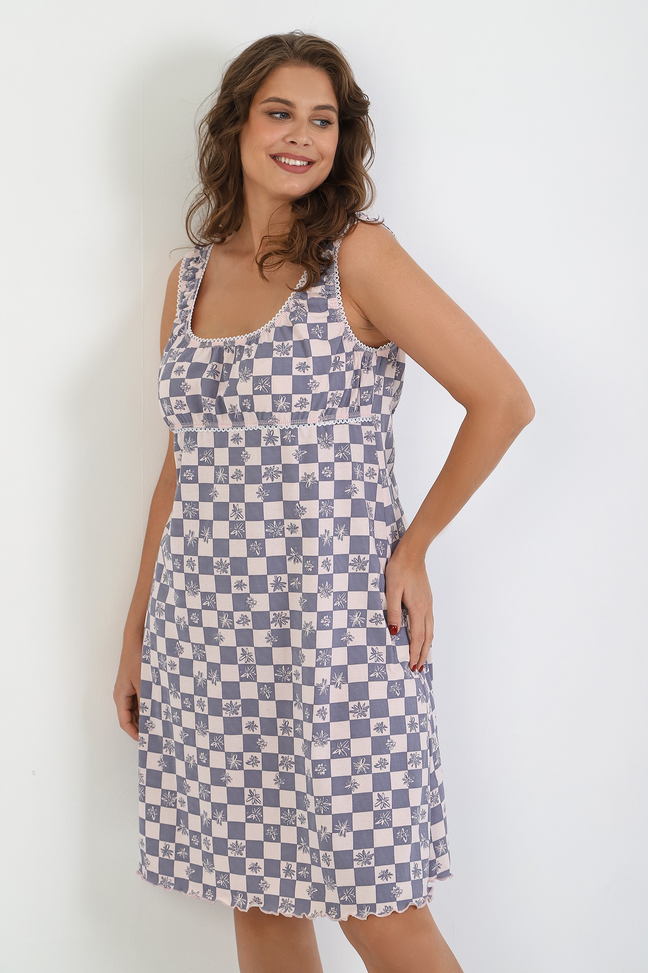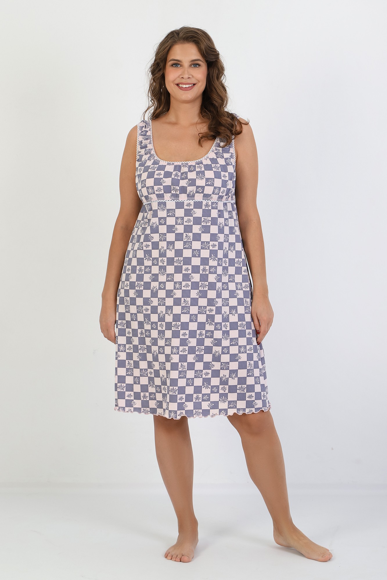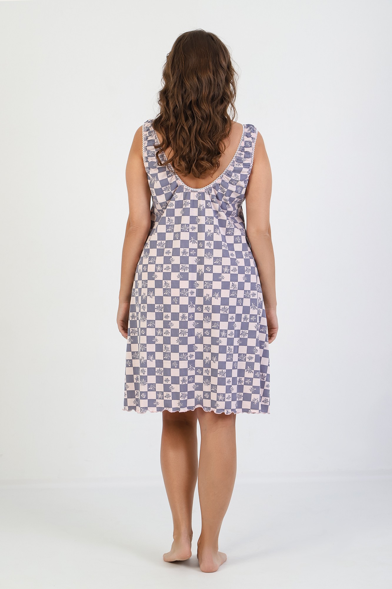 Сорочка женская из трикотажного полотна «кулирка» с набивным рисунком, расширенная книзу, без рукавов, с расширенной, углубленной горловиной овальной формы и притачной кокеткой по переду. Срезы пройм и горловины, а также шов притачивания кокетки, обработаны фасонной эластичной тесьмой с кружевным краем. Низ изделия обработан узкой обметочной строчкой.