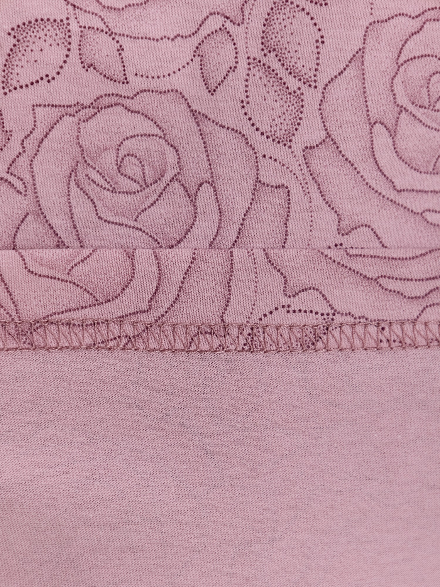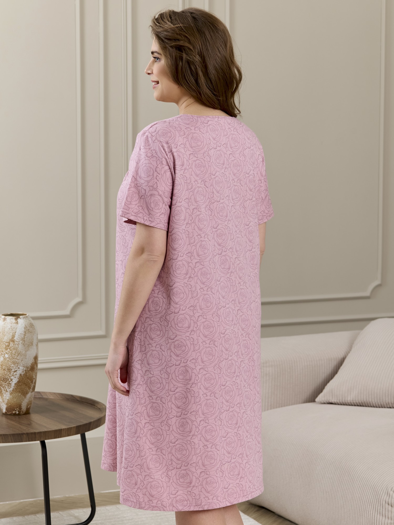 Сорочка женская из трикотажного полотна «кулирка» с набивным рисунком, свободного кроя, слегка расширенная книзу, с короткими втачными рукавами. Полочка – с двойными кокетками, кружевом в шве соединения кокеток с основной деталью и декоративной вставкой «петлей» для достижения небольшого эффекта драпировки. Основная деталь переда присборена по шву притачивания кокетки.