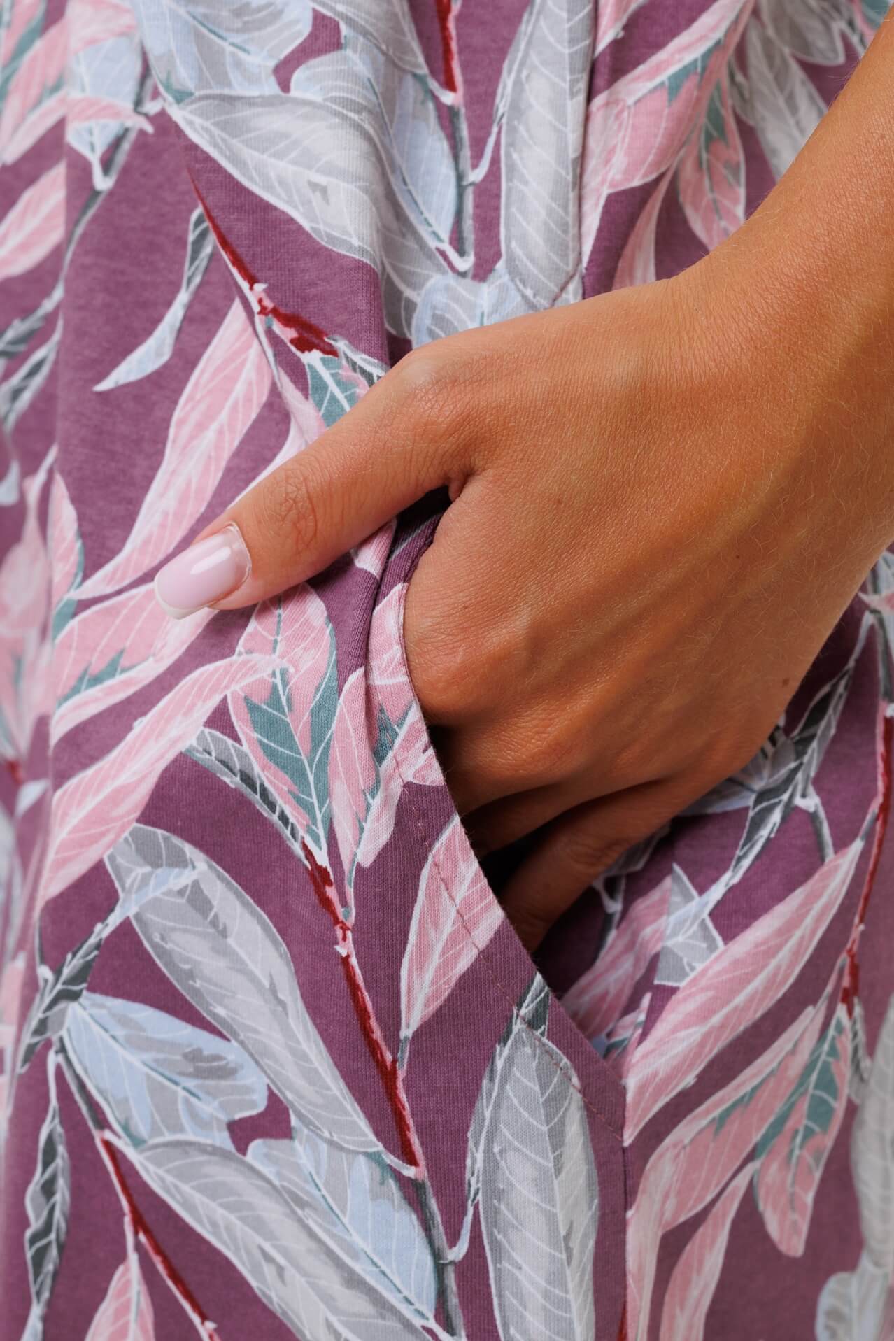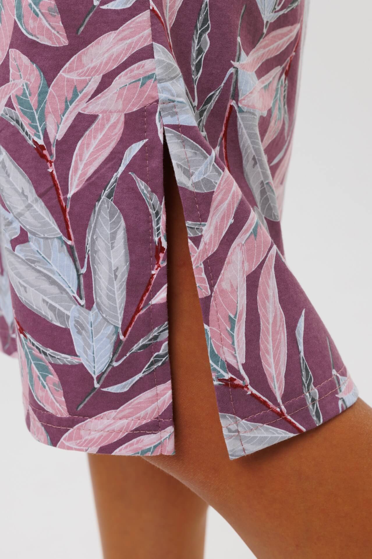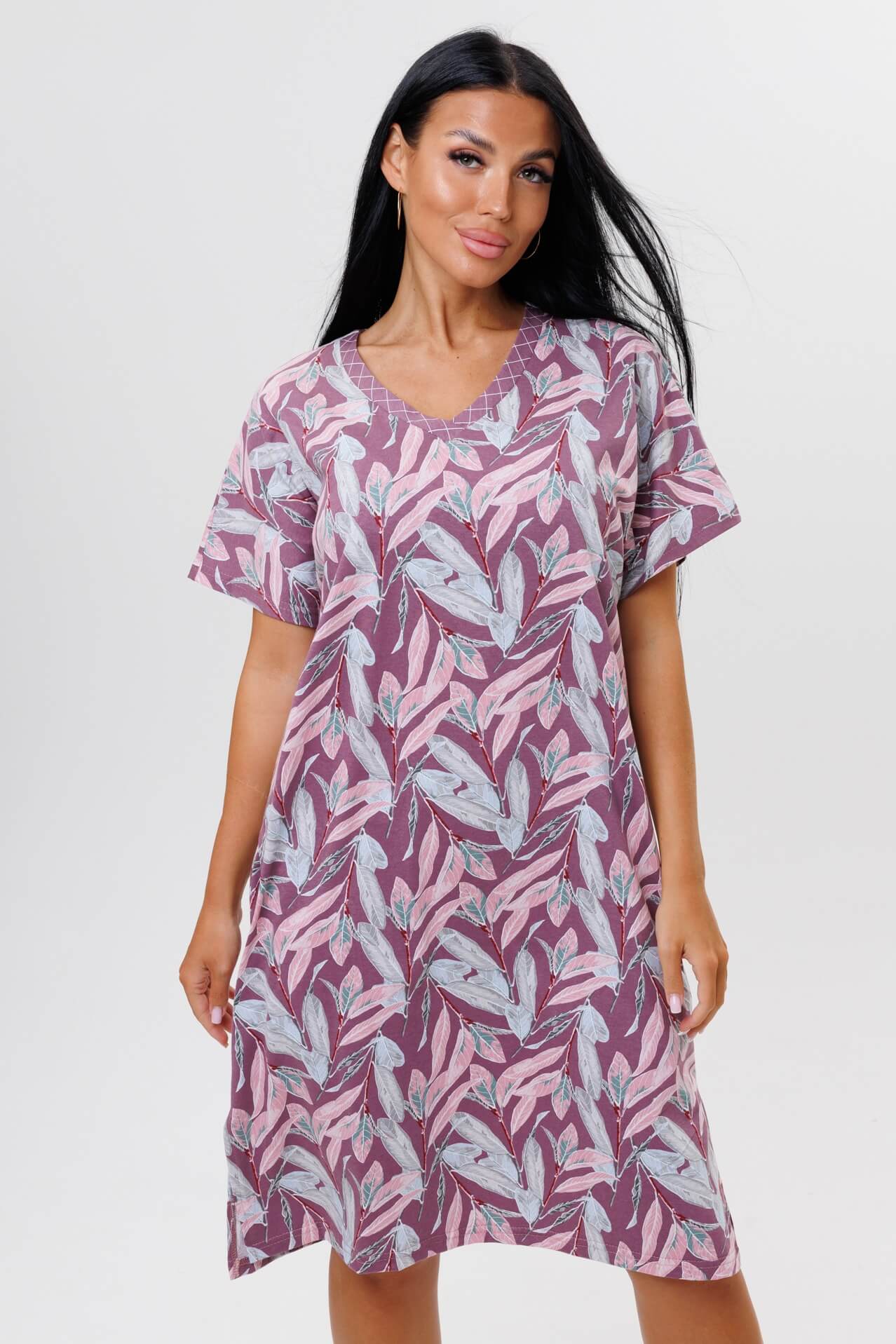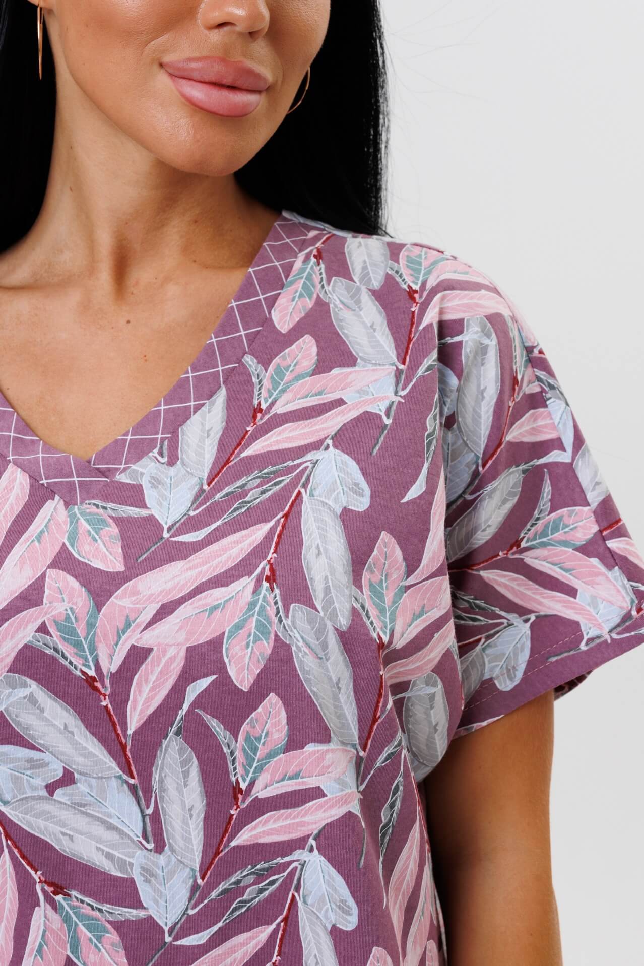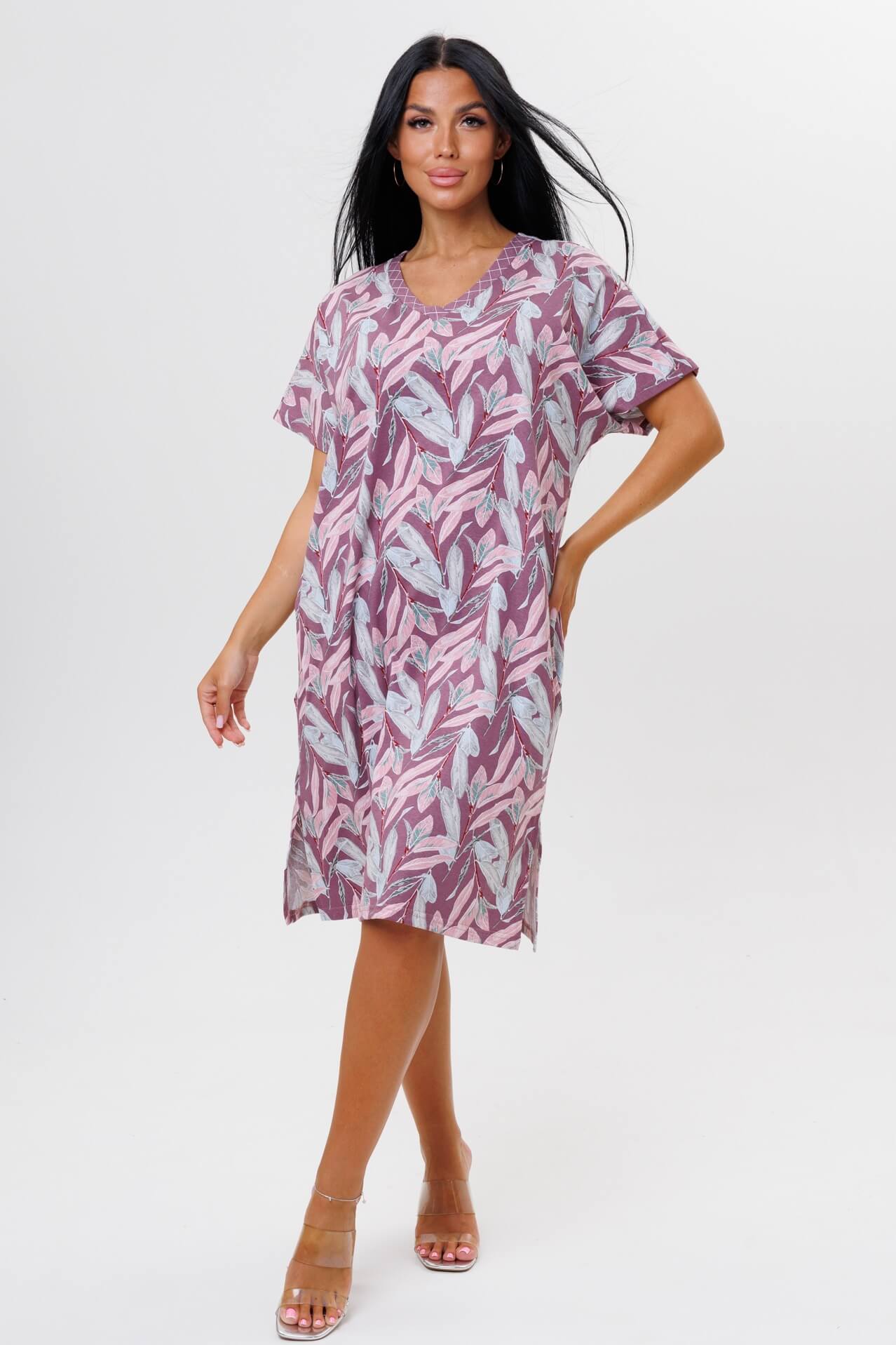Туника 2045/1 / Брусничный свободного кроя выполнена из кулирки. V-образный вырез отделан тканью компаньоном. Длина чуть ниже колена. Короткий рукав слегка спущен. По бокам карманы и разрезы.