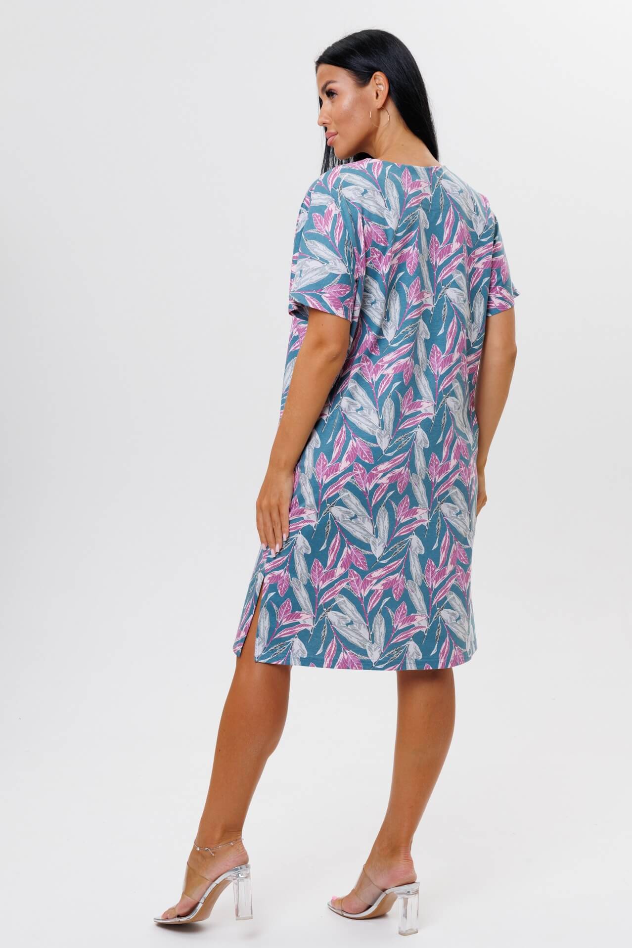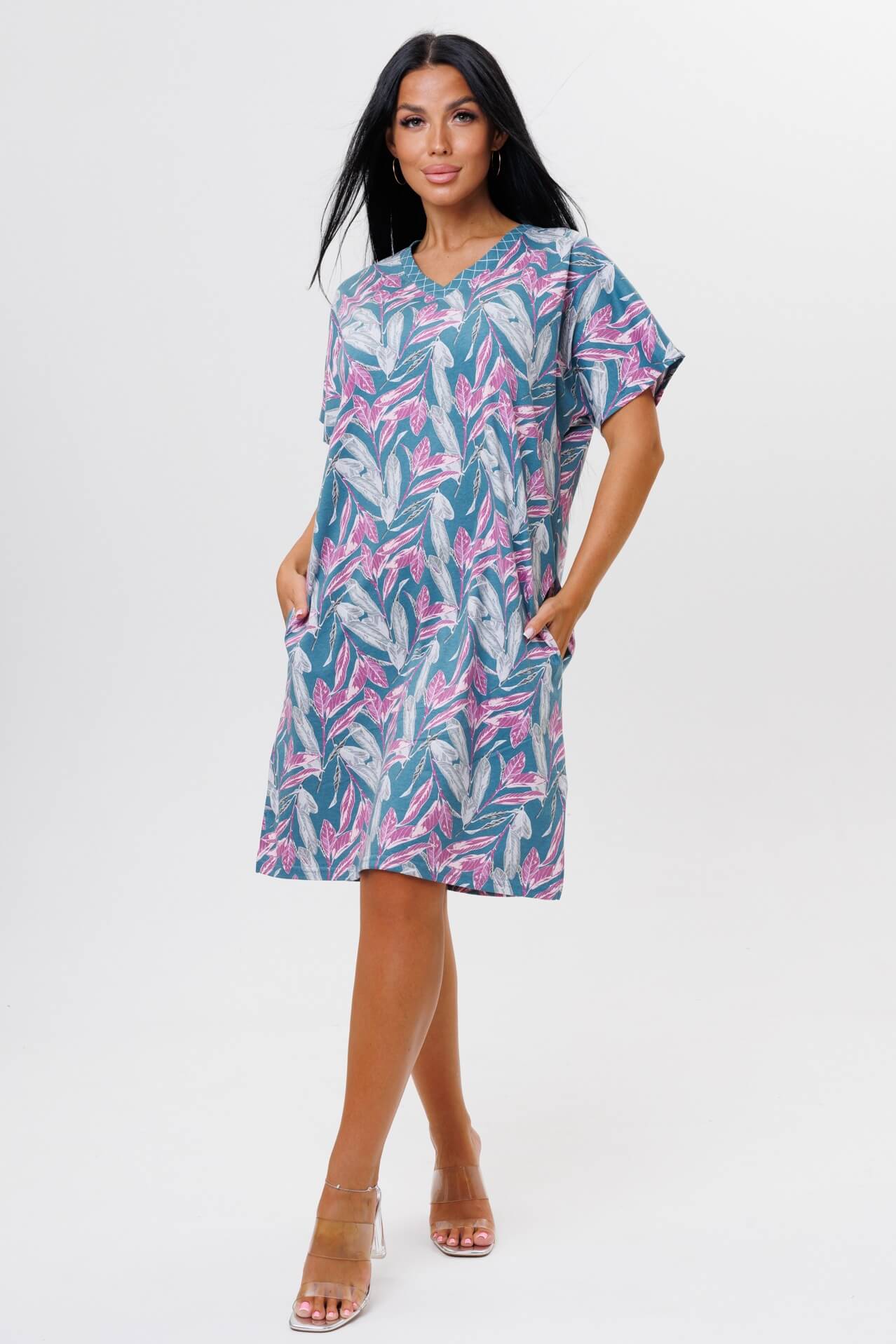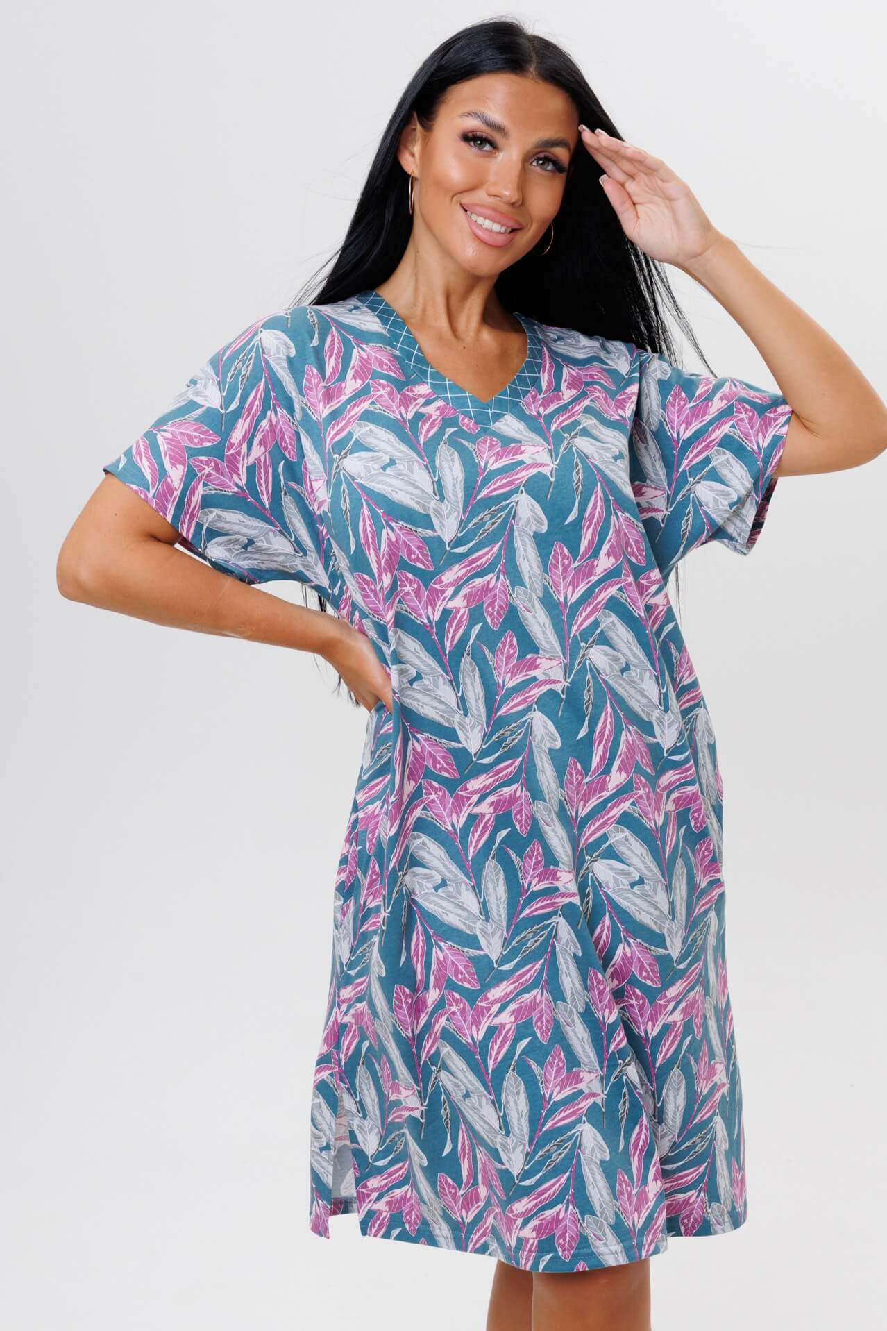 Туника 2045 / Петроль свободного кроя выполнена из кулирки. V-образный вырез отделан тканью компаньоном. Длина чуть ниже колена. Короткий рукав слегка спущен. По бокам карманы и разрезы.