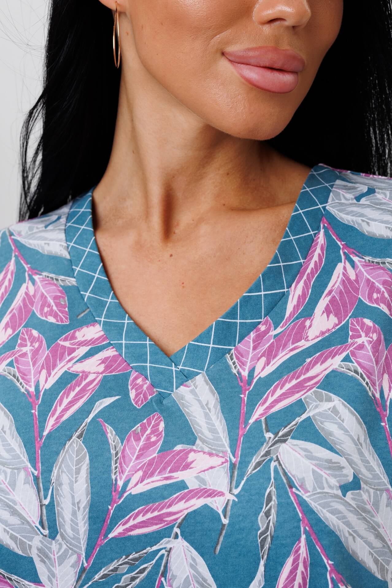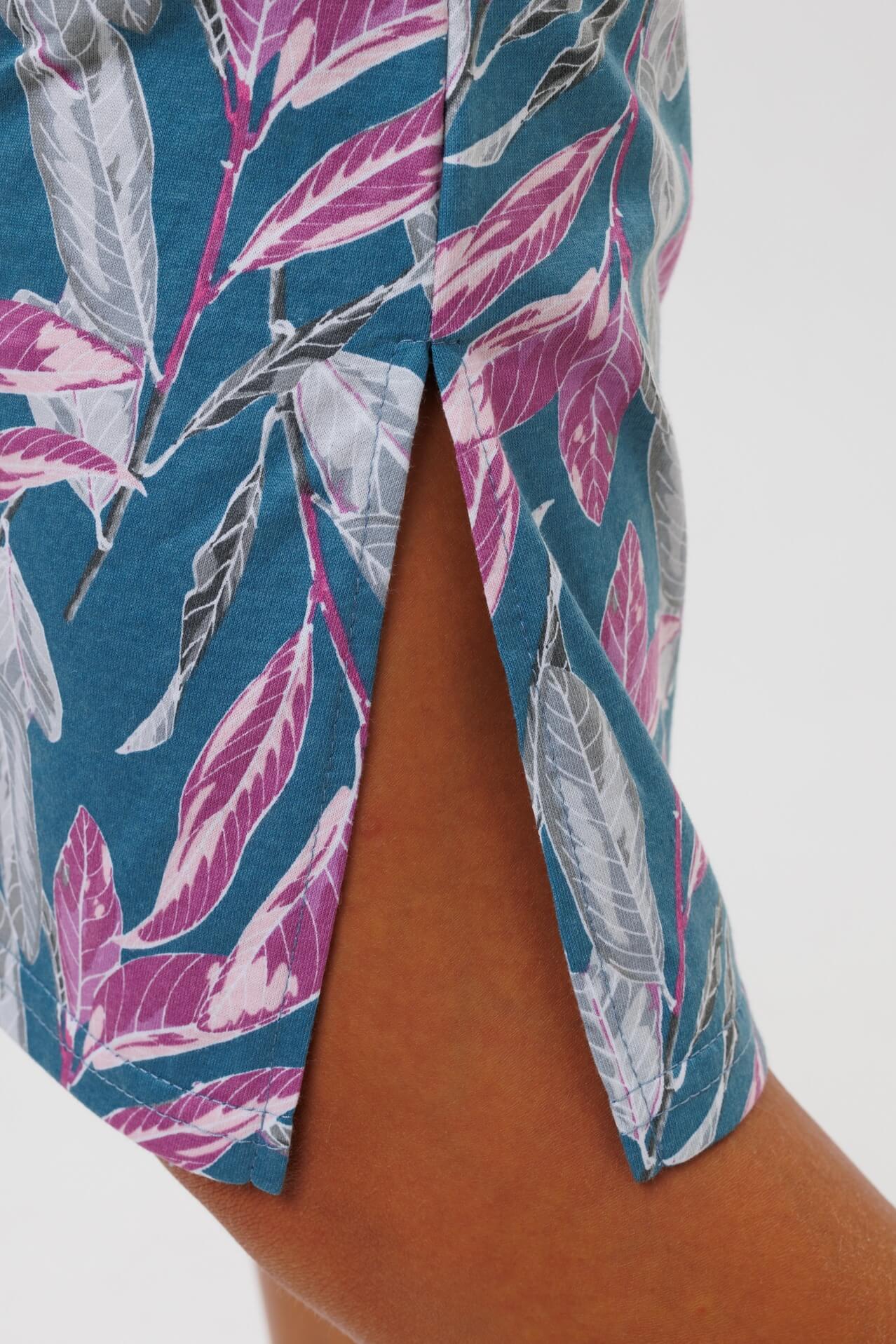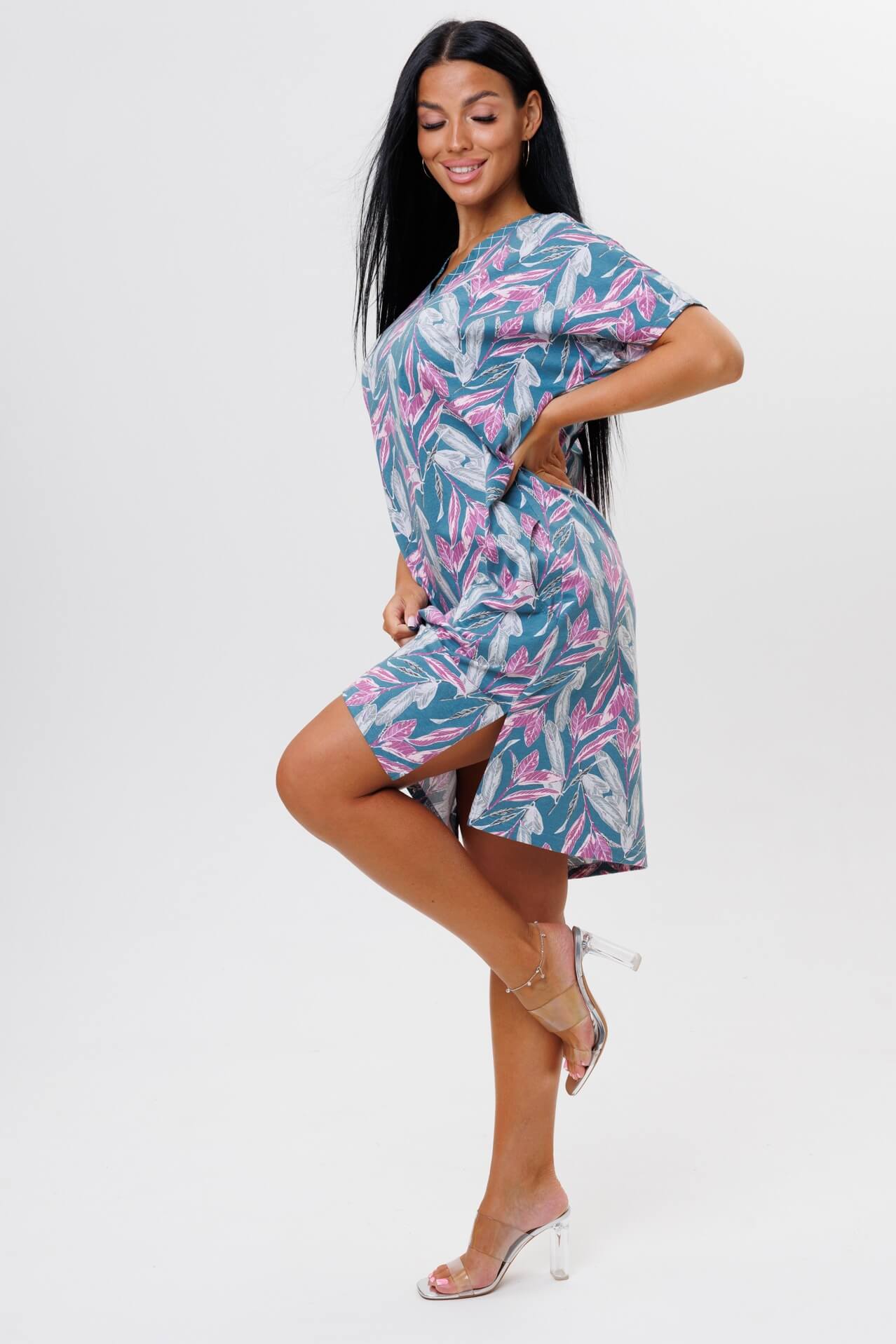 Туника 2045 / Петроль свободного кроя выполнена из кулирки. V-образный вырез отделан тканью компаньоном. Длина чуть ниже колена. Короткий рукав слегка спущен. По бокам карманы и разрезы.