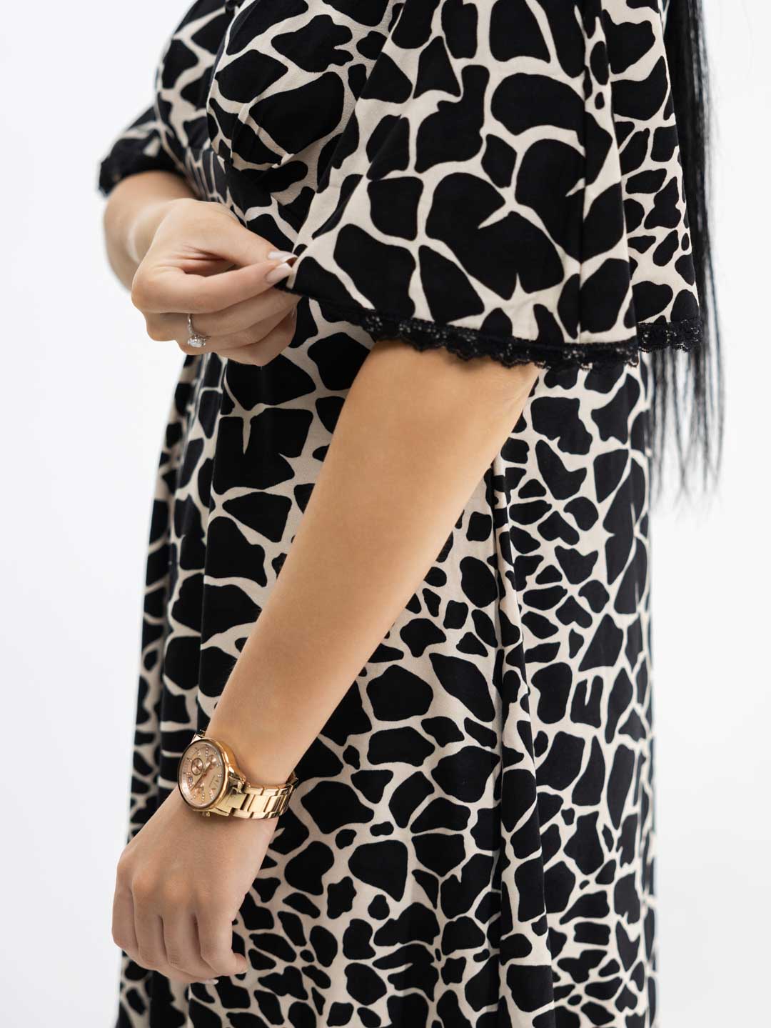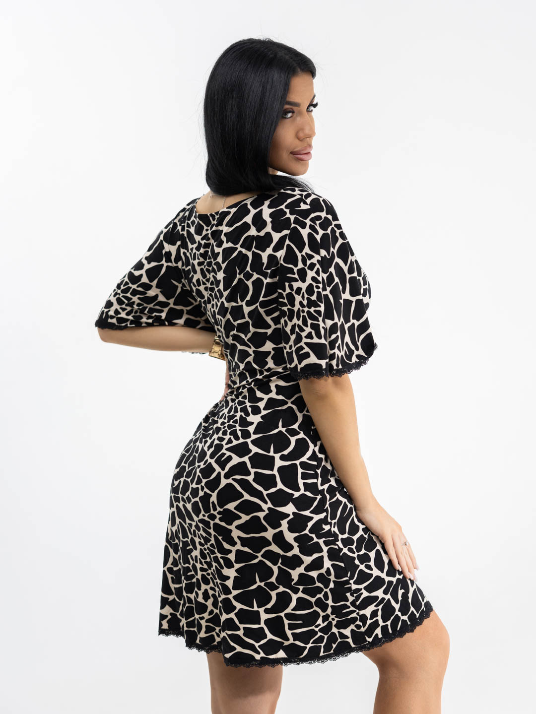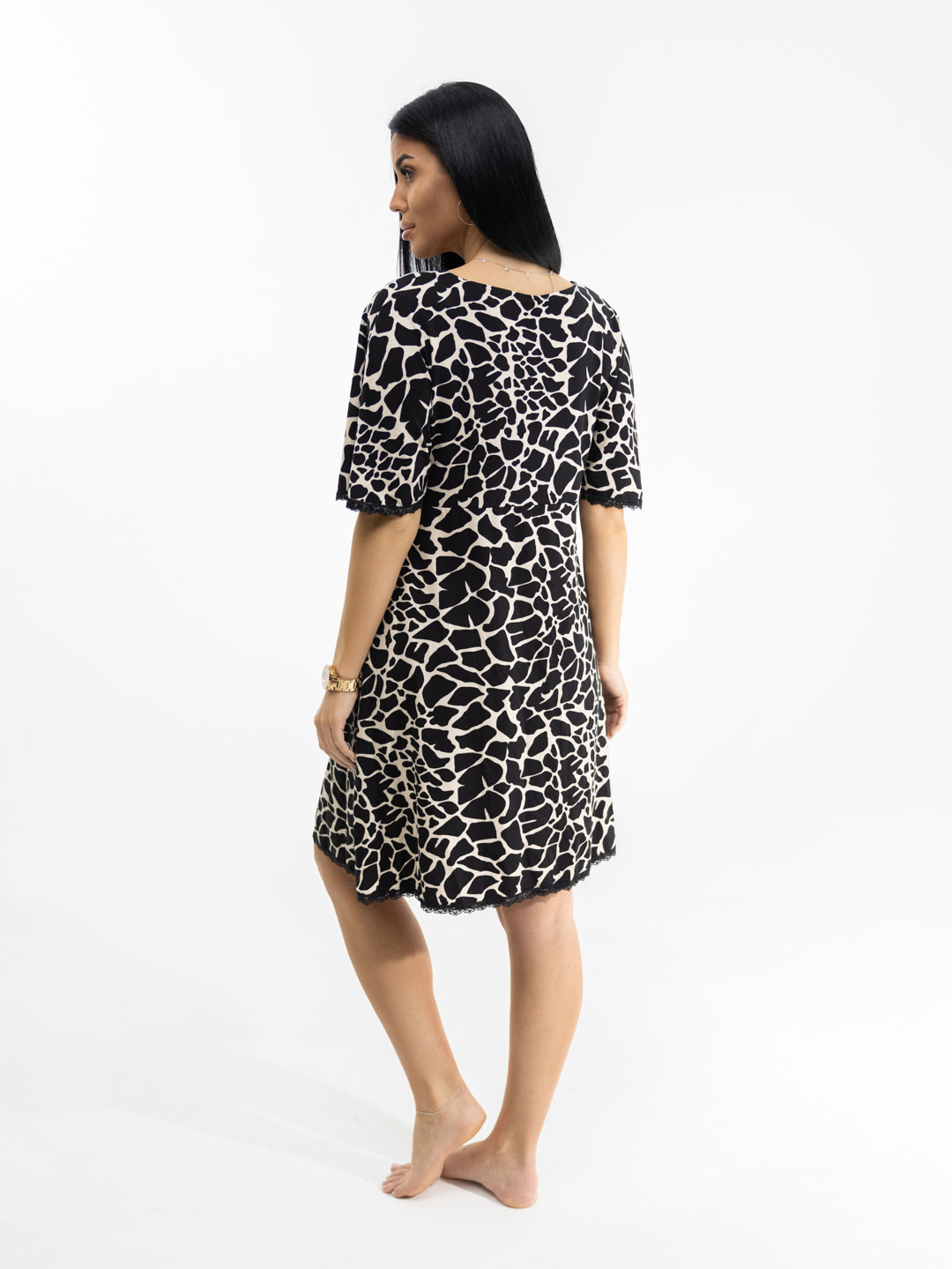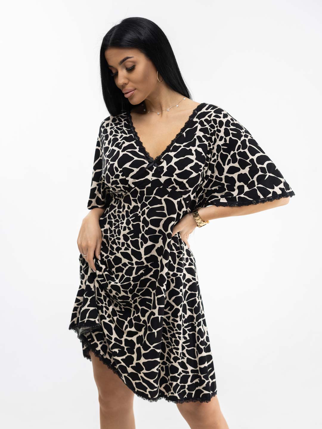 Туника женская мод.1999/4 / Бежевый из мягкого, приятного к телу трикотажа. Длина изделия до уровня колена. Рукав - спущенный, короткий. Вырез горловины V-образный. Нижняя часть домашнего платья, рукава и горловина имеют отделку кружевом.