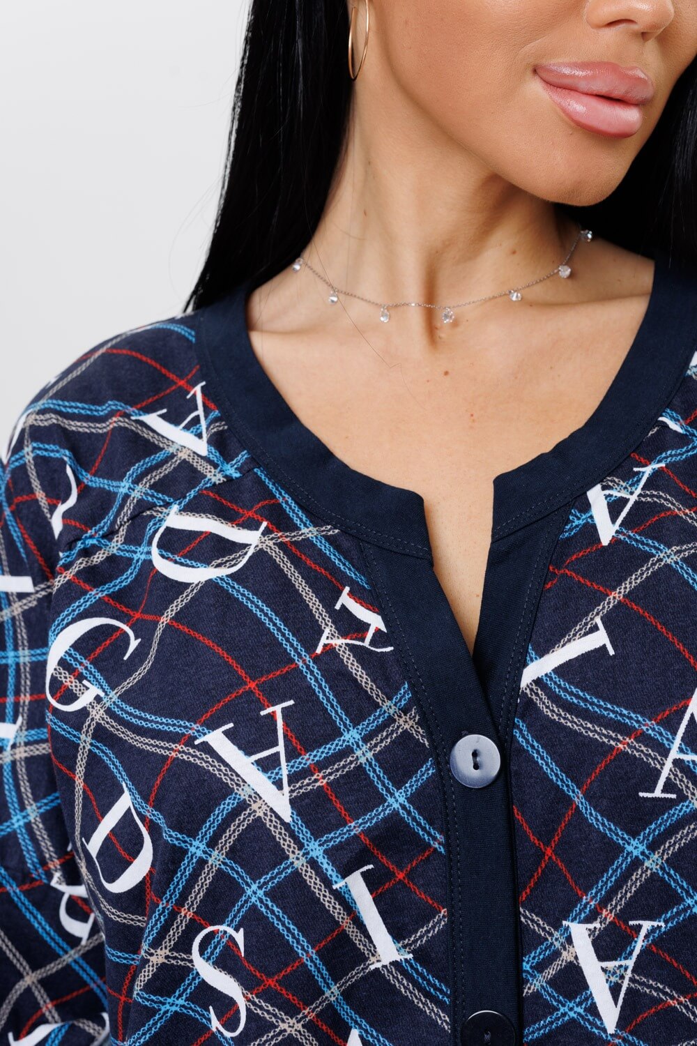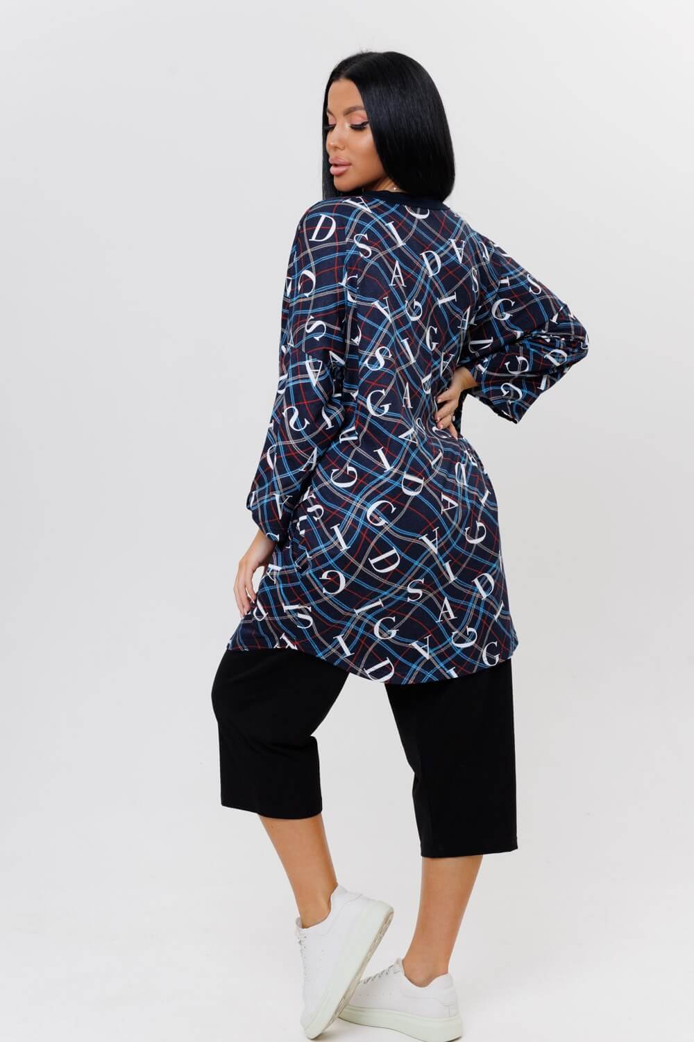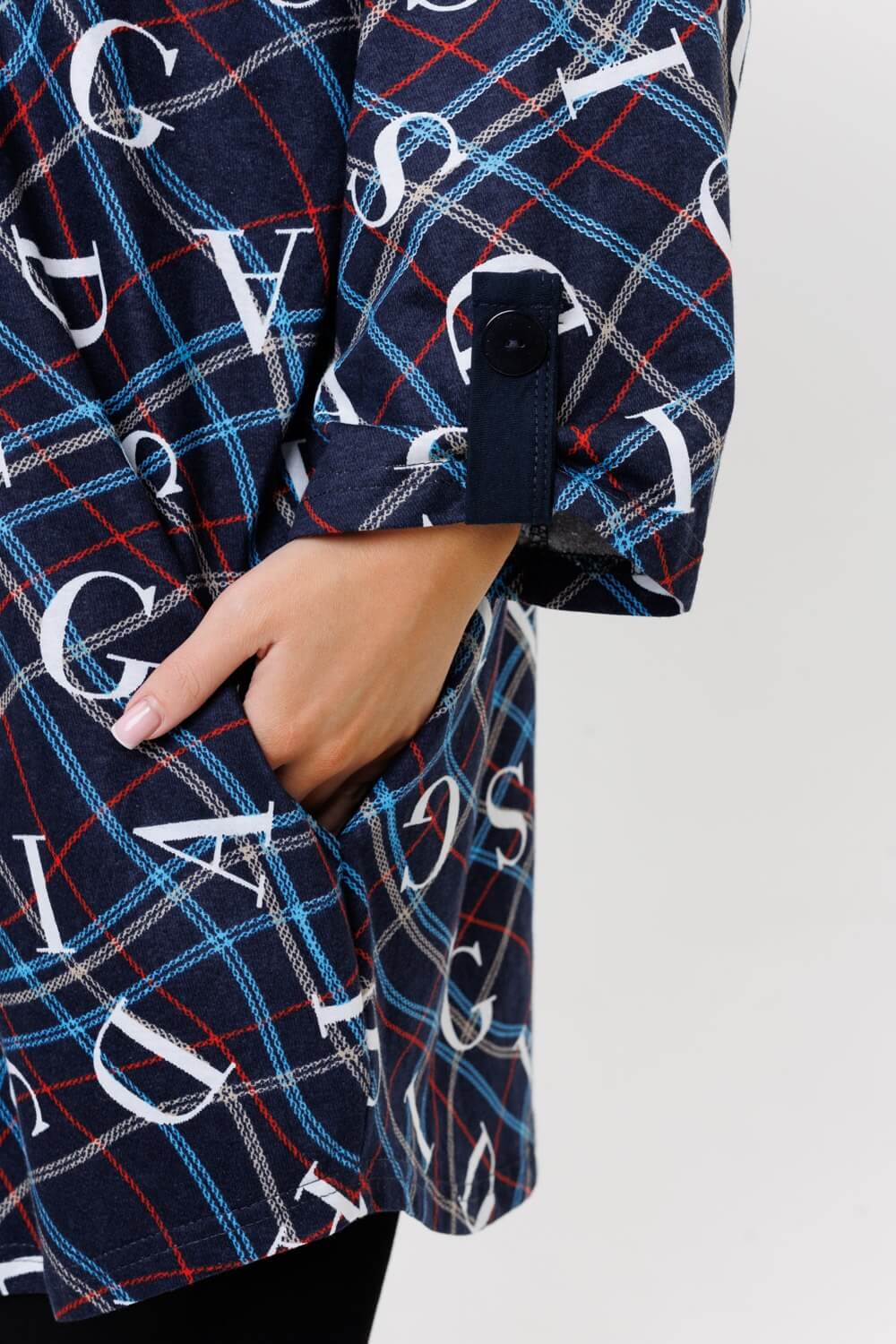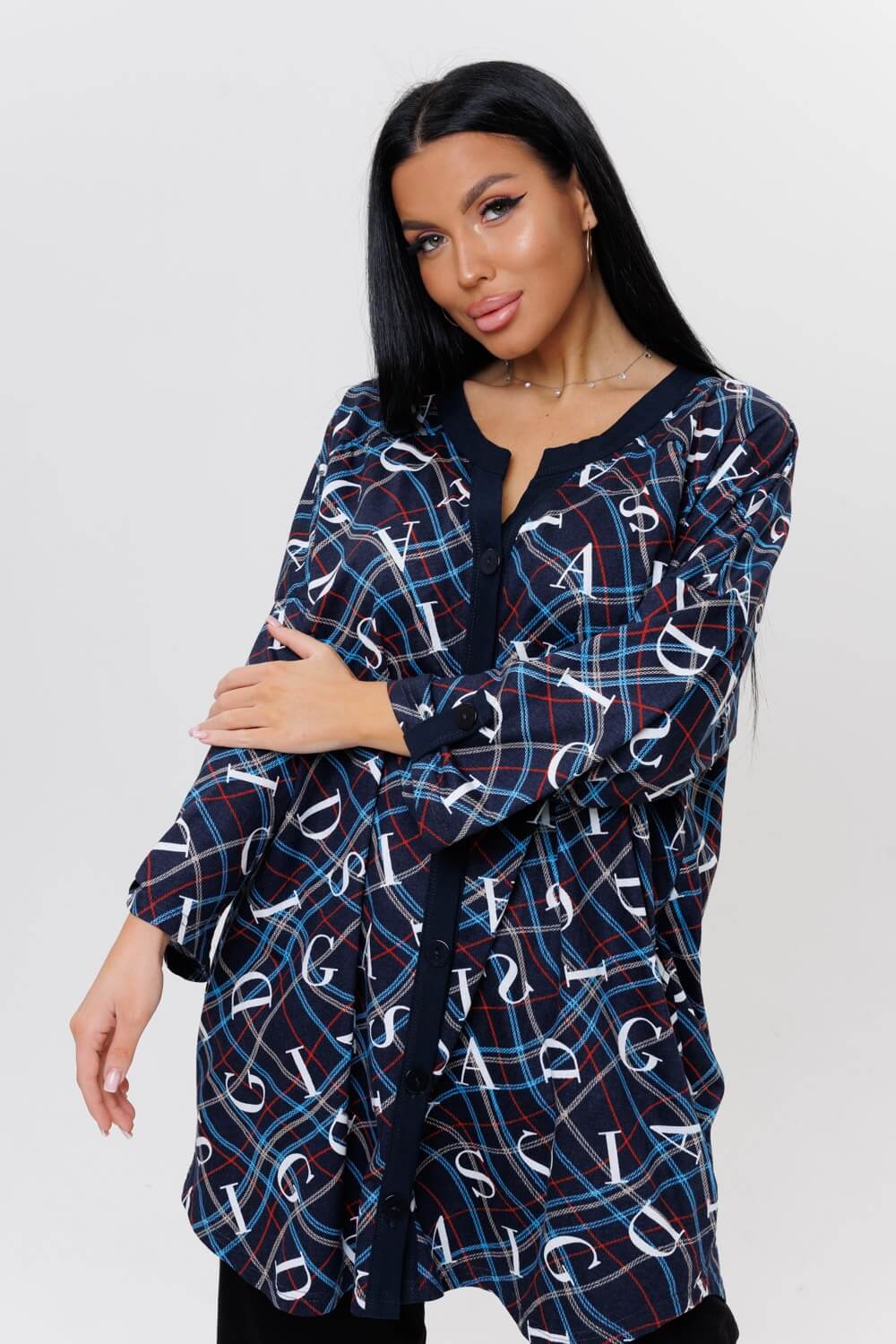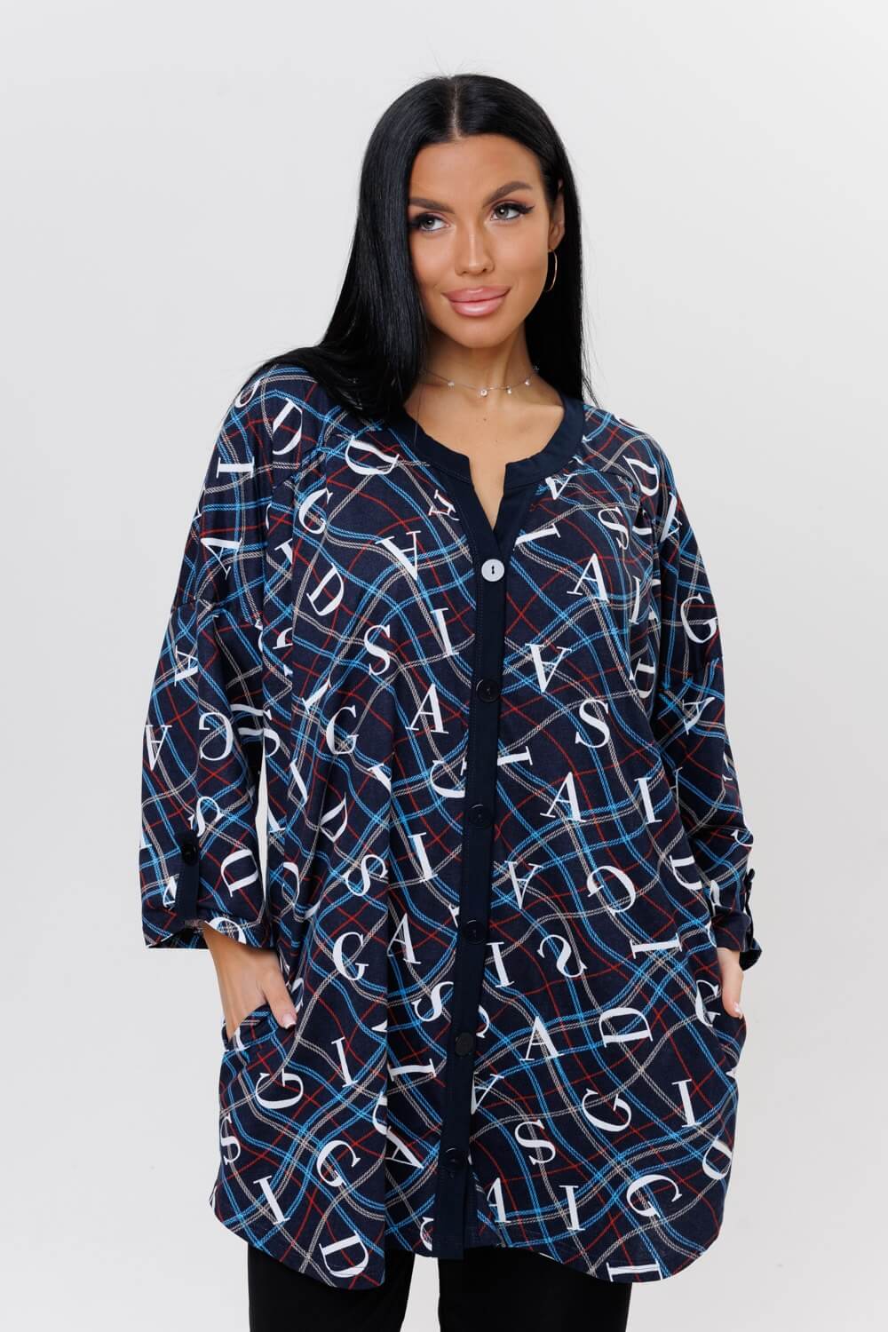 Стильная туника 2126 / Темно-синий прямого силуэта сшита из натурального хлопка. Ткань гигроскопична и быстро сохнет. Туника имеет свободный силуэт, округлую горловину с V-образным вырезом, переходящий в планку на пуговицах, выполненную из ткани компаньона. Удлиненная трикотажная туника подойдет как для дома, офиса и отдыха, а также для беременных.
