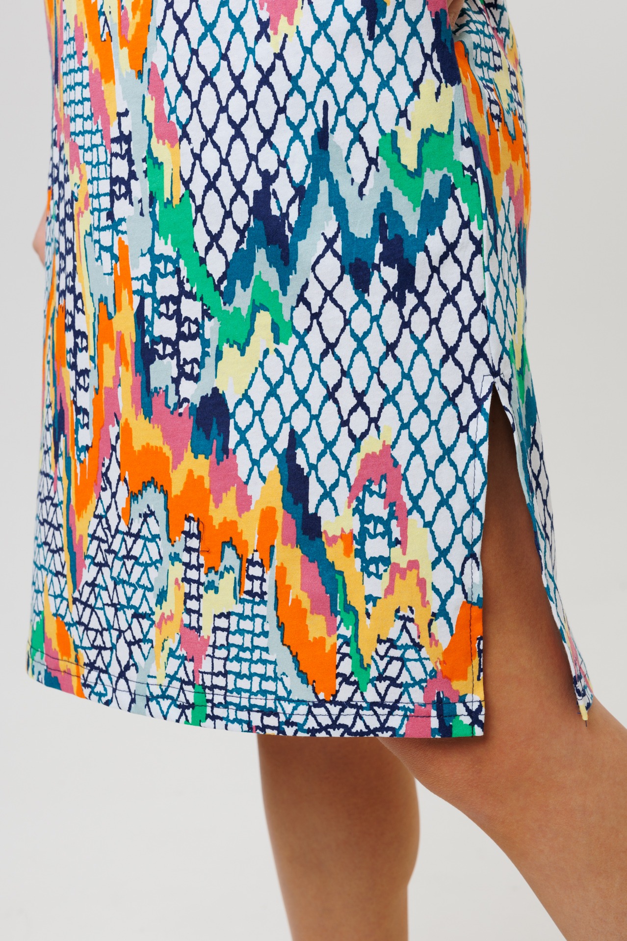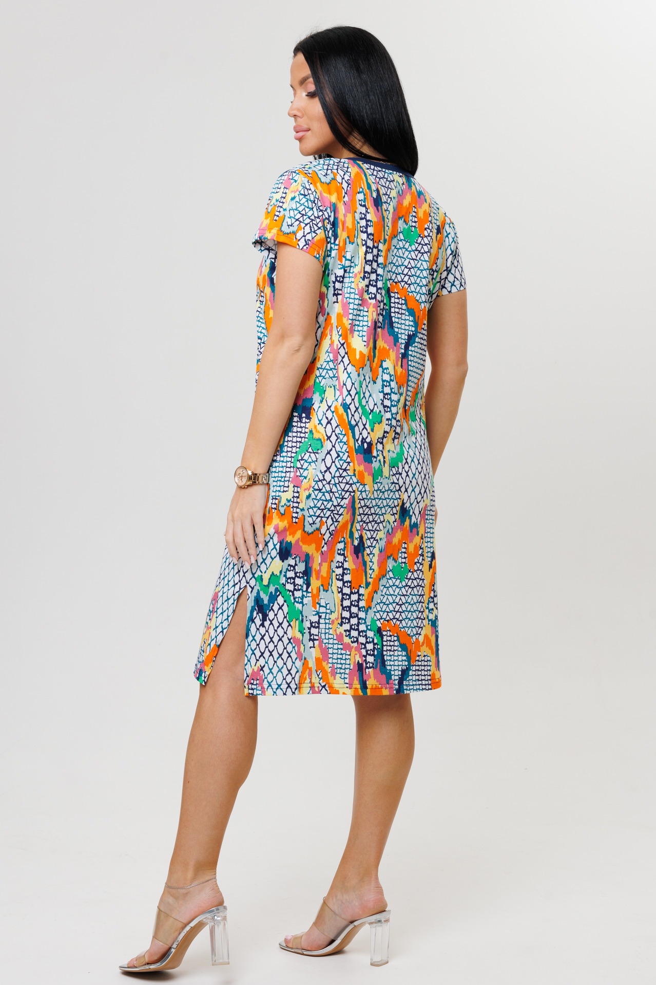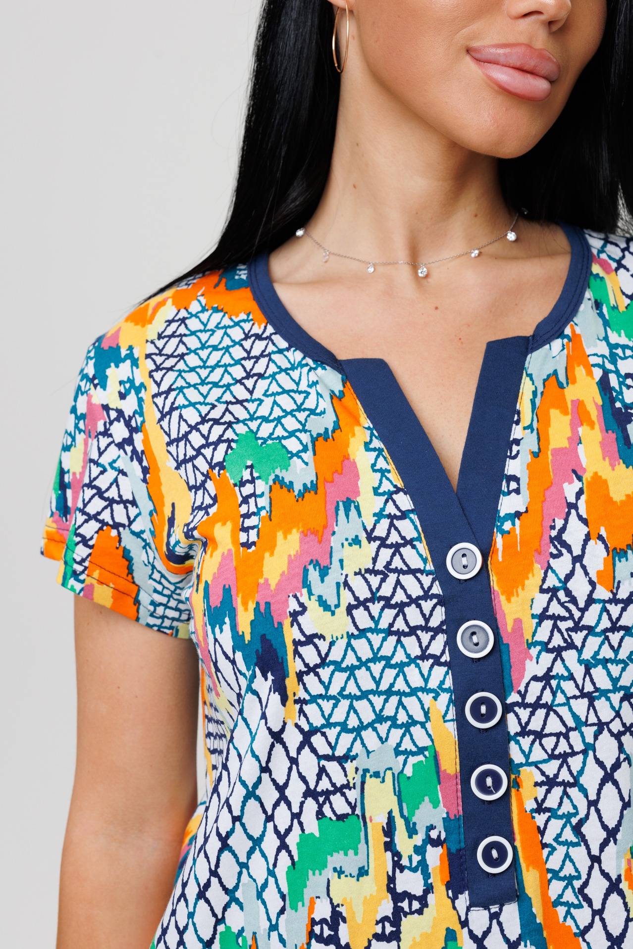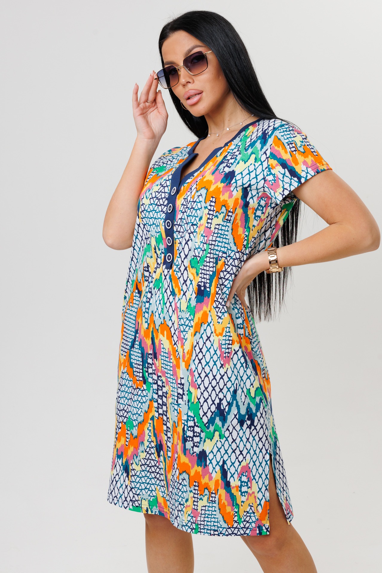 Туника 2160/1 / Петроль прямого кроя выполнена из кулирки. Фигурный V-образный вырез отделан тканью компаньоном, имеет застежку на пуговицы. Длина чуть ниже колена, короткий рукав, по бокам разрезы.