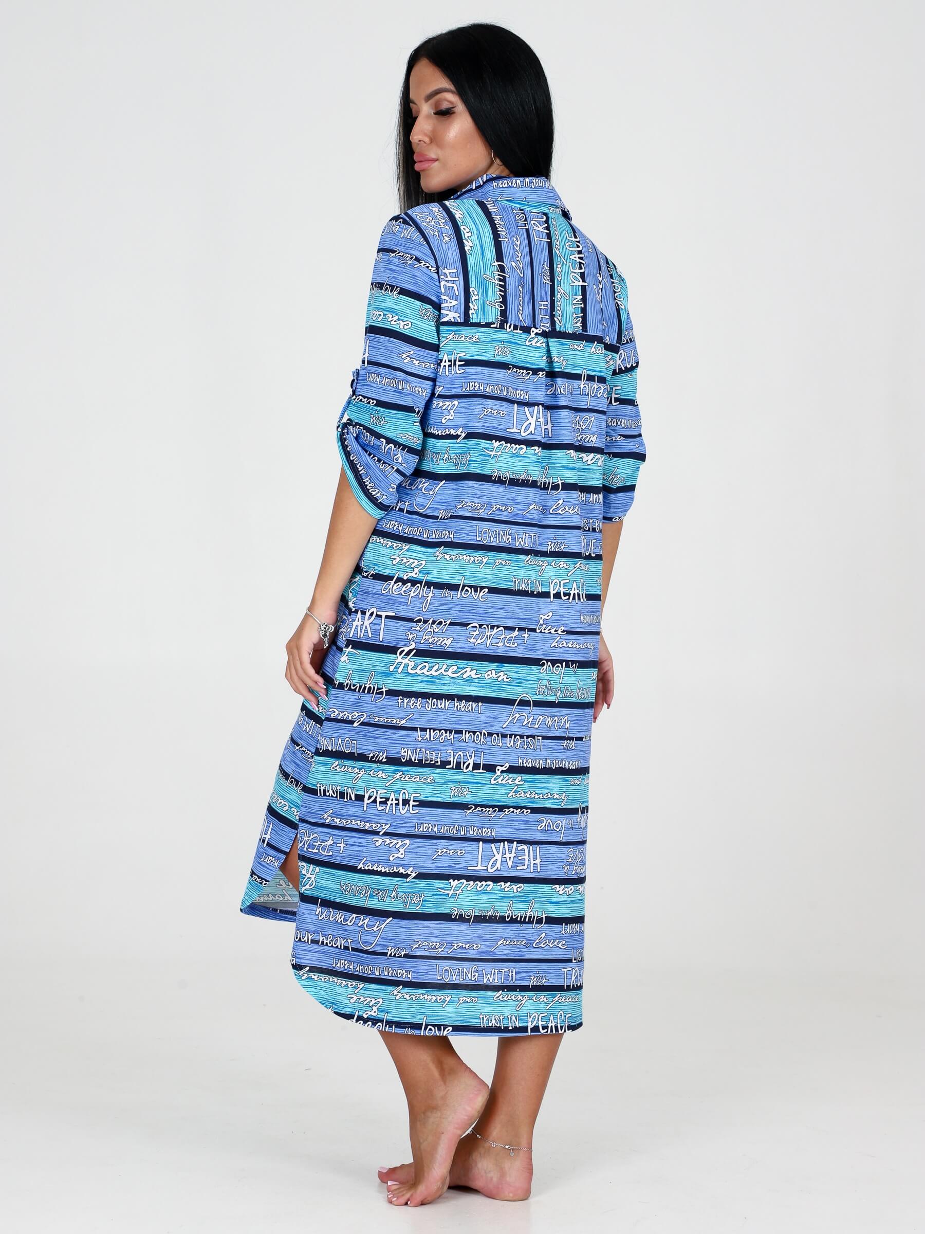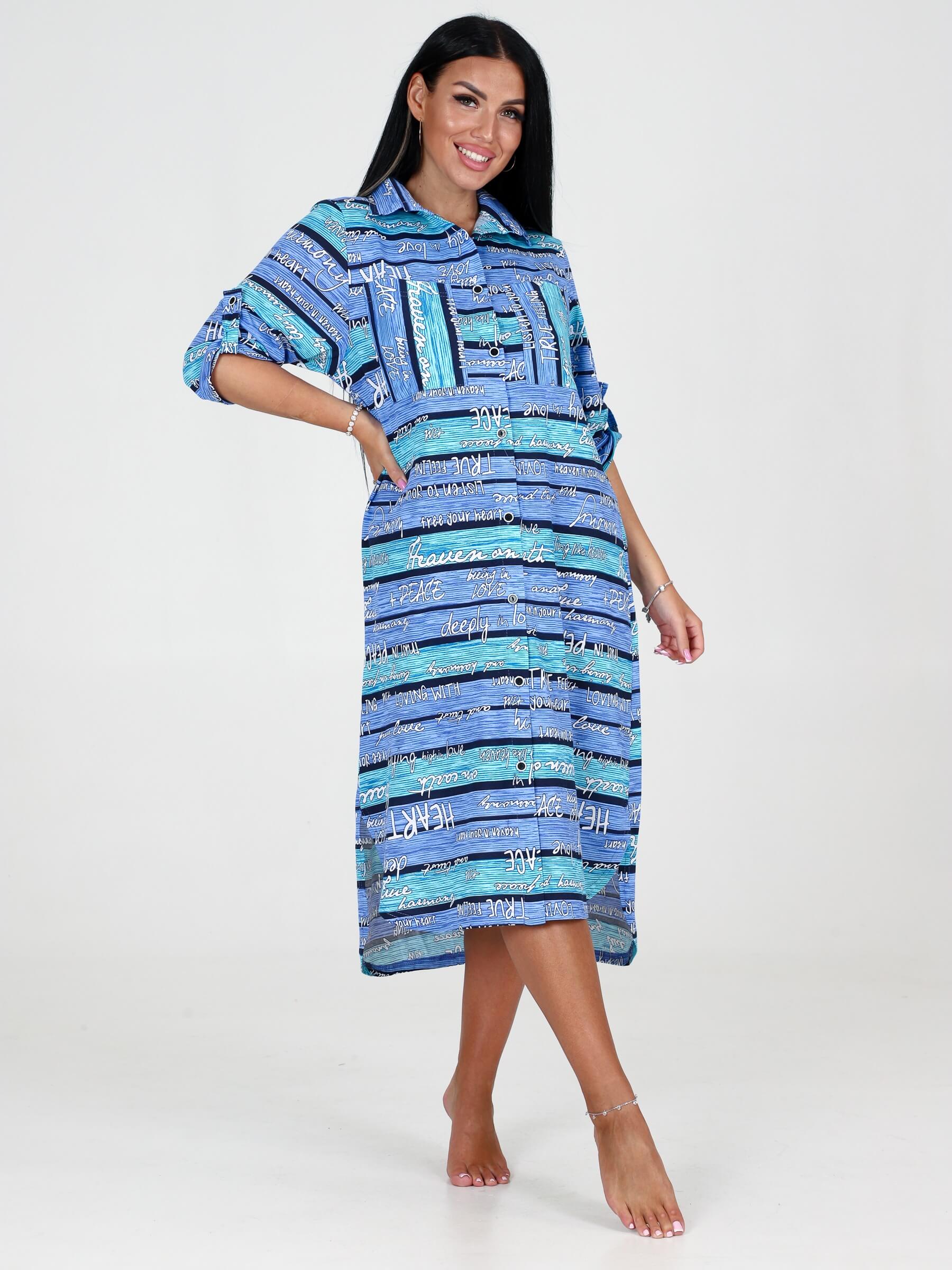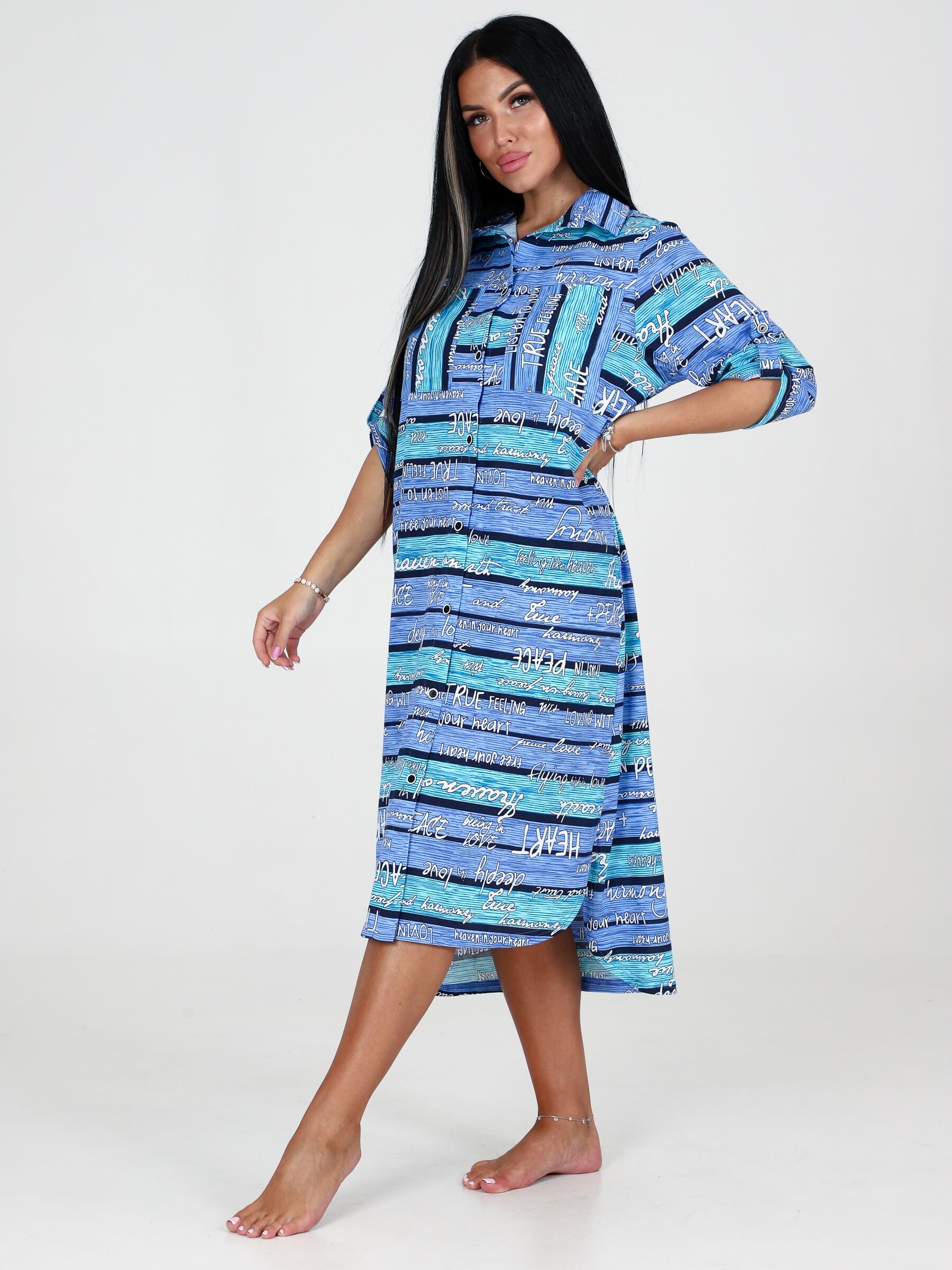 Туника трикотажная МИДИ ТК-25 / Бирюзово-голубая полоса, текст универсальна, ее можно носить также как платье, халат или удлиненную рубашку. Туника свободного кроя, с рукавами 3/4, украшенными патами на пуговицах, имеет разрезы по бокам. Оригинальная туника больших размеров с ассиметричной длиной незаменима как домашняя одежда. Удлиненная туника, халат женский домашний, халат больших размеров, туника- халат на пуговицах отличный вариант для дома, дачи,отдыха, путешествий, прогулок, в санаторий, больницу. Хлопковая ткань (кулирка) очень приятна к телу, и практична. В жару в нашей тунике тело будет дышать, плечи не обгорят, длину рукавов можно смоделировать патами. Трикотажная туника подчеркивает достоинства фигуры и скрывает её недостатки.