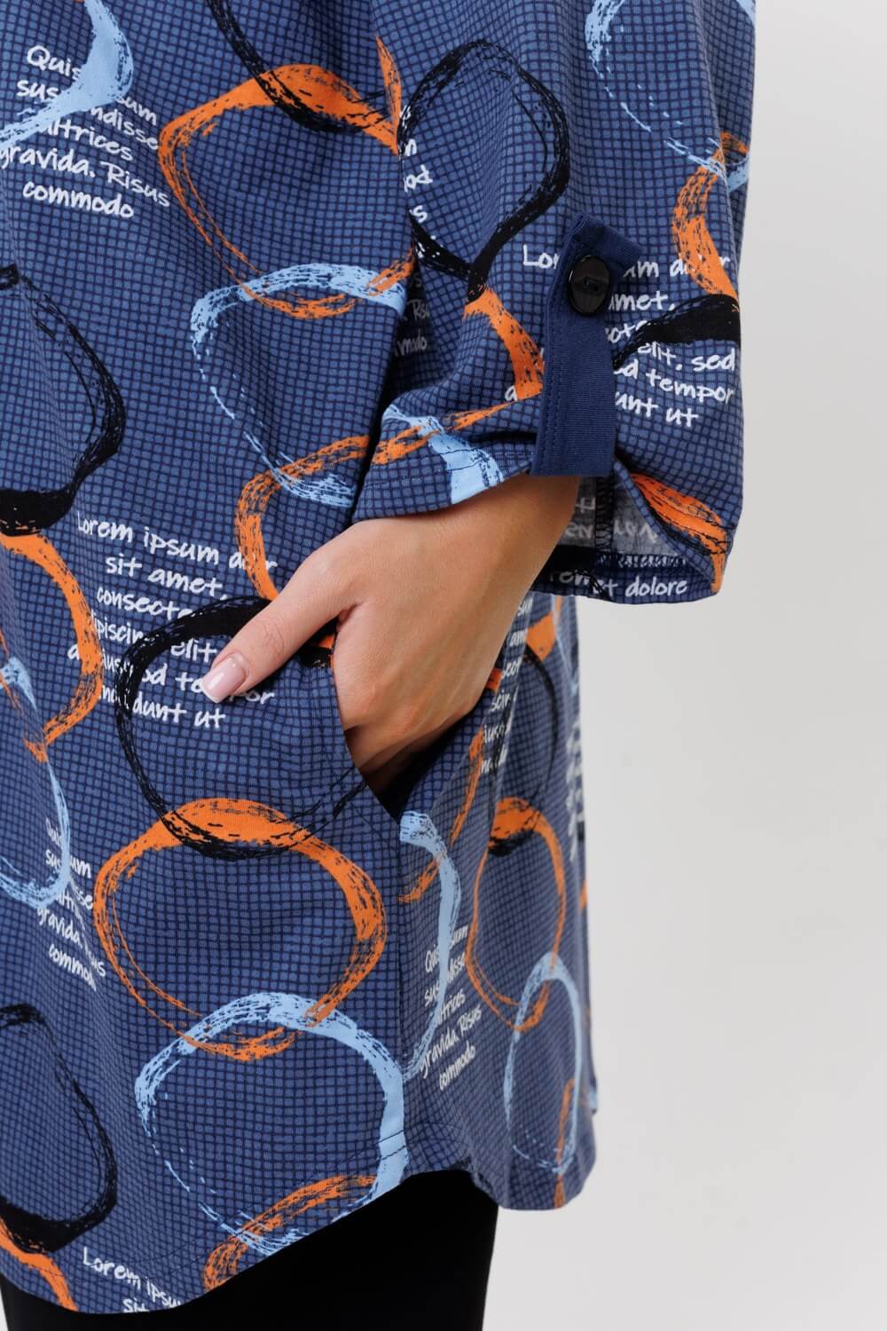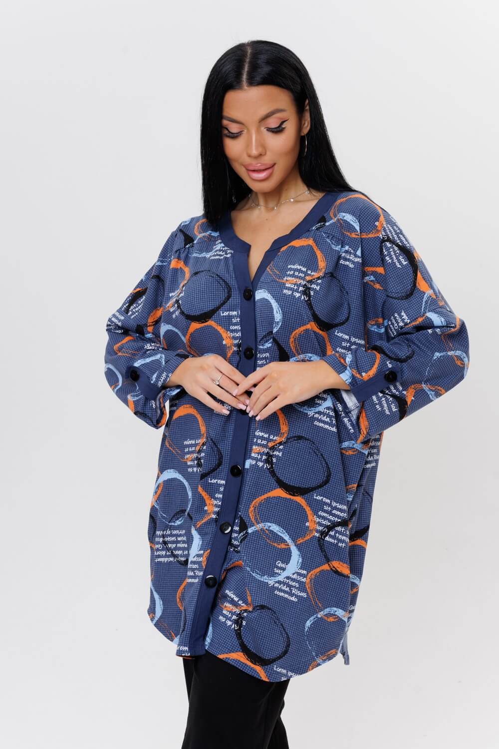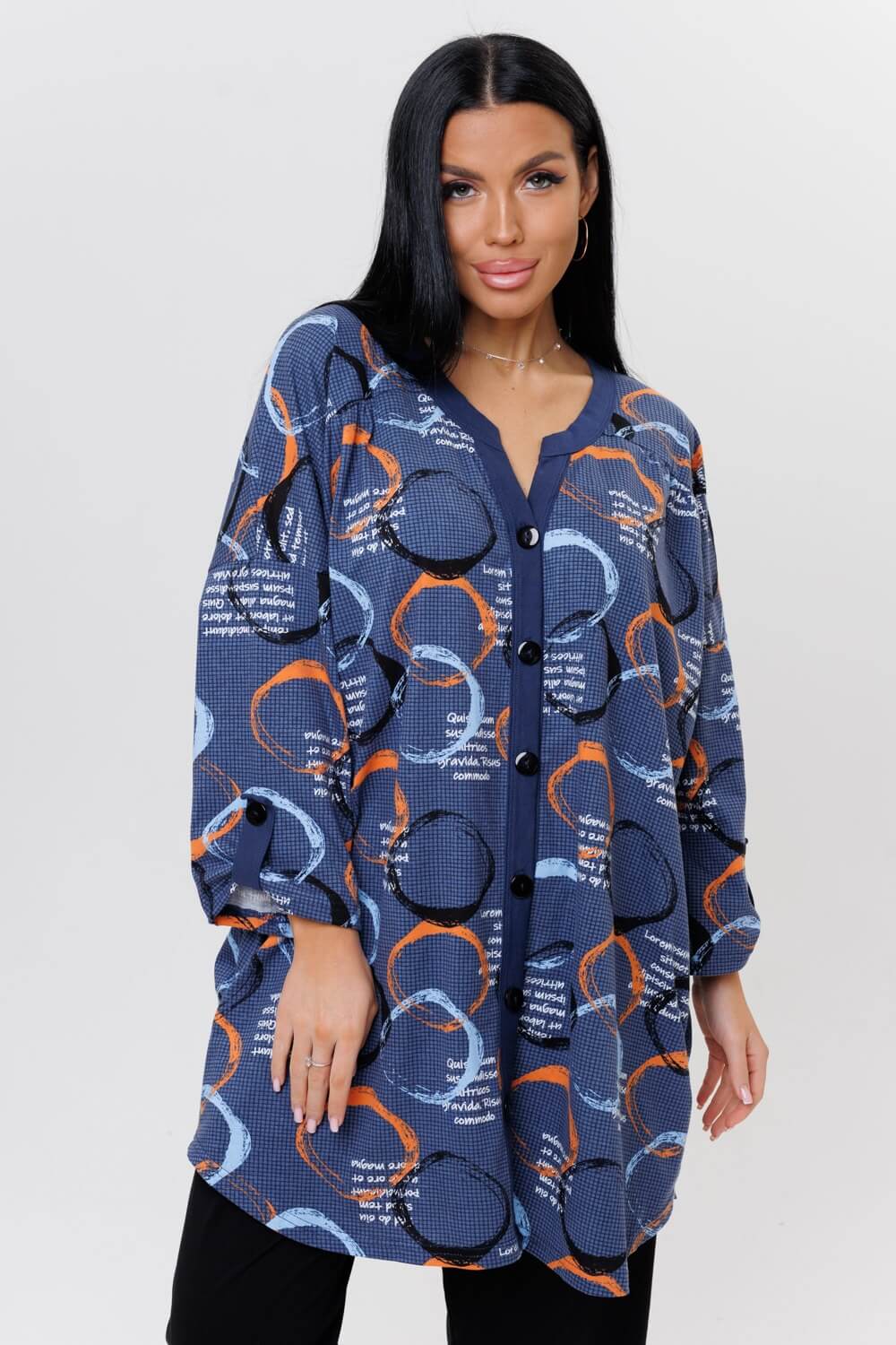 Стильная туника 2126/1 / Индиго прямого силуэта сшита из натурального хлопка. Ткань гигроскопична и быстро сохнет. Туника имеет свободный силуэт, округлую горловину с V-образным вырезом, переходящий в планку на пуговицах, выполненную из ткани компаньона. Удлиненная трикотажная туника подойдет как для дома, офиса и отдыха, а также для беременных.