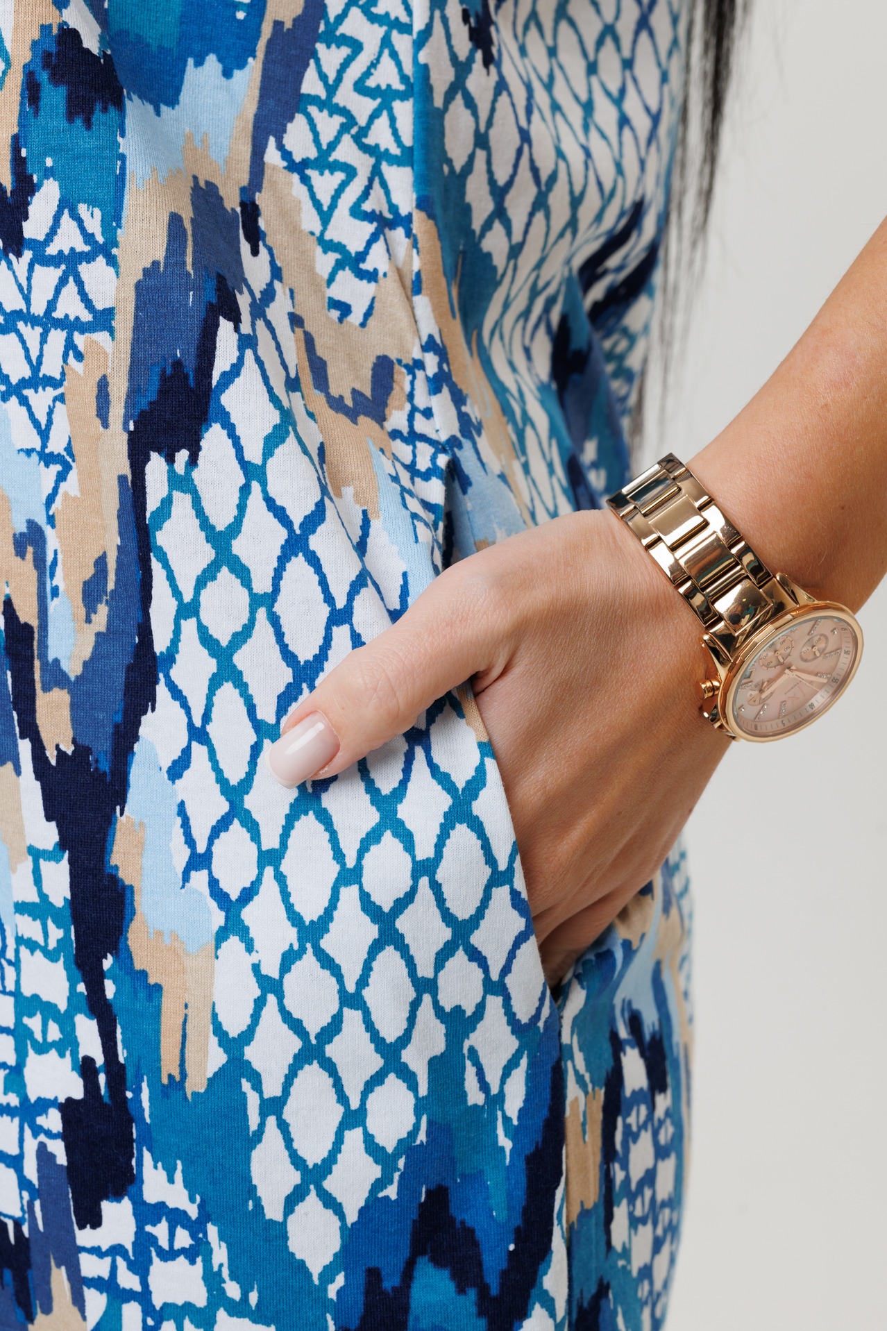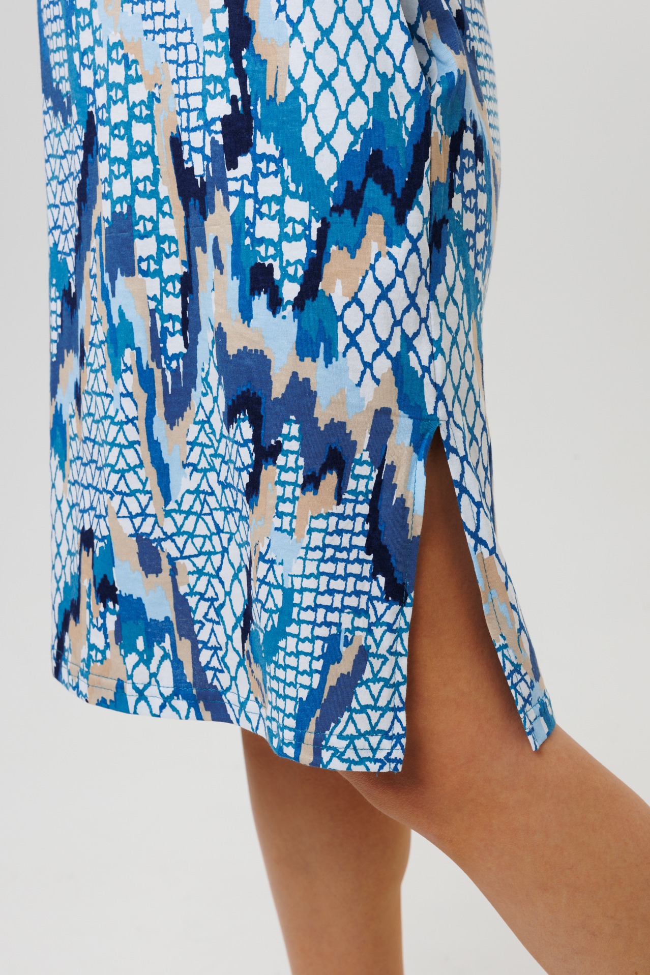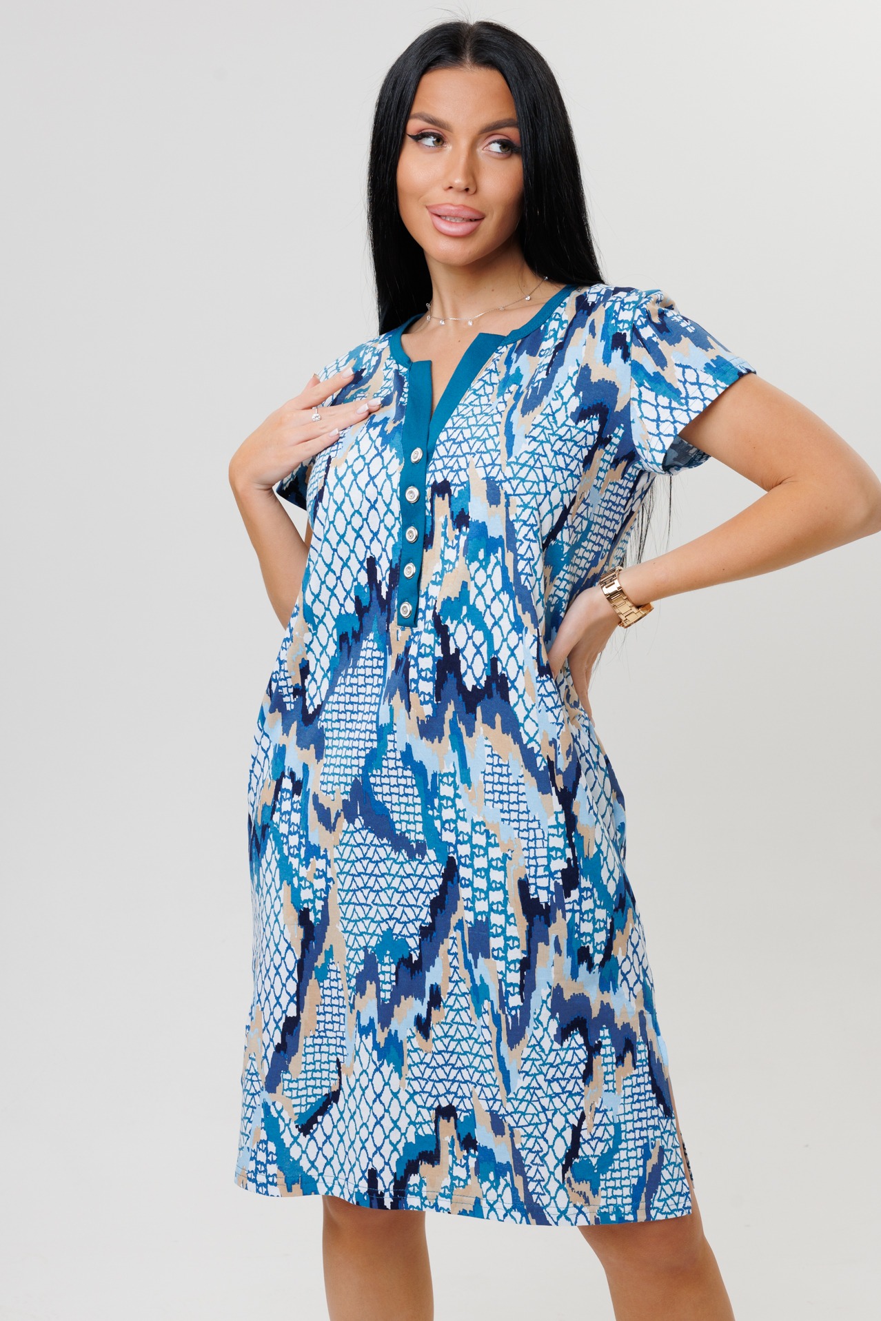Туника 2160 / Индиго прямого кроя выполнена из кулирки. Фигурный V-образный вырез отделан тканью компаньоном, имеет застежку на пуговицы. Длина чуть ниже колена, короткий рукав, по бокам разрезы.