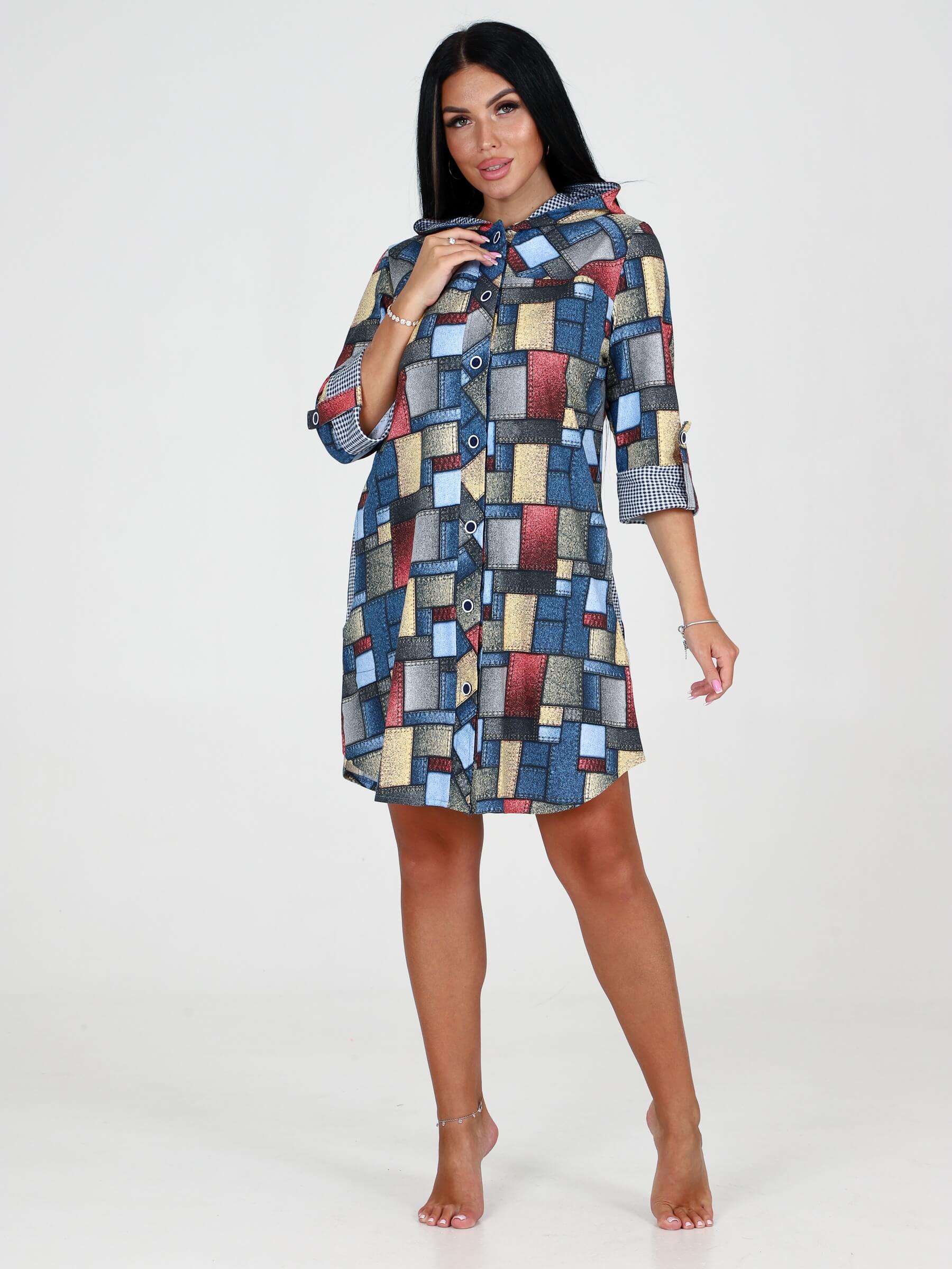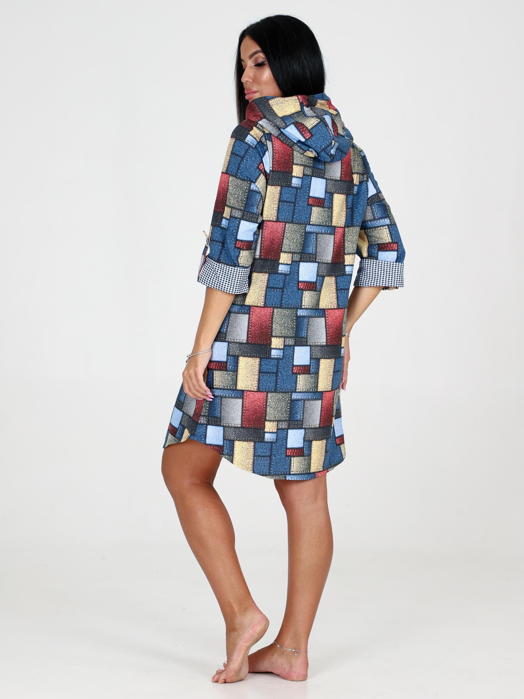 Трикотажная туника ТК-342 / Заплатки джинс больших размеров с капюшоном, слегка приталенный крой, придаст Вашему образу женственности, скроет недостатки фигуры и при этом не стесняет движений. Туника на пуговицах, с двойным капюшоном. Внутренняя подкладка капюшона, манжеты рукавов и мешковина карманов выполнены из отделочной ткани. К манжетам пришиты паты. Низ женской трикотажной туники закруглен.