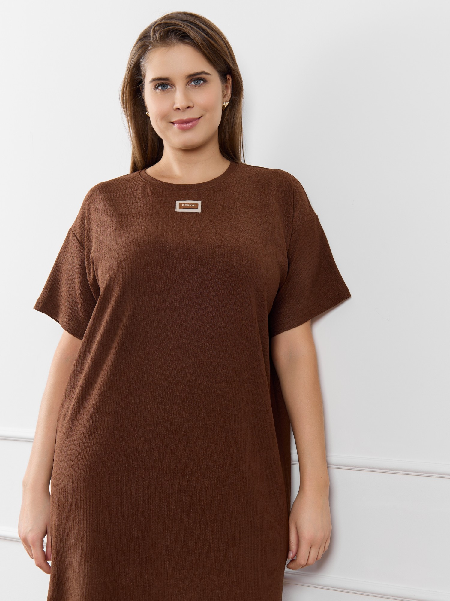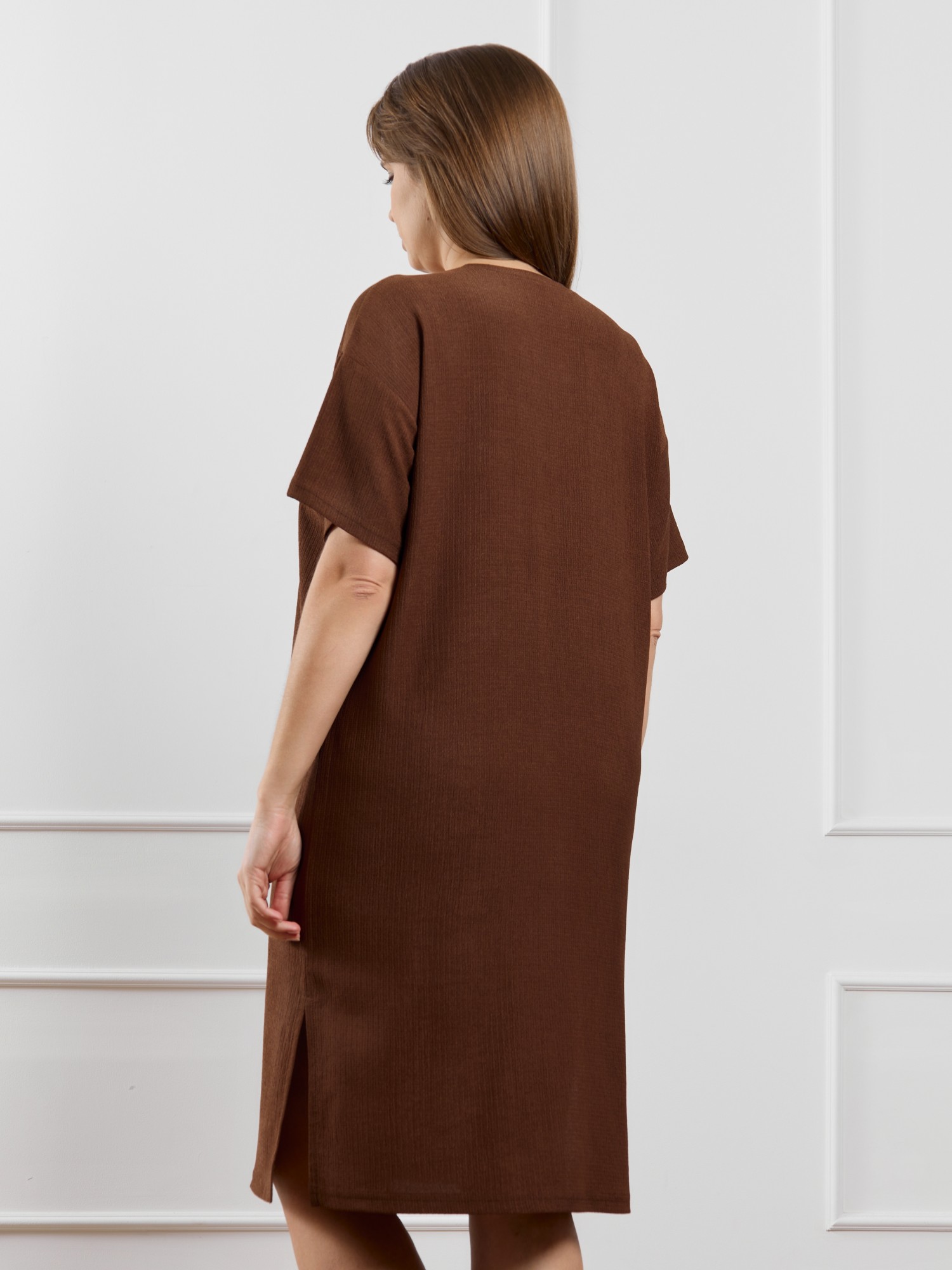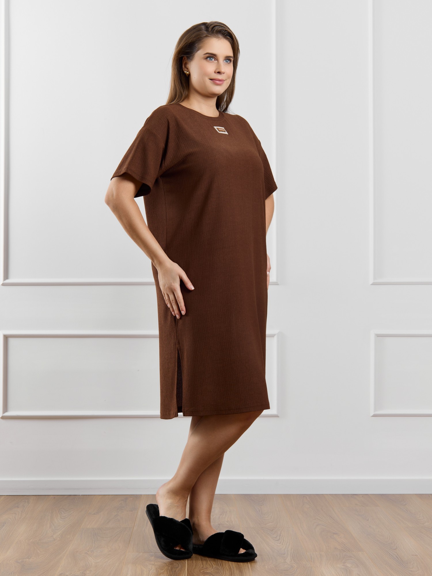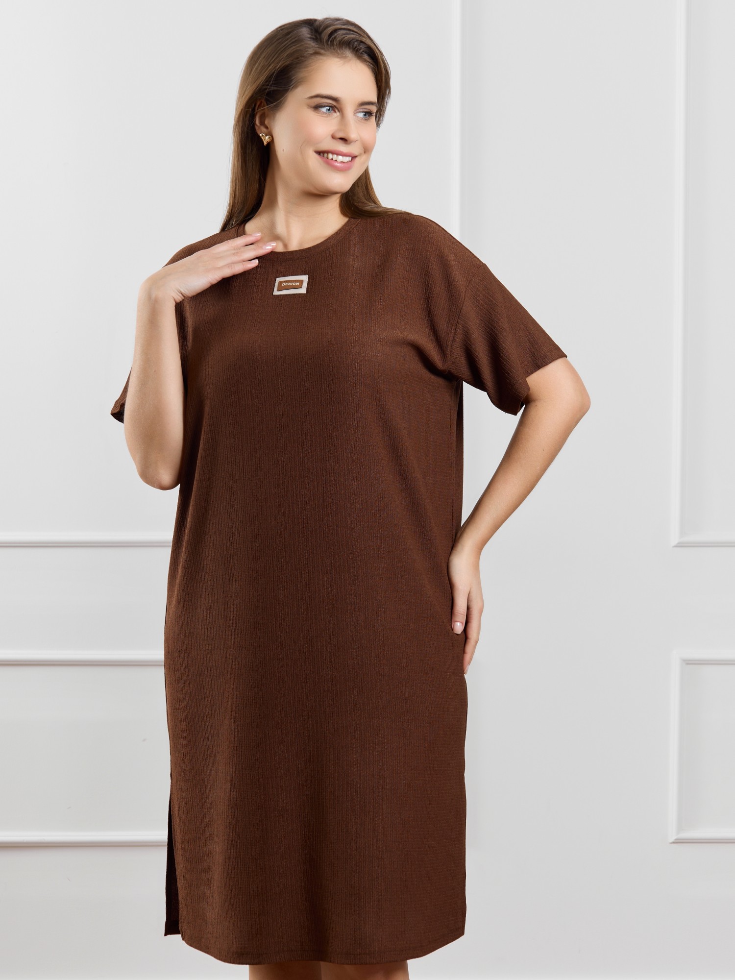 Туника женская из гладкокрашенного трикотажного полотна «бурумчук», прямого силуэта, с короткими втачными рукавами, горловиной овальной формы, обработанной втачной планкой, с разрезами в боковых швах. По центру полочки ниже горловины - настрочен декоративный элемент-нашивка.