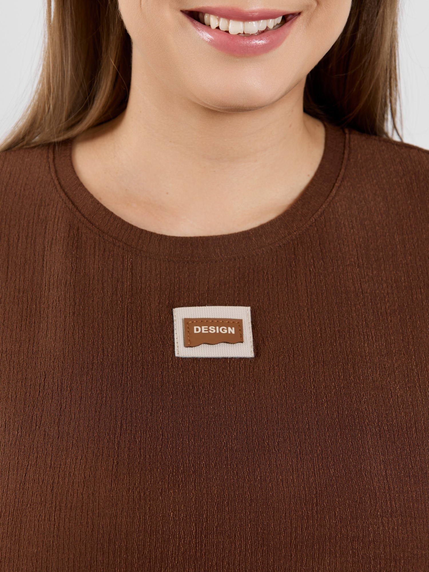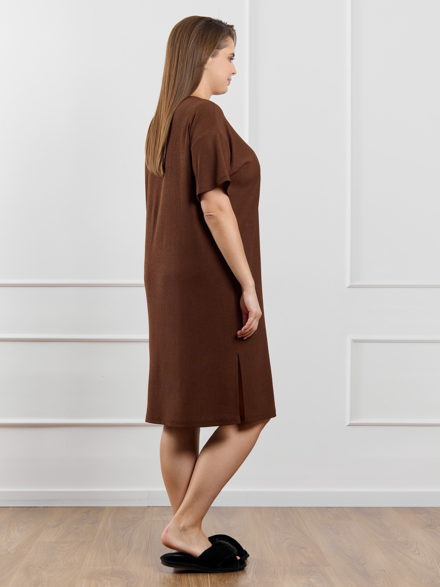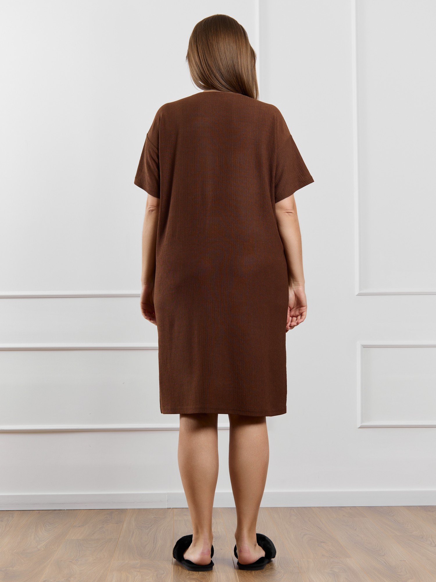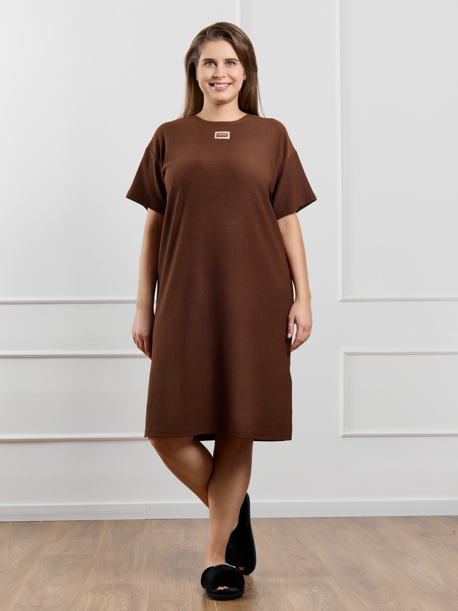 Туника женская из гладкокрашенного трикотажного полотна «бурумчук», прямого силуэта, с короткими втачными рукавами, горловиной овальной формы, обработанной втачной планкой, с разрезами в боковых швах. По центру полочки ниже горловины - настрочен декоративный элемент-нашивка.