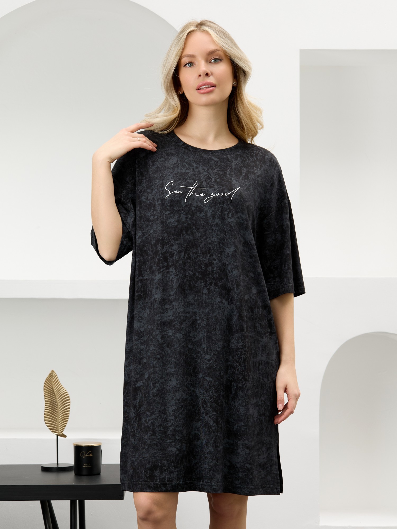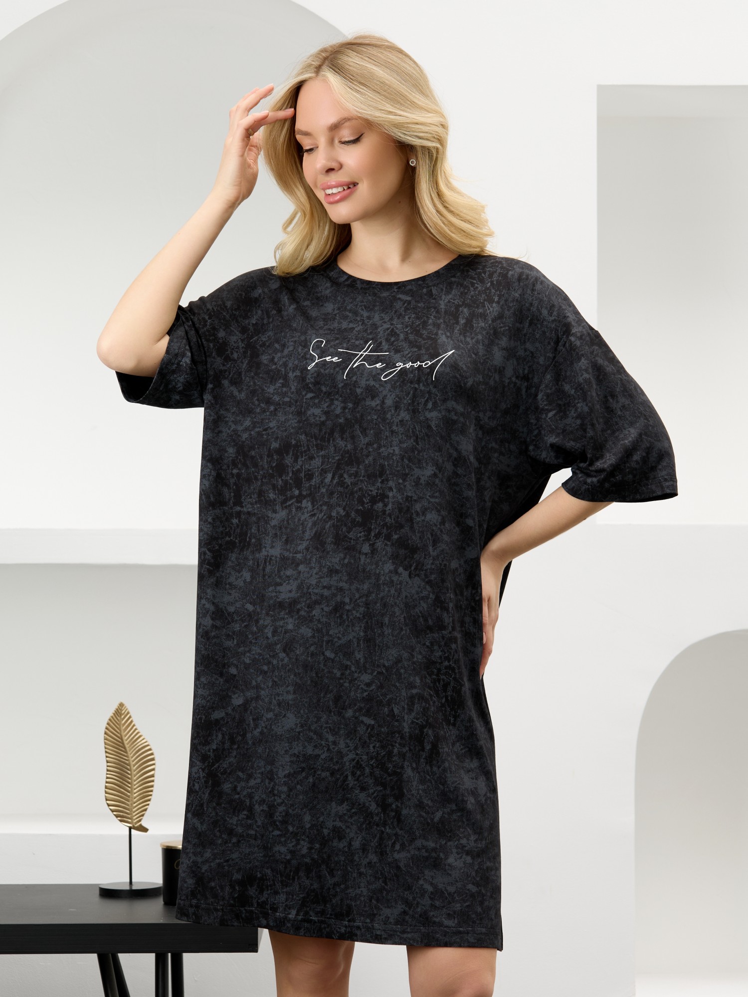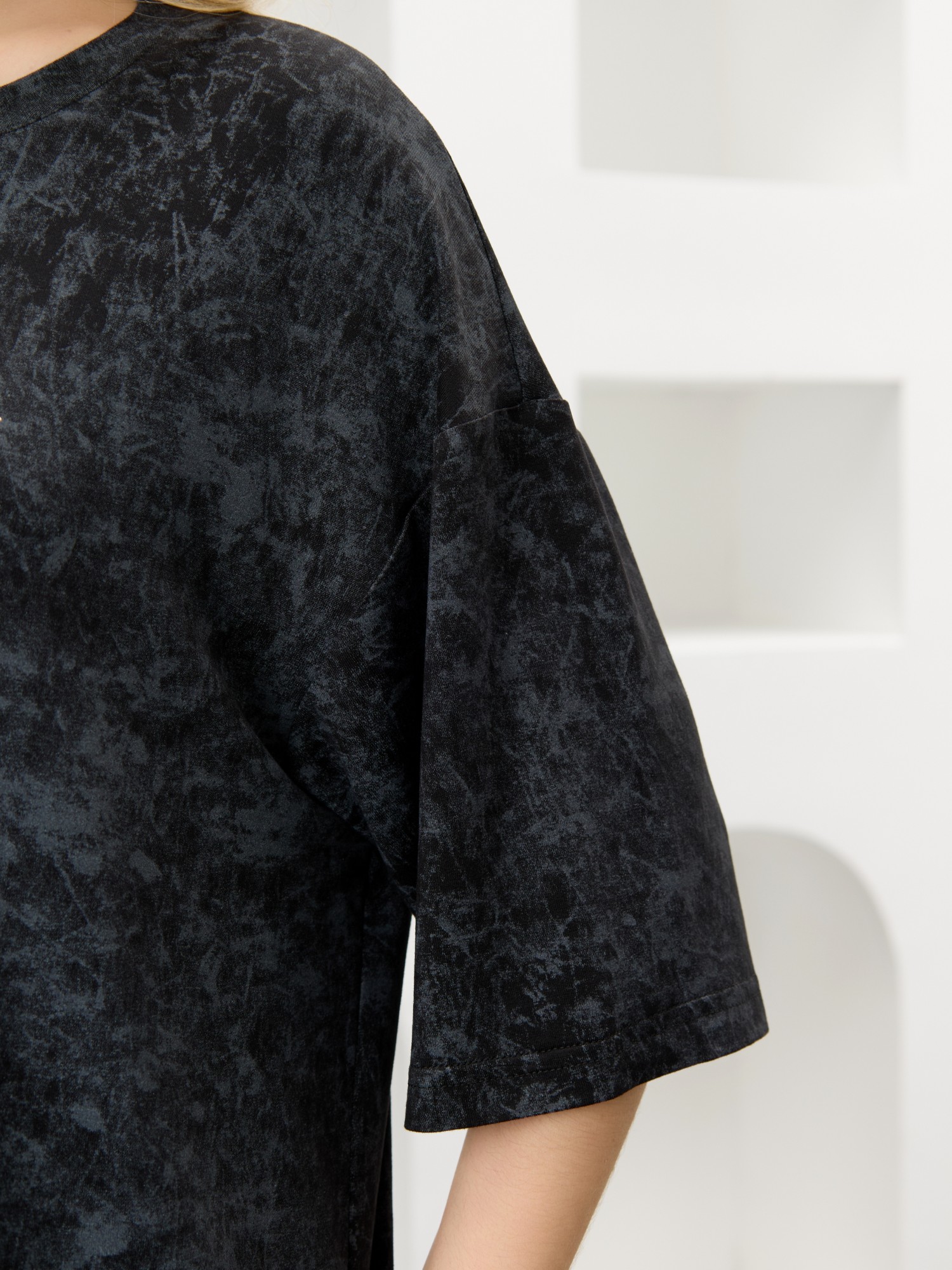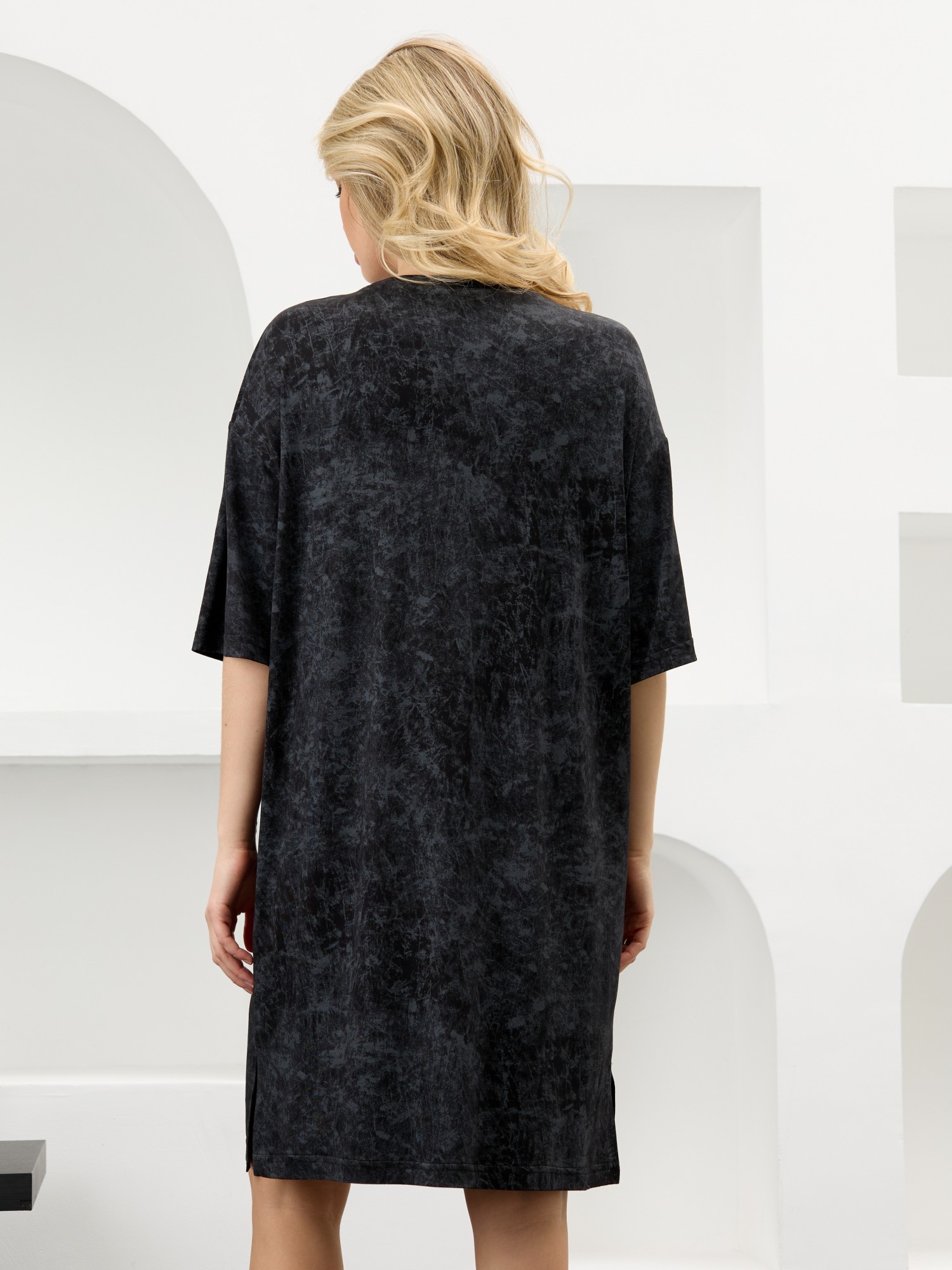 Туника женская из гладкокрашенного вискозного полотна с эффектом «варенка», свободного покроя, с втачными рукавами длиной до локтя, горловиной овальной формы, обработанной втачной планкой и разрезами в боковых швах. На полочке принт, выполненный в технике «шелкографии».
