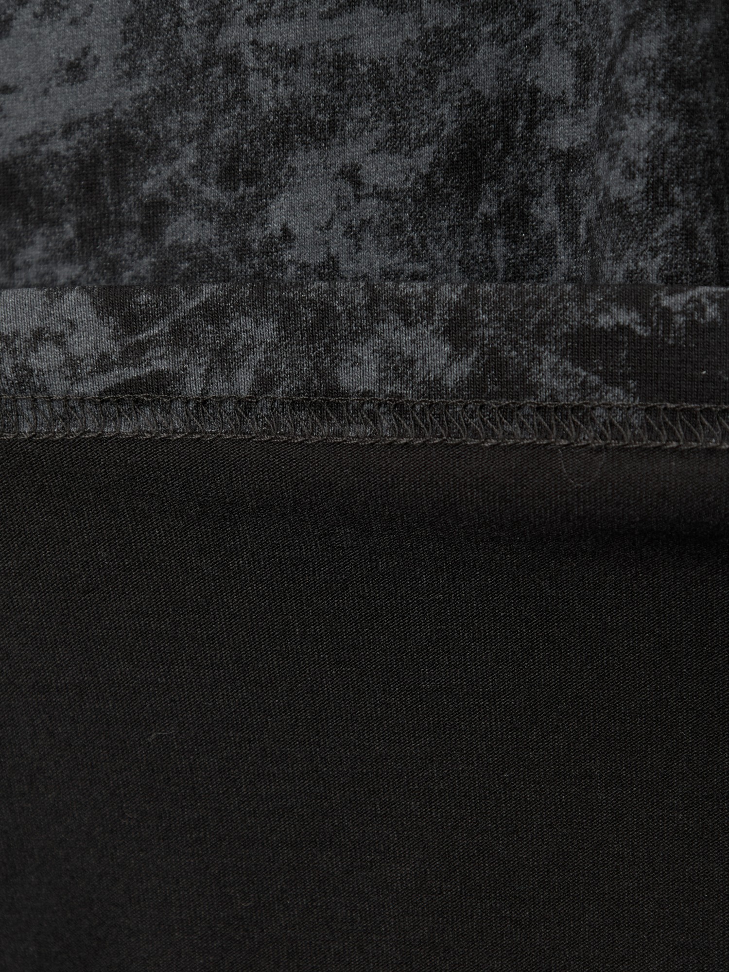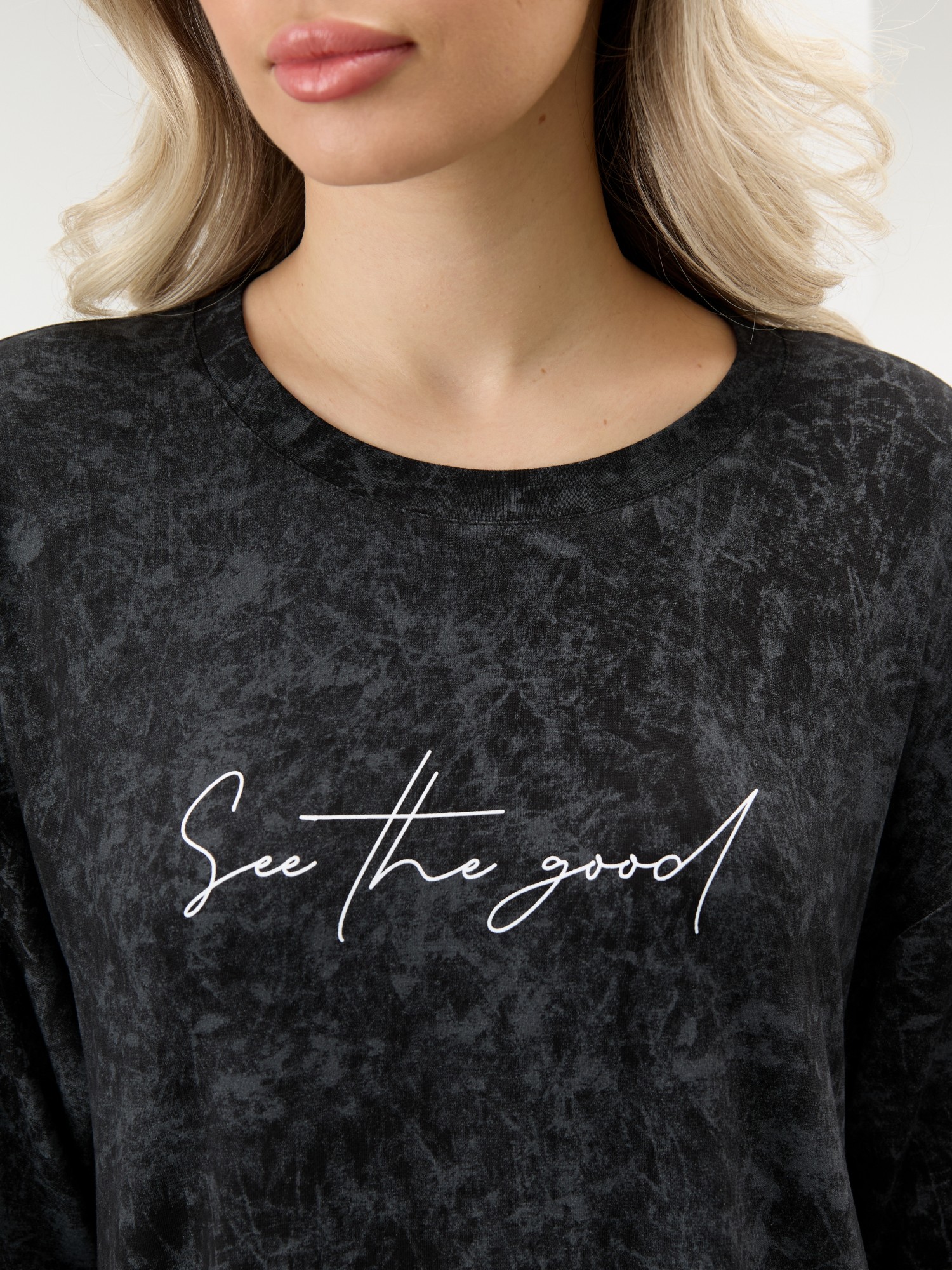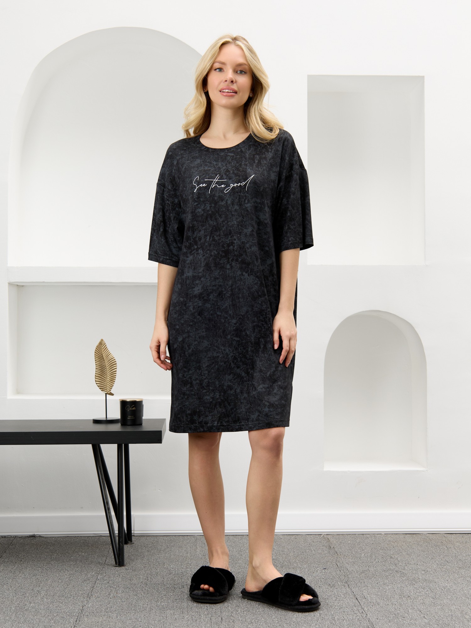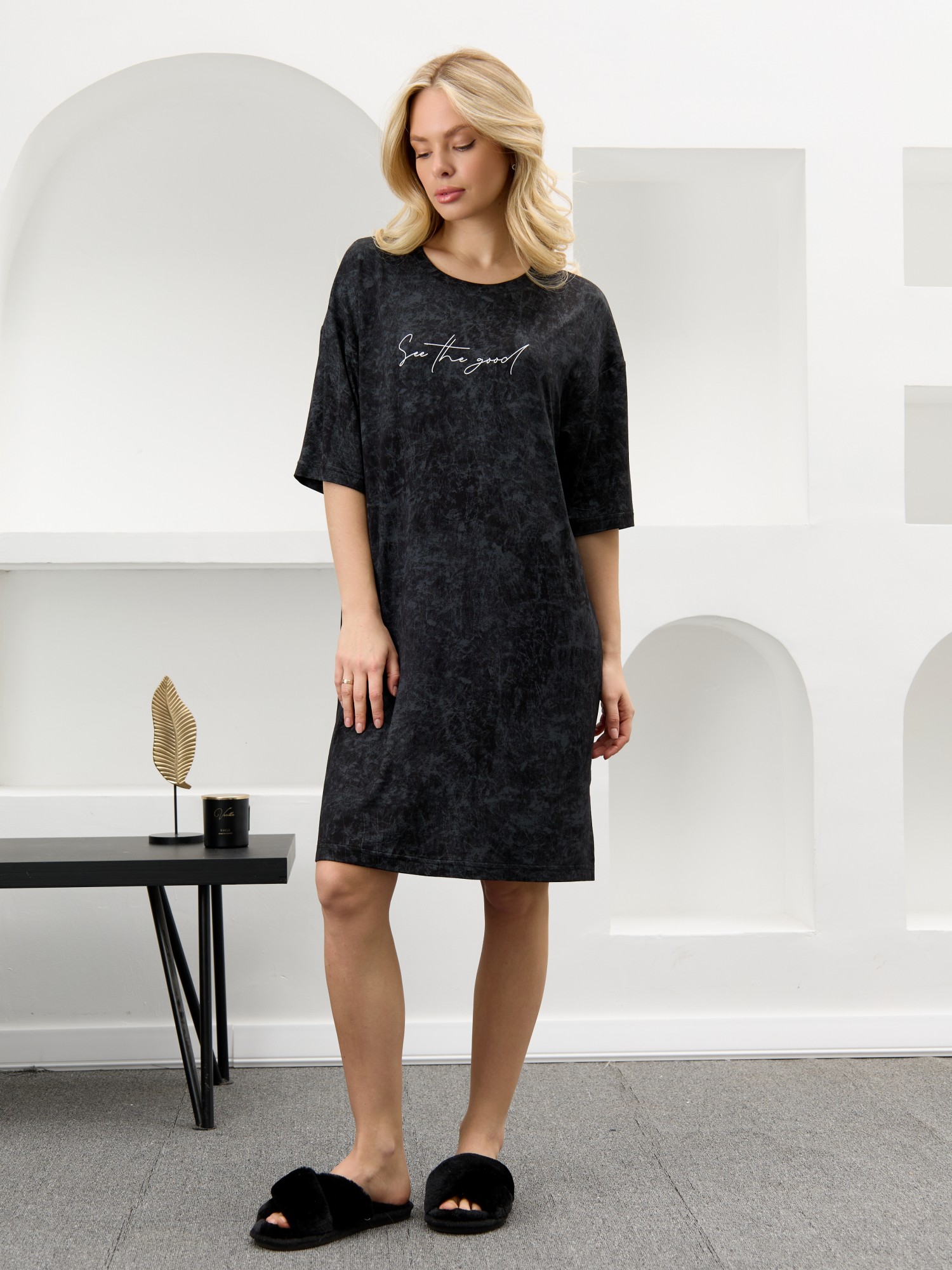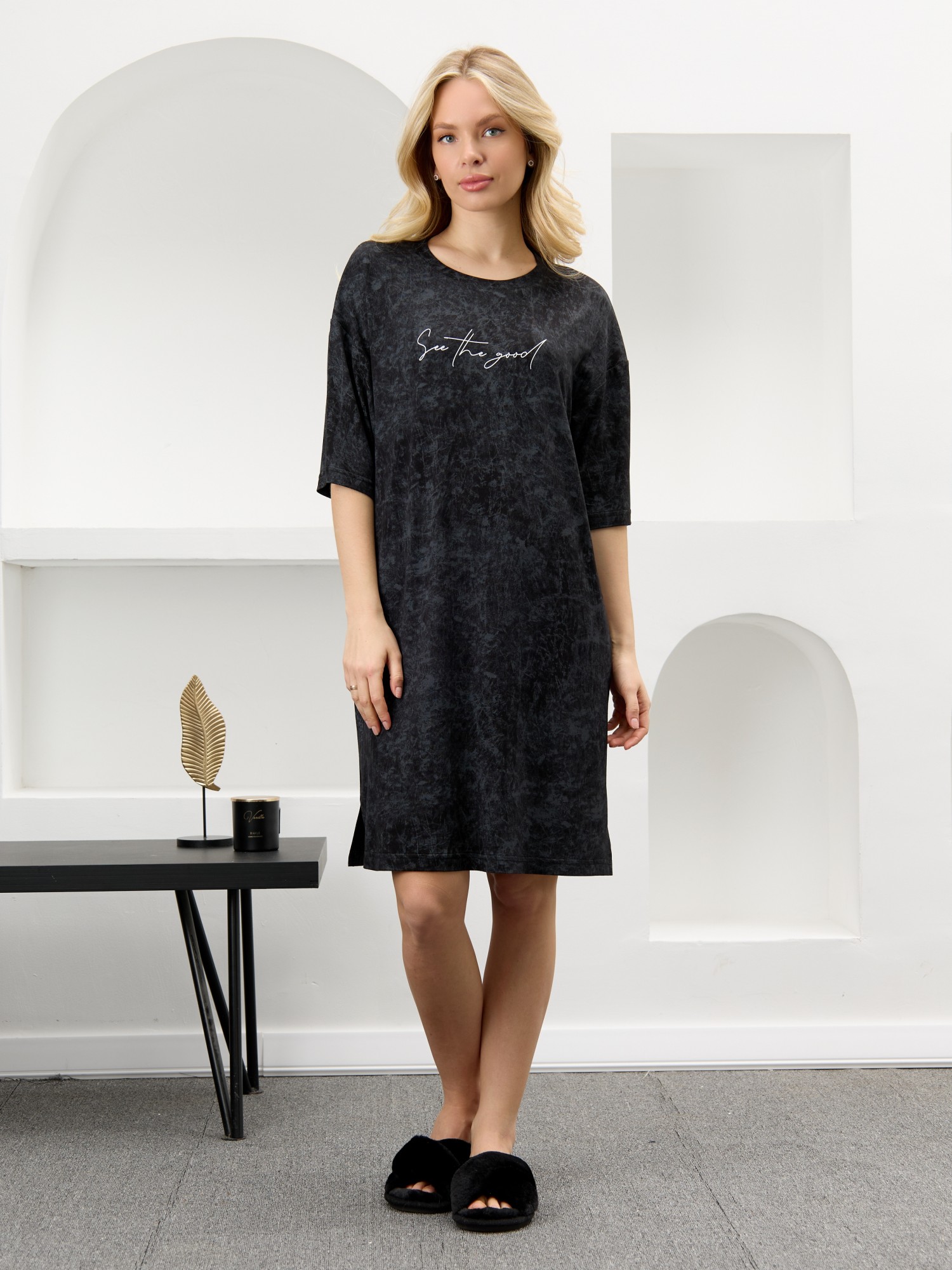 Туника женская из гладкокрашенного вискозного полотна с эффектом «варенка», свободного покроя, с втачными рукавами длиной до локтя, горловиной овальной формы, обработанной втачной планкой и разрезами в боковых швах. На полочке принт, выполненный в технике «шелкографии».