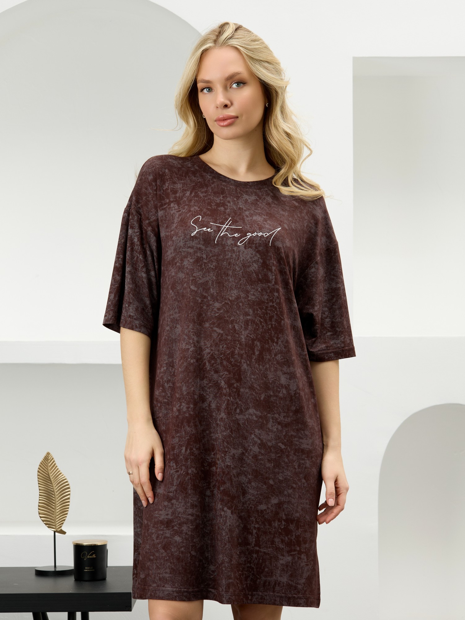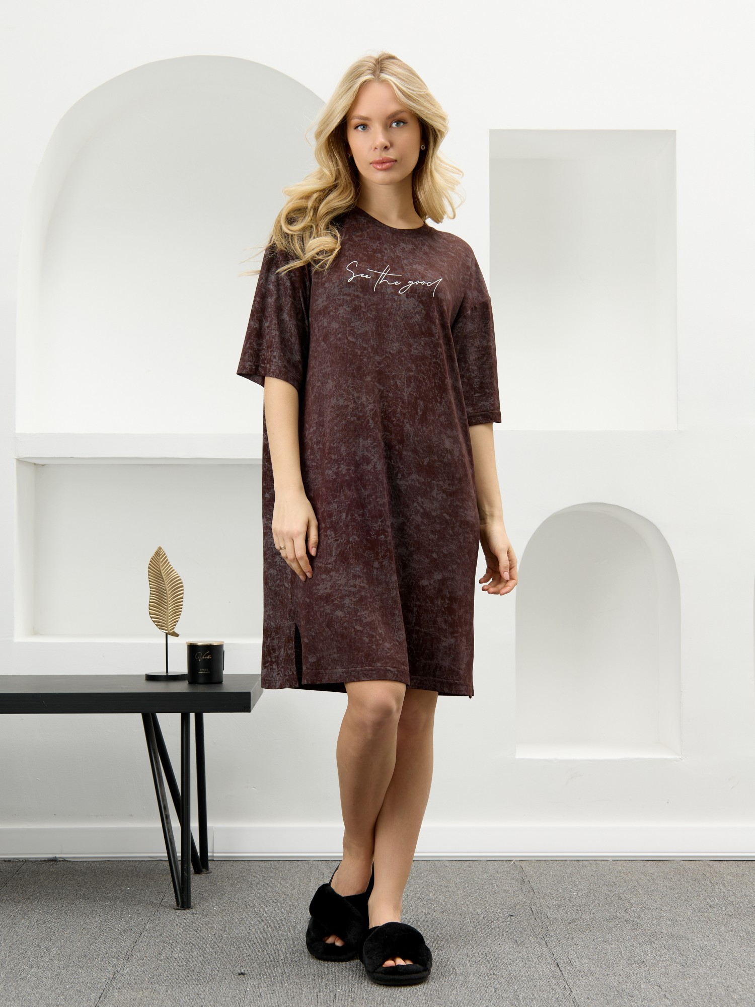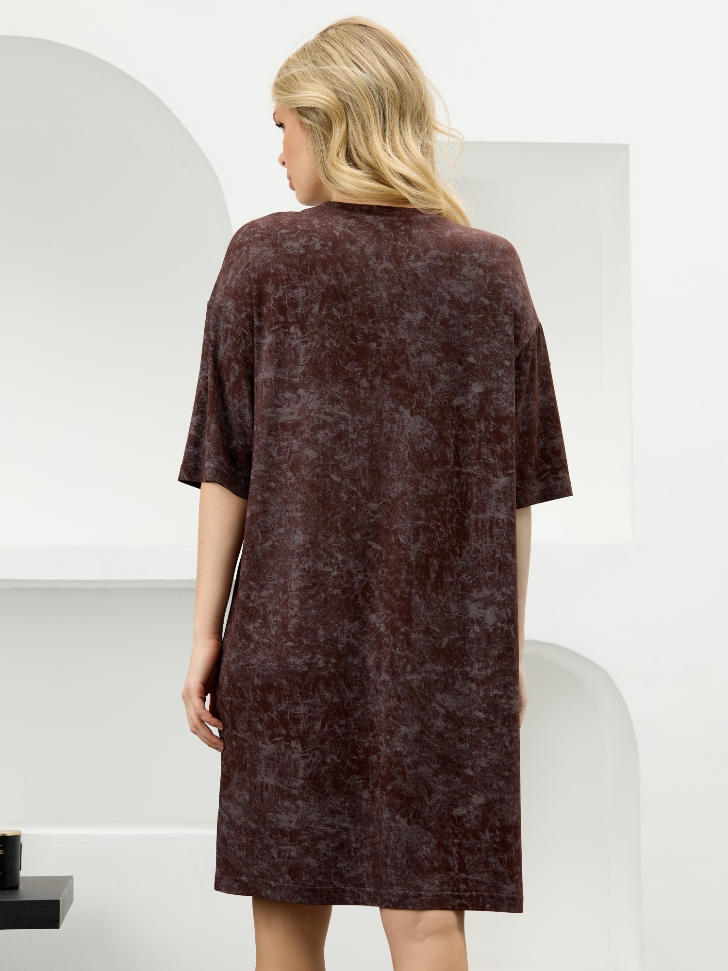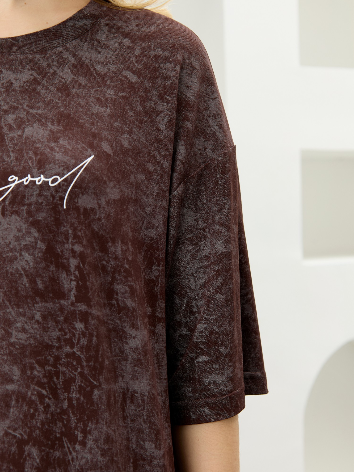 Туника женская из гладкокрашенного вискозного полотна с эффектом «варенка», свободного покроя, с втачными рукавами длиной до локтя, горловиной овальной формы, обработанной втачной планкой и разрезами в боковых швах. На полочке принт, выполненный в технике «шелкографии».