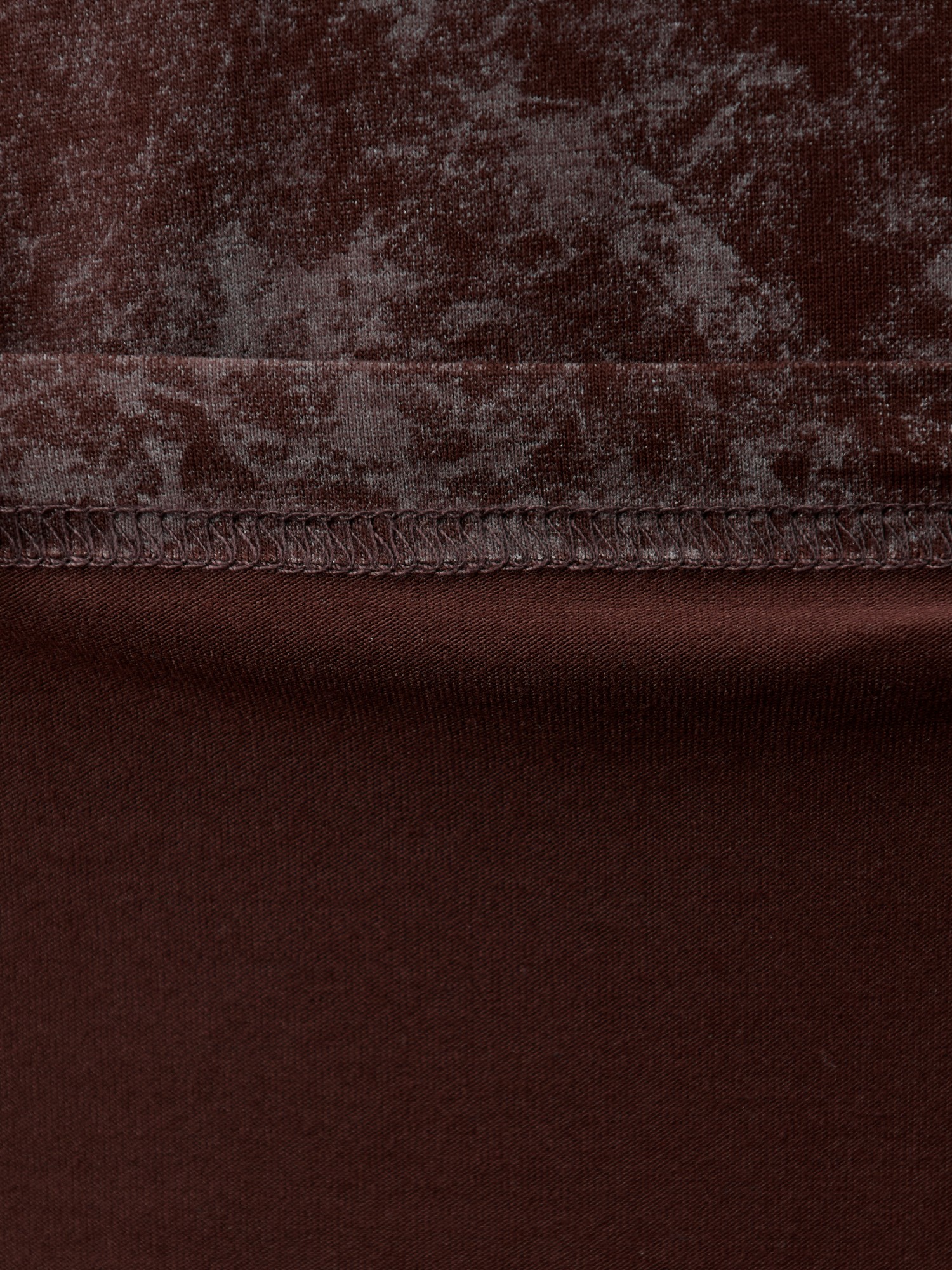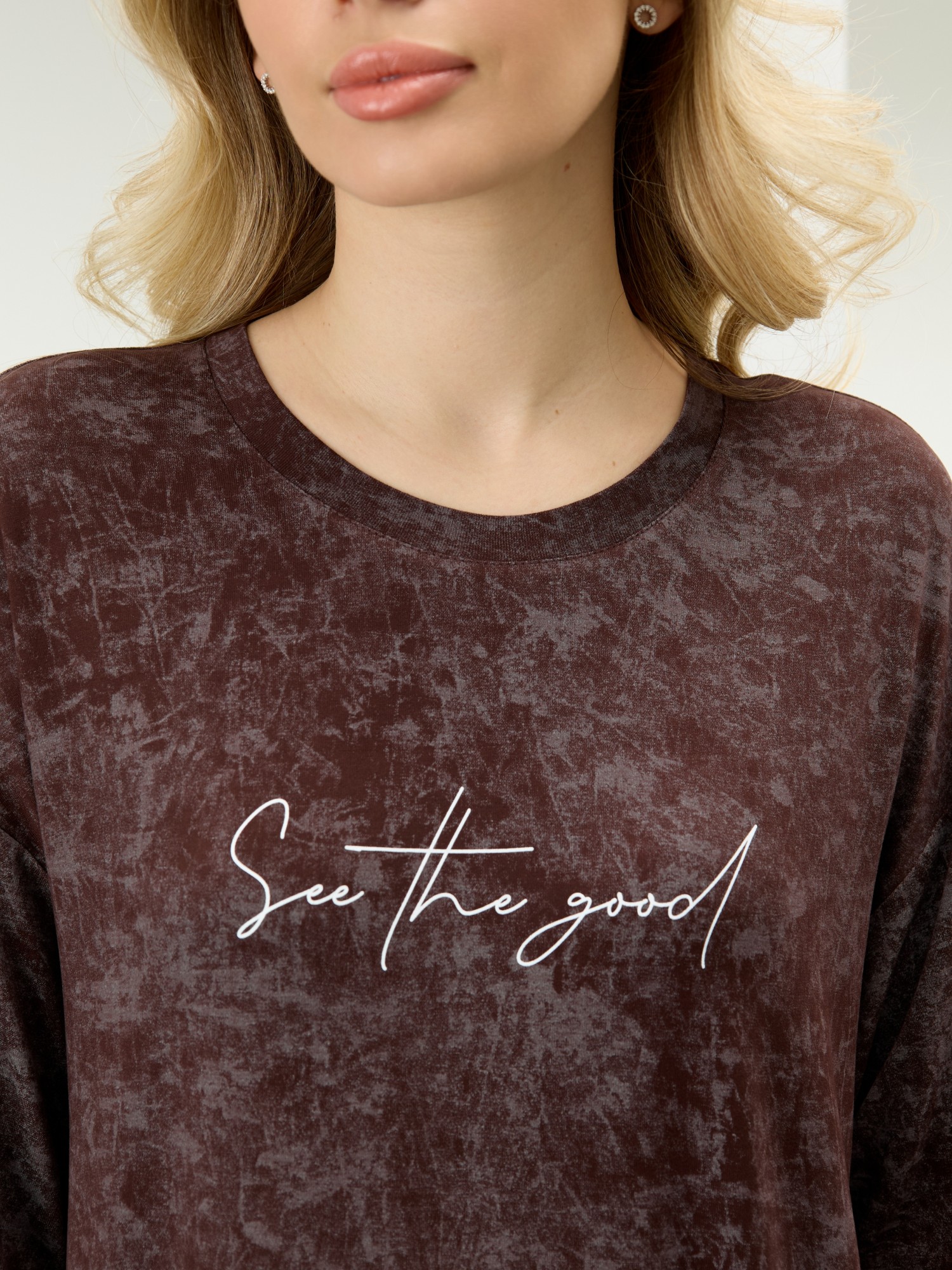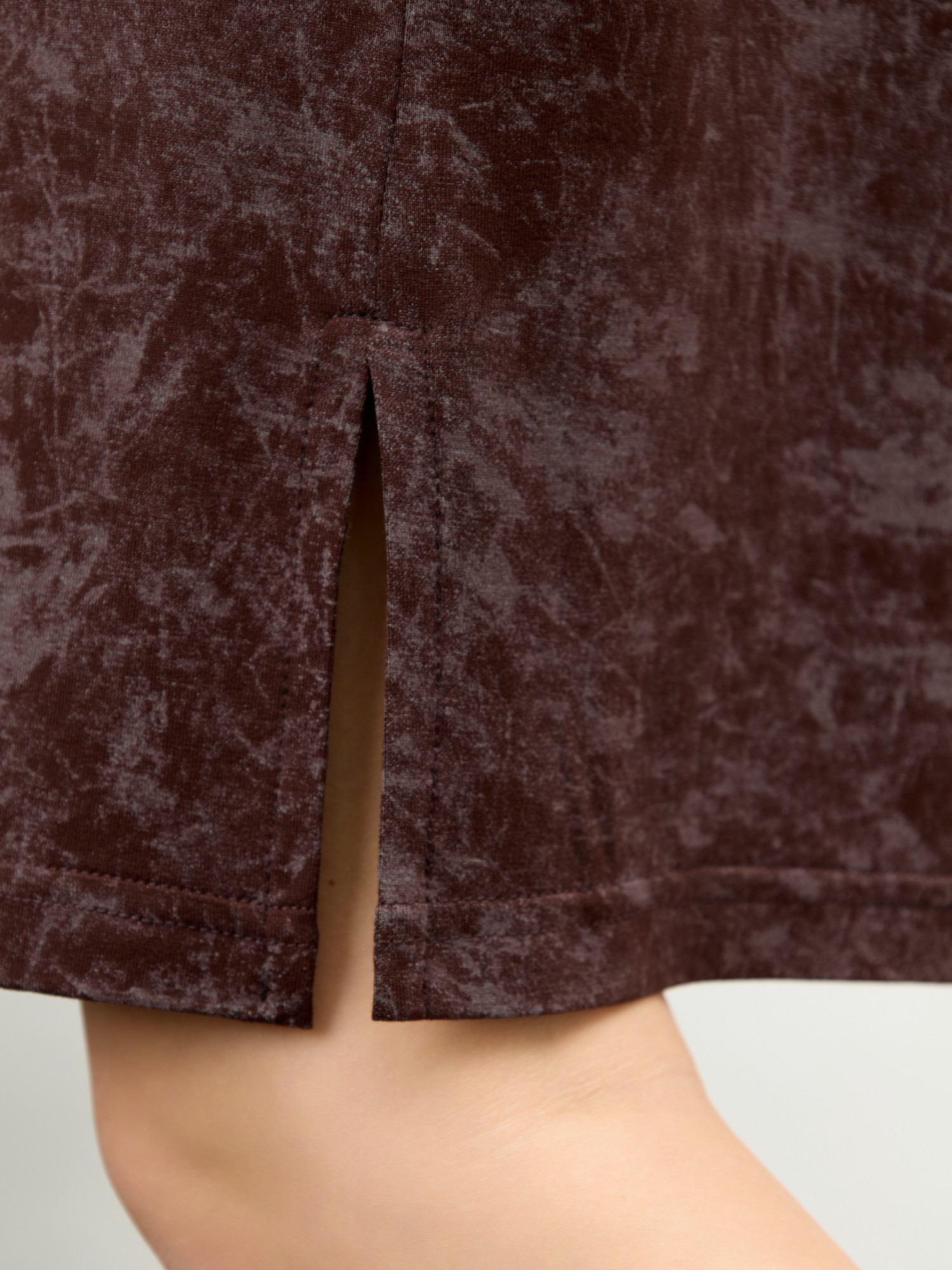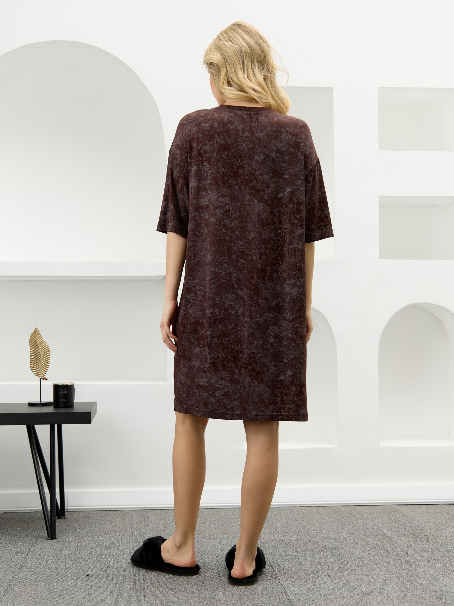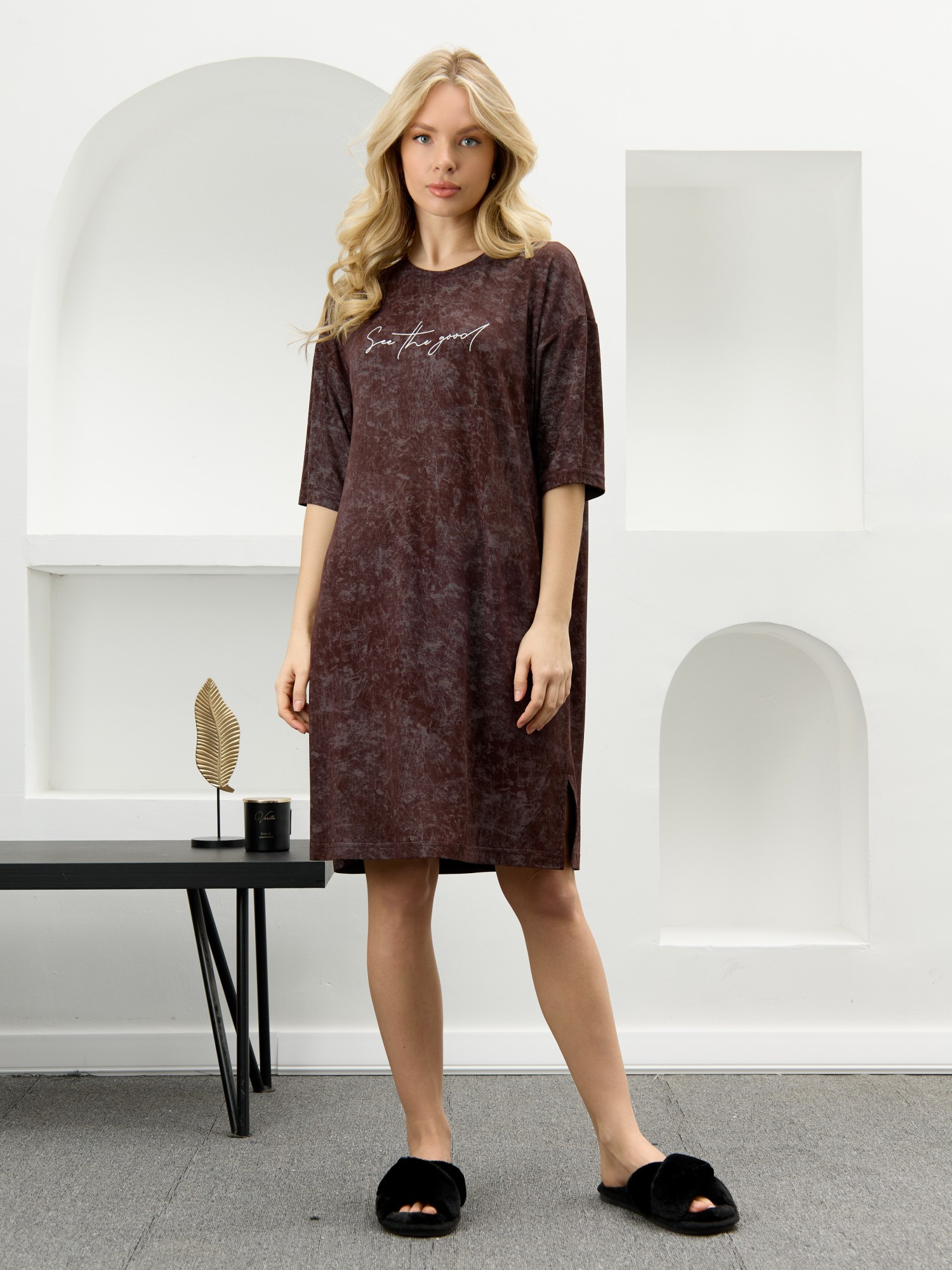 Туника женская из гладкокрашенного вискозного полотна с эффектом «варенка», свободного покроя, с втачными рукавами длиной до локтя, горловиной овальной формы, обработанной втачной планкой и разрезами в боковых швах. На полочке принт, выполненный в технике «шелкографии».