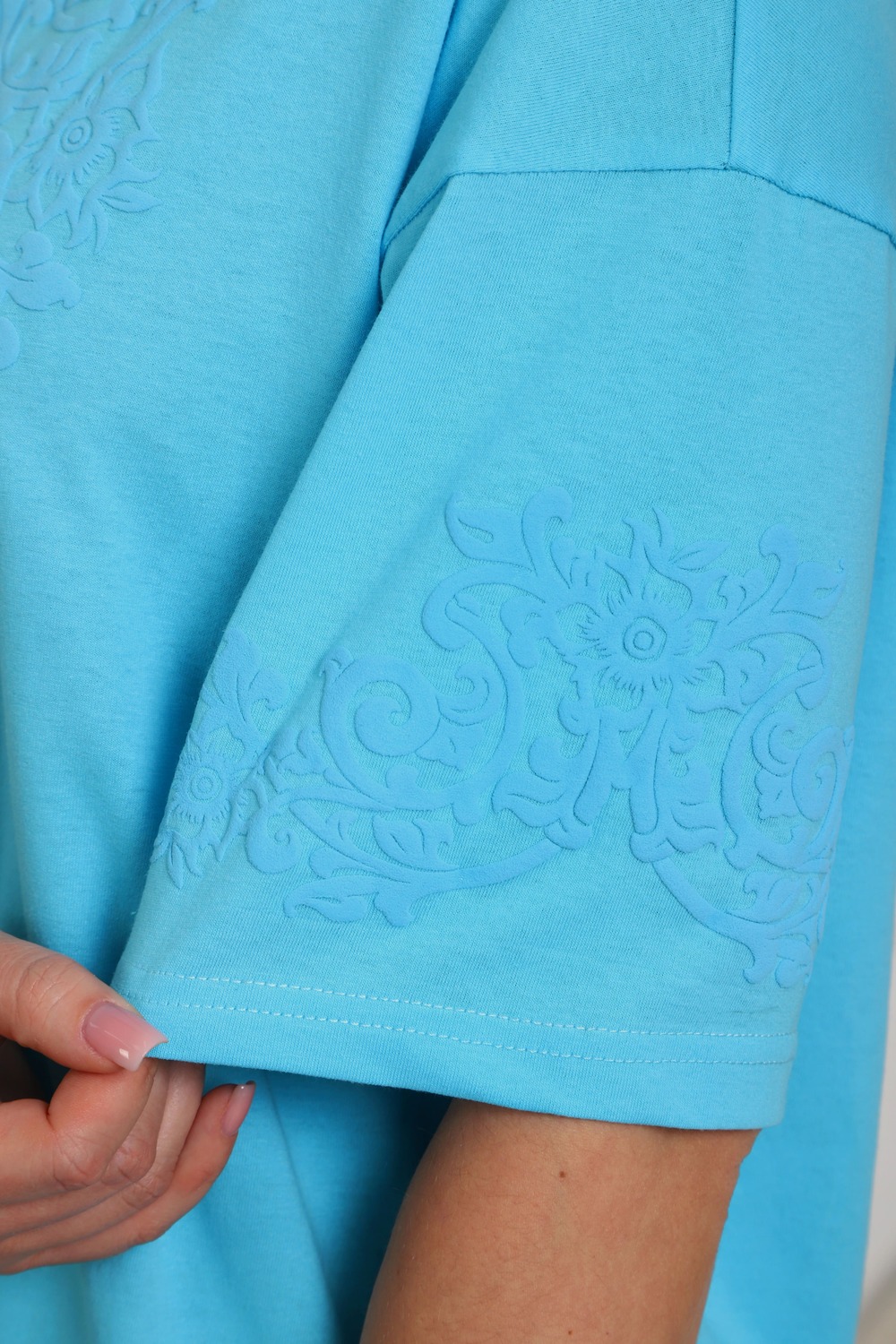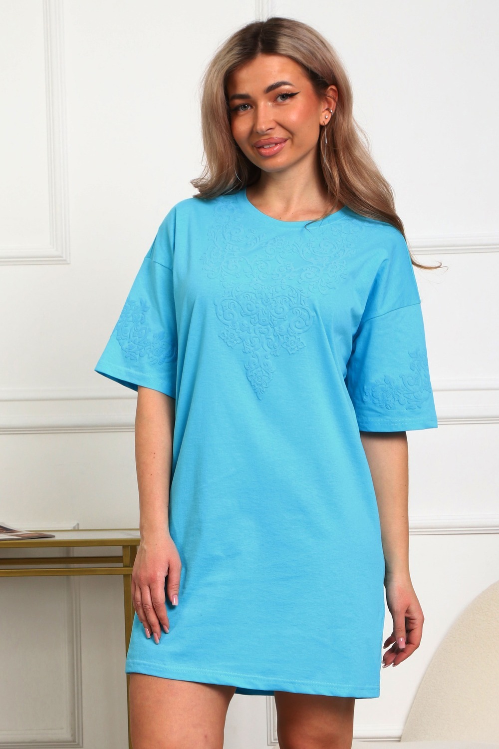 Туника женская прямого силуэта. Низ изделия прямой. Длинна выше колена, плечо спущенное, рукав короткий. Горловина круглой формы. Принт орнамент (шелкография пуф) располагается по центру переда и на рукавах.
