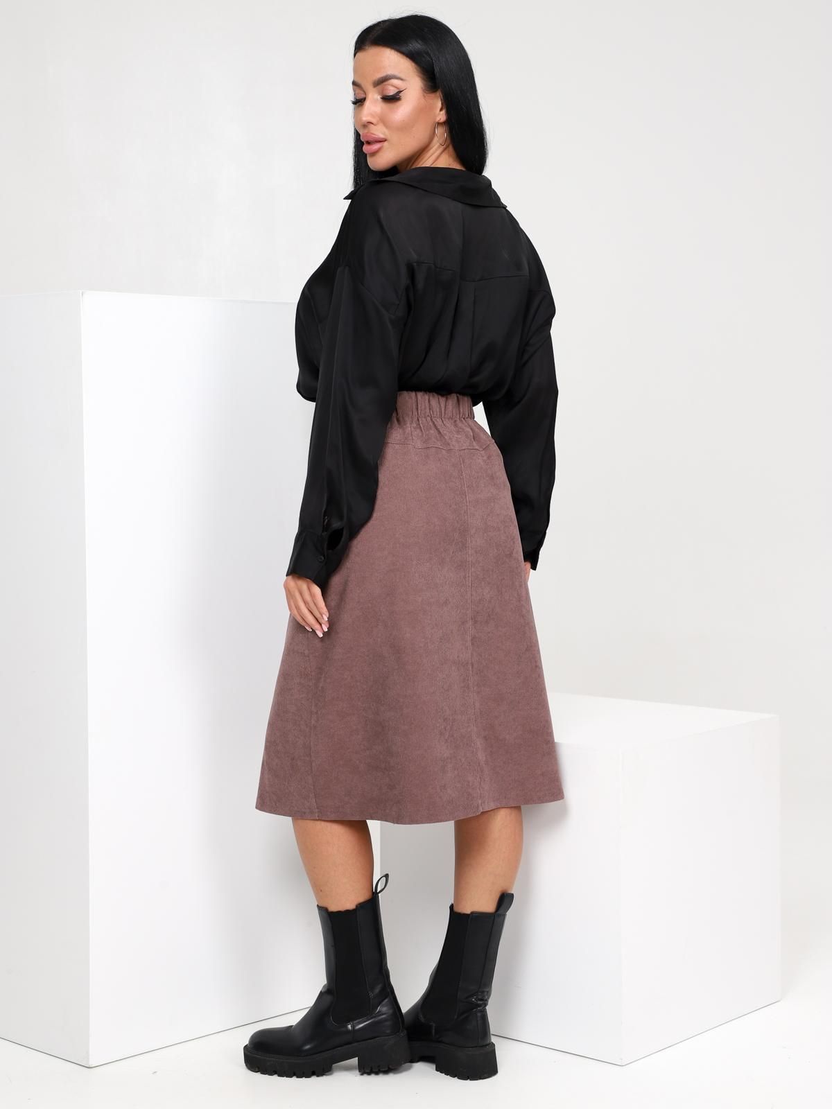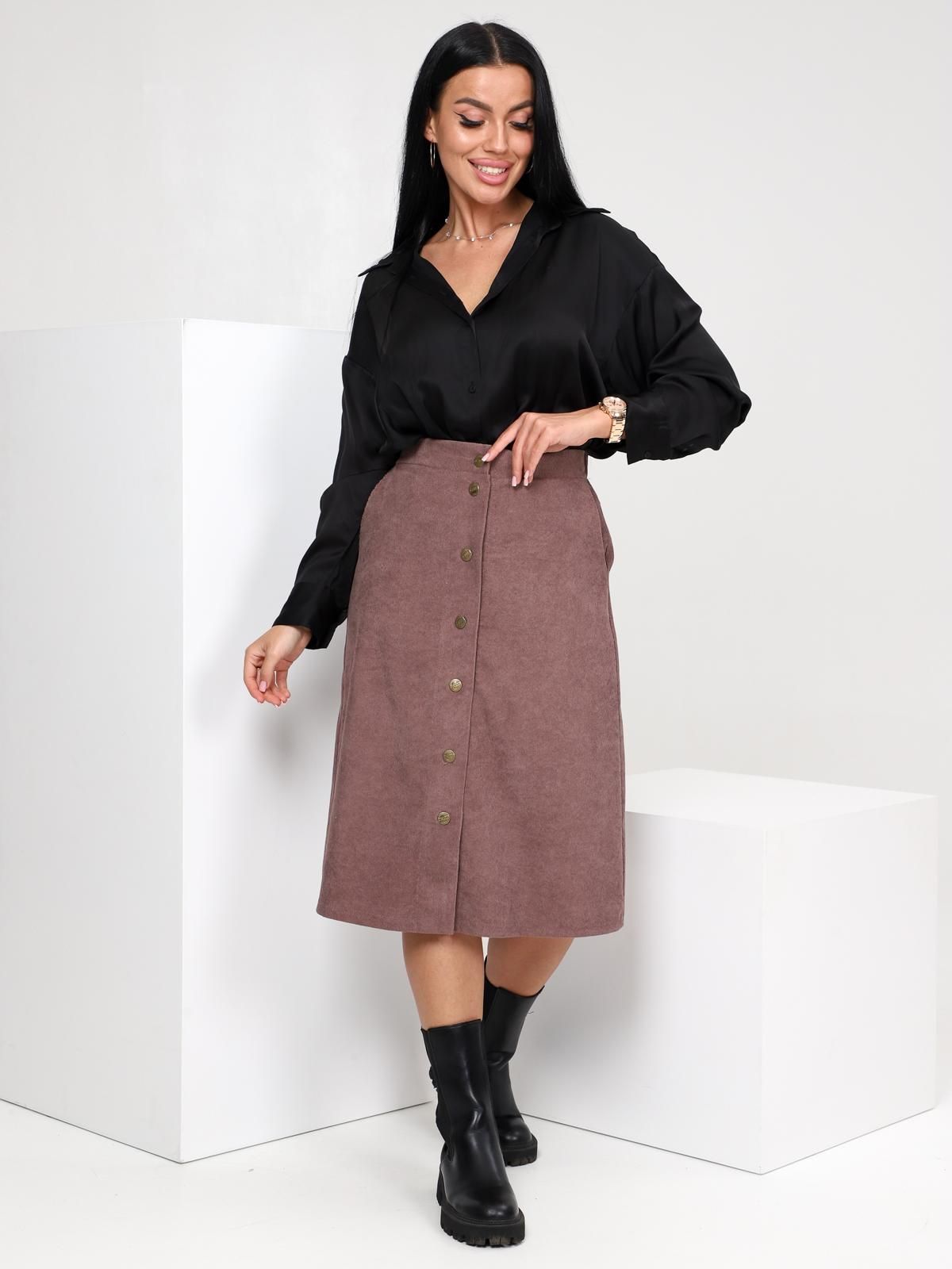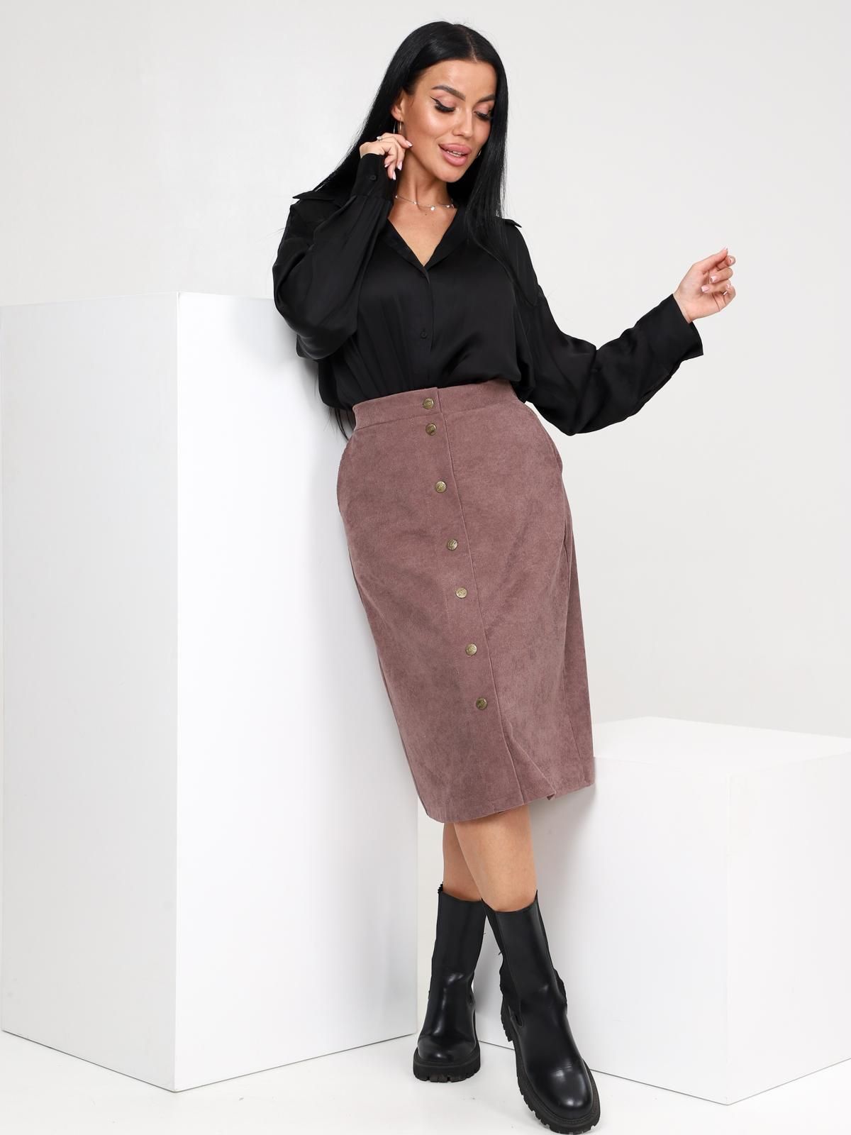 Юбка женская Джислин А-силуэта, длиной чуть ниже колена, с центральной застёжкой на пуговицы и петли на передней половинке, с притачным поясом, на задней половинке пояс снабжён эластичной тесьмой, а ниже пояса располагается небольшая кокетка, с карманами в боковом шве, с ровным низом, подшитым вподгибку.