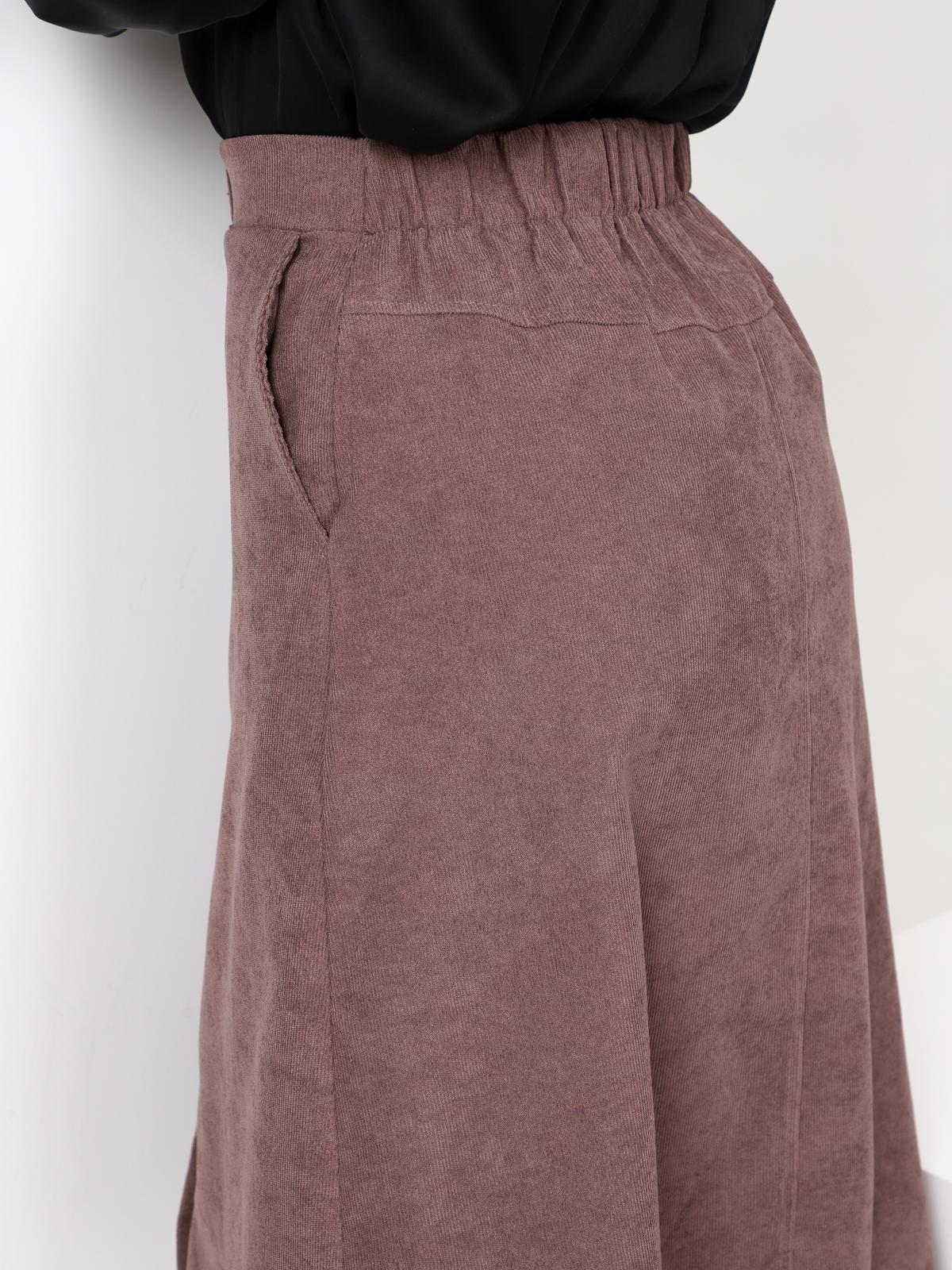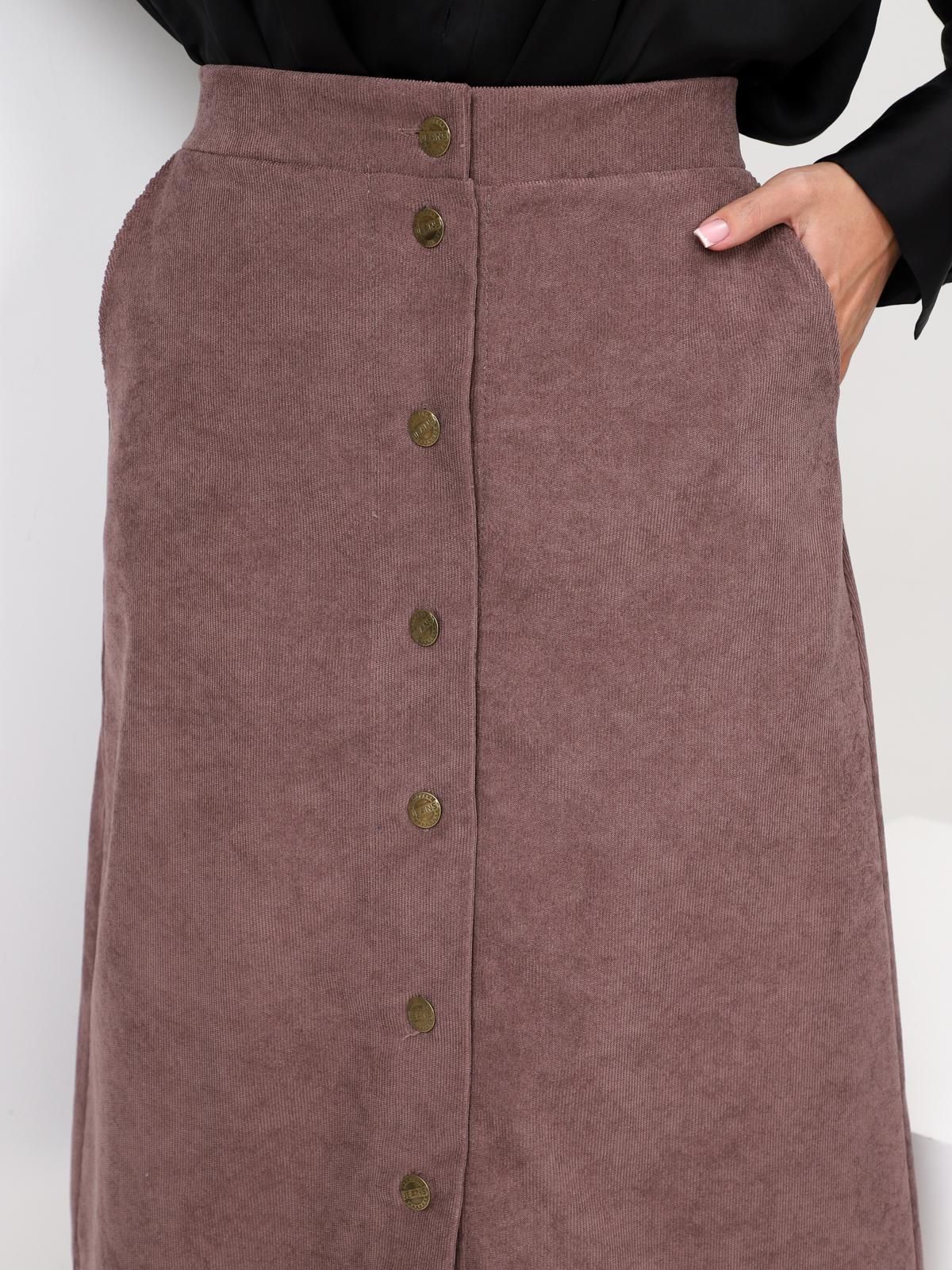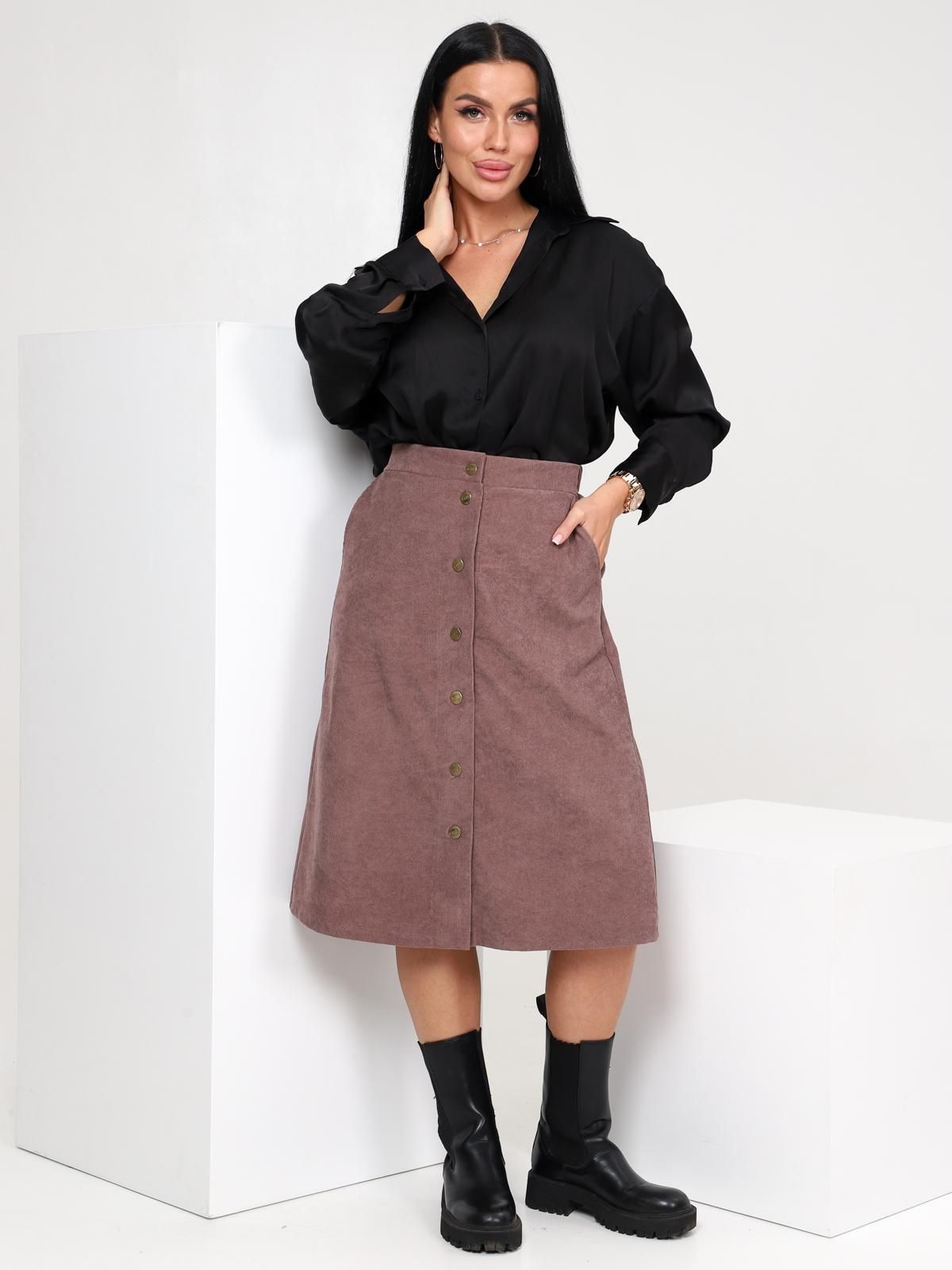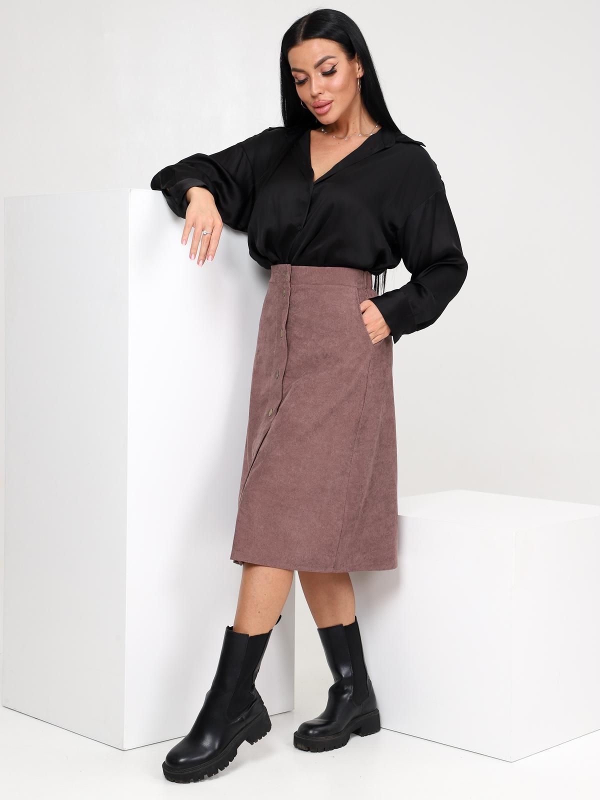 Юбка женская Джислин А-силуэта, длиной чуть ниже колена, с центральной застёжкой на пуговицы и петли на передней половинке, с притачным поясом, на задней половинке пояс снабжён эластичной тесьмой, а ниже пояса располагается небольшая кокетка, с карманами в боковом шве, с ровным низом, подшитым вподгибку.