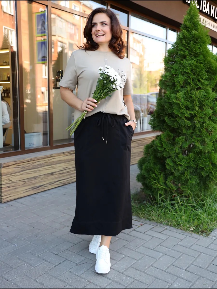 Стильная и комфортная женская летняя трикотажная юбка. Прямой крой, пояс на широкой эластичной резинке. Мягкий и дышащий футер – идеальный материал для летней женской одежды. Имеются удобные карманы. Однотонный дизайн делает эту стильную женскую юбку базовой вещью, которая легко сочетается с различными элементами гардероба. Повседневная однотонная легкая универсальная юбка макси прекрасно сочетается с белыми и черными принтованными футболками. Юбка на резинке не только выглядит красиво, но и удобна для носки. Она облегает фигуру, подчеркивает все ее достоинства. В этой юбке вы будете чувствовать себя свободно, легко и уверенно.